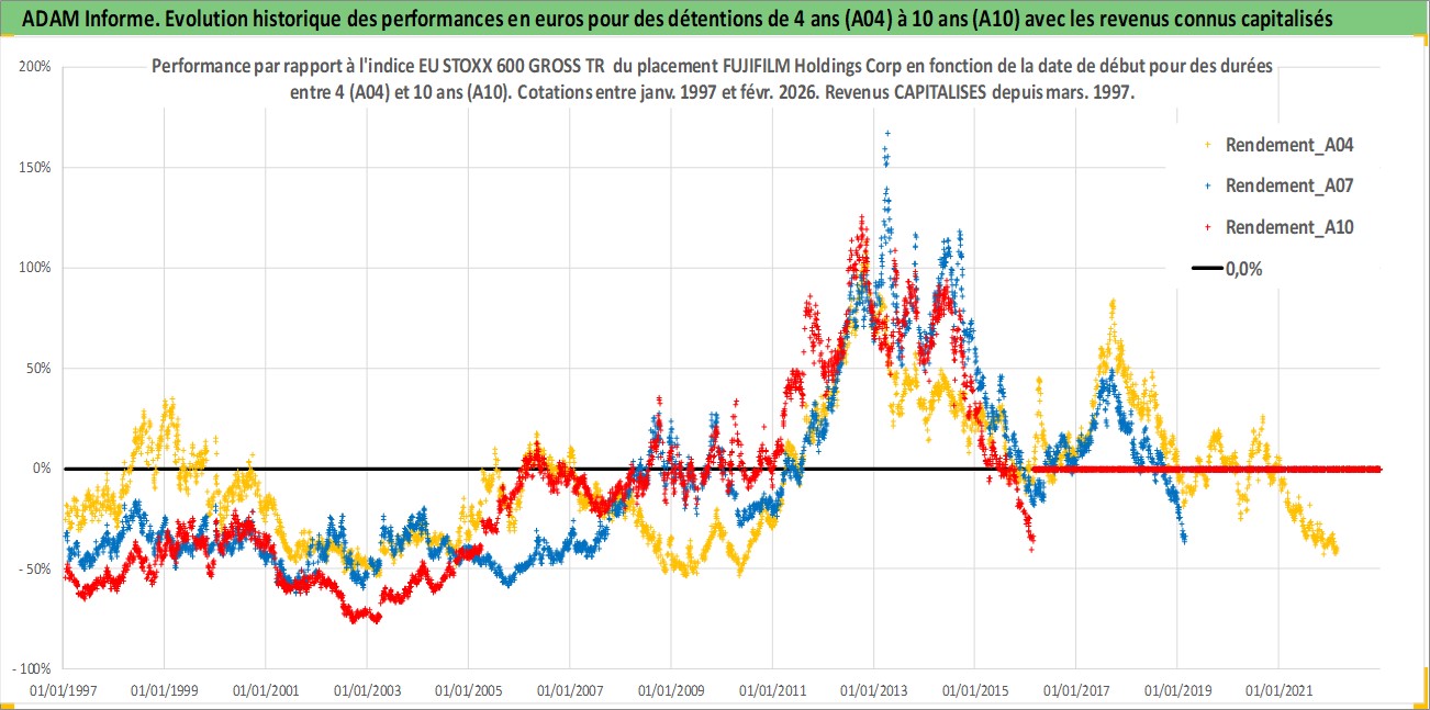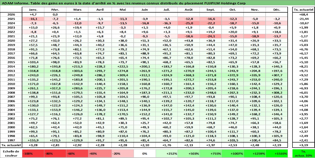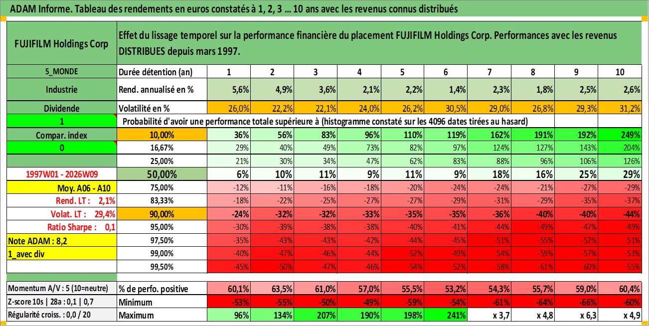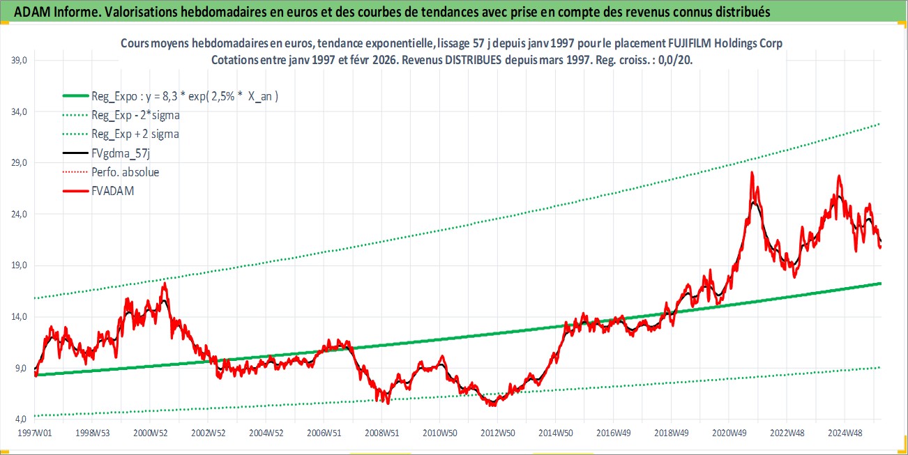 Site dédié aux investisseursPage dédiée sur site financeAnalyse des valorisations hebdomadaires de l'action FUJIFILM Holdings Corp. Cet actif est cote en JPY. Les valorisations sont en contrevaleur EURO et couvrent les semaines 1997W01 a 2026W09. Les revenus de cet actif financier sont pris en compte depuis la semaine 1997W13. La note globale ESG de cet actif est estimee a 12.0 (apres rebasage entre 0 et 20).