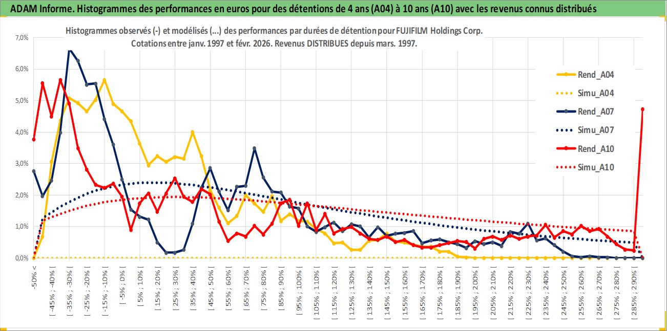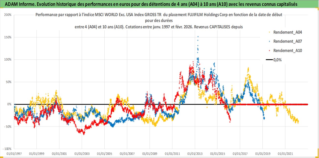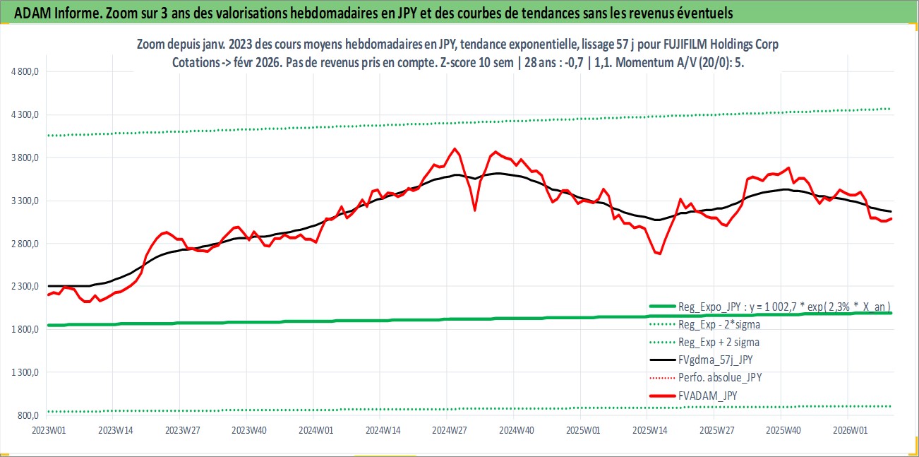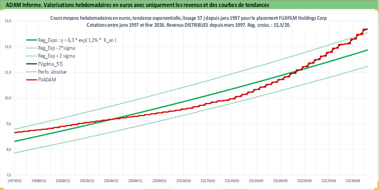 Site dédié aux investisseursPage dédiée sur site financeAnalyse des valorisations hebdomadaires de l'action FUJIFILM Holdings Corp. Cet actif est cote en JPY. Les valorisations sont en contrevaleur EURO et couvrent les semaines 1997W01 a 2026W09. Les revenus de cet actif financier sont pris en compte depuis la semaine 1997W13. La note globale ESG de cet actif est estimee a 12.0 (apres rebasage entre 0 et 20).