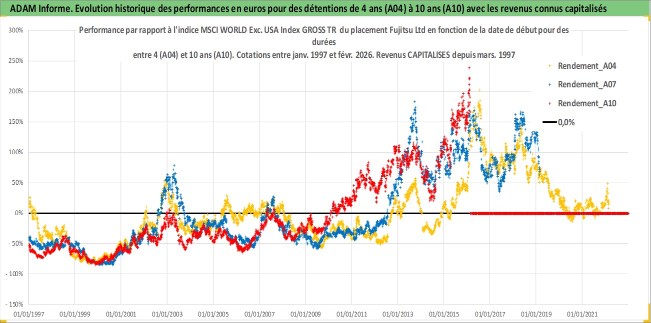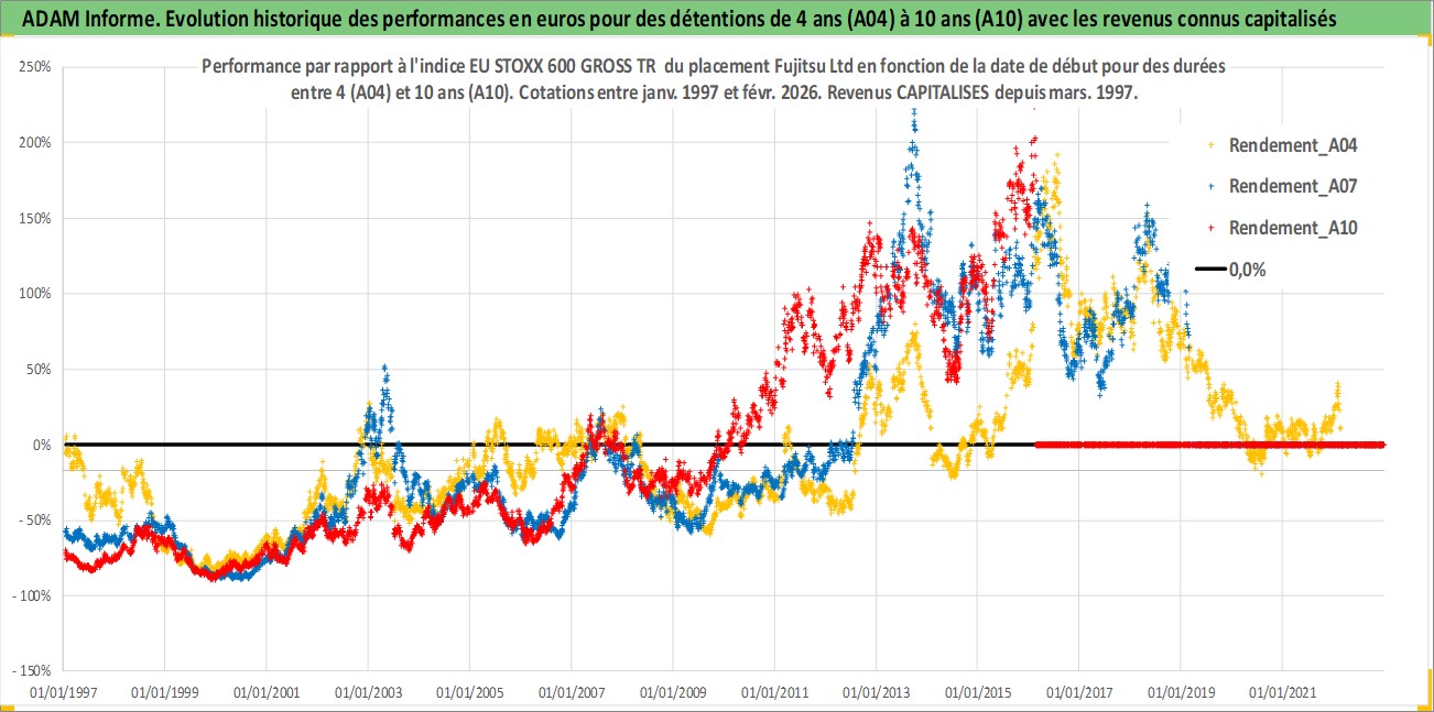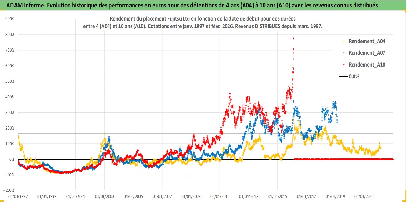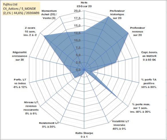 Site dédié aux investisseursPage dédiée sur site financeAnalyse des valorisations hebdomadaires de l'action Fujitsu Ltd. Cet actif est cote en JPY. Les valorisations sont en contrevaleur EURO et couvrent les semaines 1997W01 a 2026W09. Les revenus de cet actif financier sont pris en compte depuis la semaine 1997W13. La note globale ESG de cet actif est estimee a 13.0 (apres rebasage entre 0 et 20).