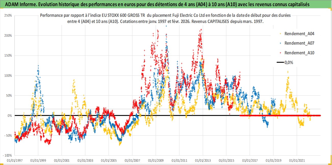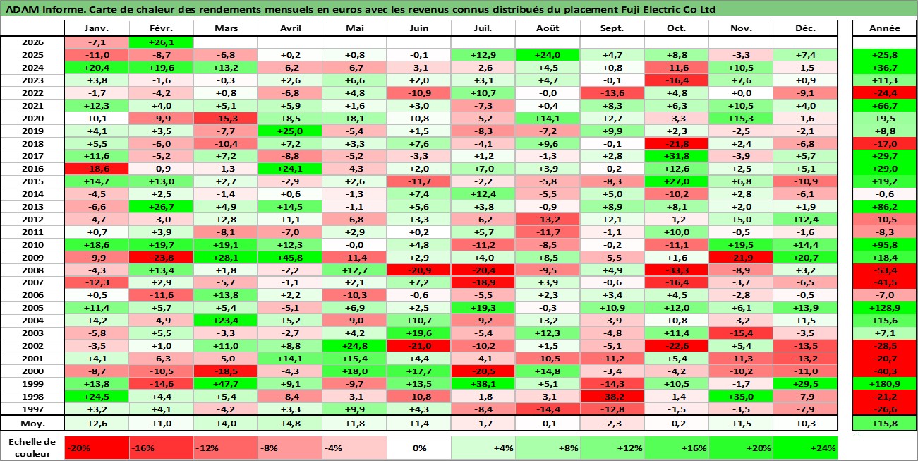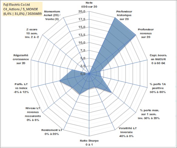 Site dédié aux investisseursPage dédiée sur site financeAnalyse des valorisations hebdomadaires de l'action Fuji Electric Co Ltd. Cet actif est cote en JPY. Les valorisations sont en contrevaleur EURO et couvrent les semaines 1997W01 a 2026W09. Les revenus de cet actif financier sont pris en compte depuis la semaine 1997W13. La note ESG de cet actif n'est pas connue.