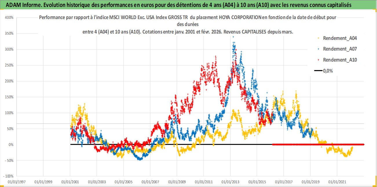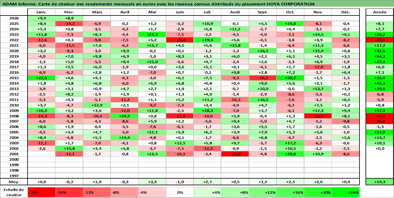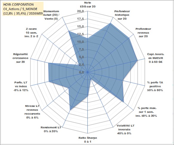 Site dédié aux investisseursPage dédiée sur site financeAnalyse des valorisations hebdomadaires de l'action HOYA CORPORATION. Cet actif est cote en JPY. Les valorisations sont en contrevaleur EURO et couvrent les semaines 2001W02 a 2026W09. Les revenus de cet actif financier sont pris en compte depuis la semaine 2001W13. La note globale ESG de cet actif est estimee a 11.0 (apres rebasage entre 0 et 20).