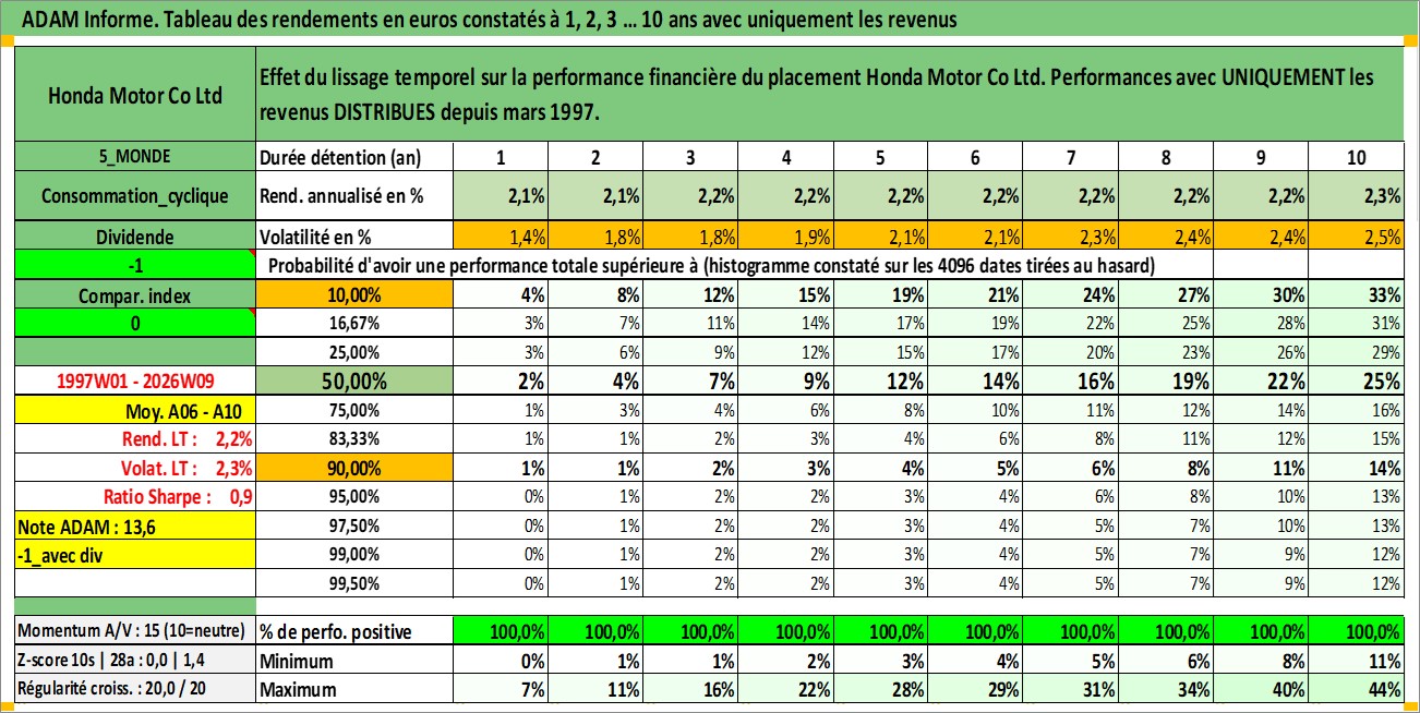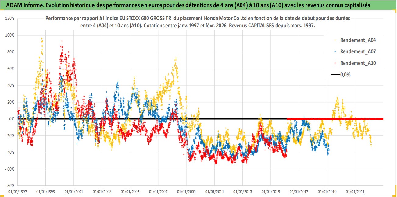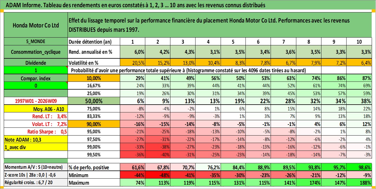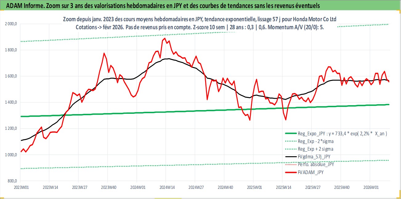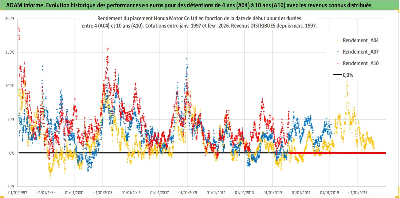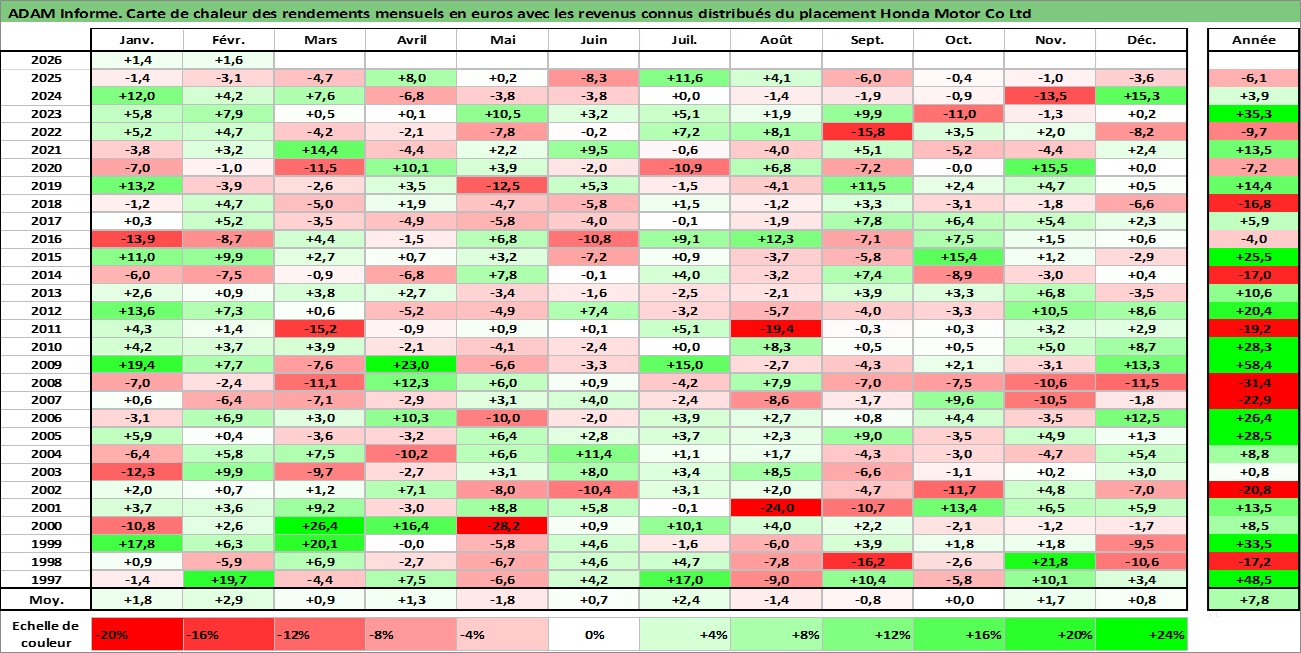 Site dédié aux investisseursPage dédiée sur site financeAnalyse des valorisations hebdomadaires de l'action Honda Motor Co Ltd. Cet actif est cote en JPY. Les valorisations sont en contrevaleur EURO et couvrent les semaines 1997W01 a 2026W09. Les revenus de cet actif financier sont pris en compte depuis la semaine 1997W13. La note globale ESG de cet actif est estimee a 6.0 (apres rebasage entre 0 et 20).