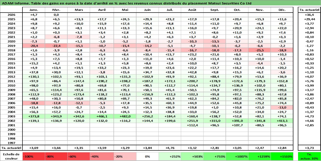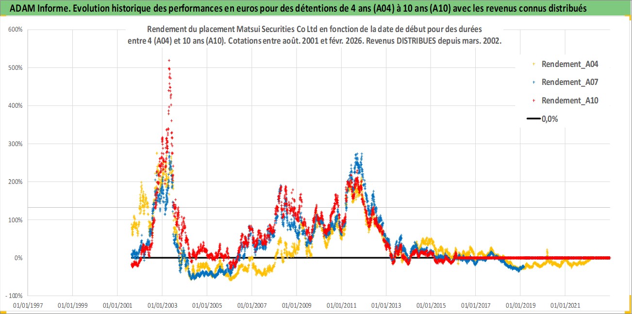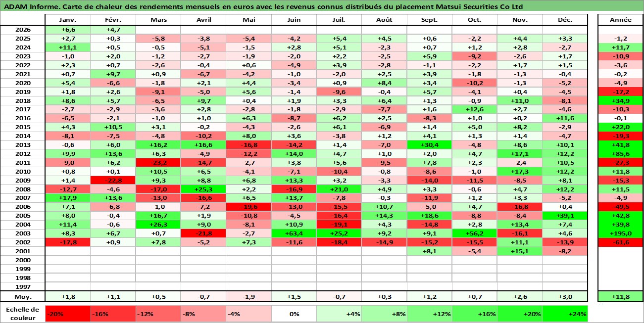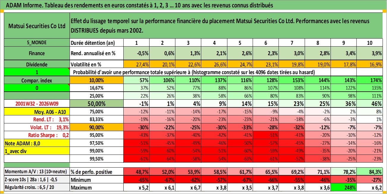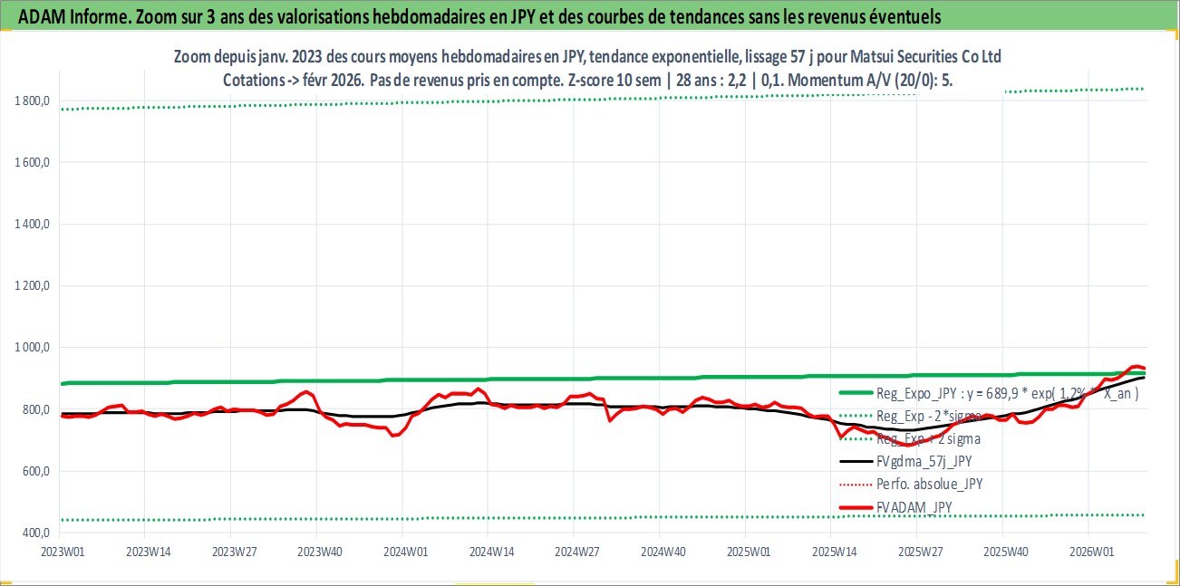 Site dédié aux investisseursPage dédiée sur site financeAnalyse des valorisations hebdomadaires de l'action Matsui Securities Co Ltd. Cet actif est cote en JPY. Les valorisations sont en contrevaleur EURO et couvrent les semaines 2001W32 a 2026W09. Les revenus de cet actif financier sont pris en compte depuis la semaine 2002W13. La note ESG de cet actif n'est pas connue.