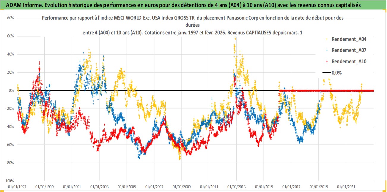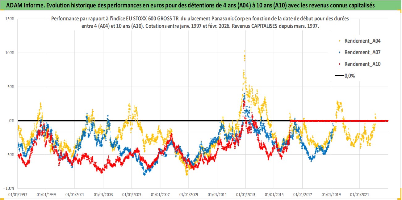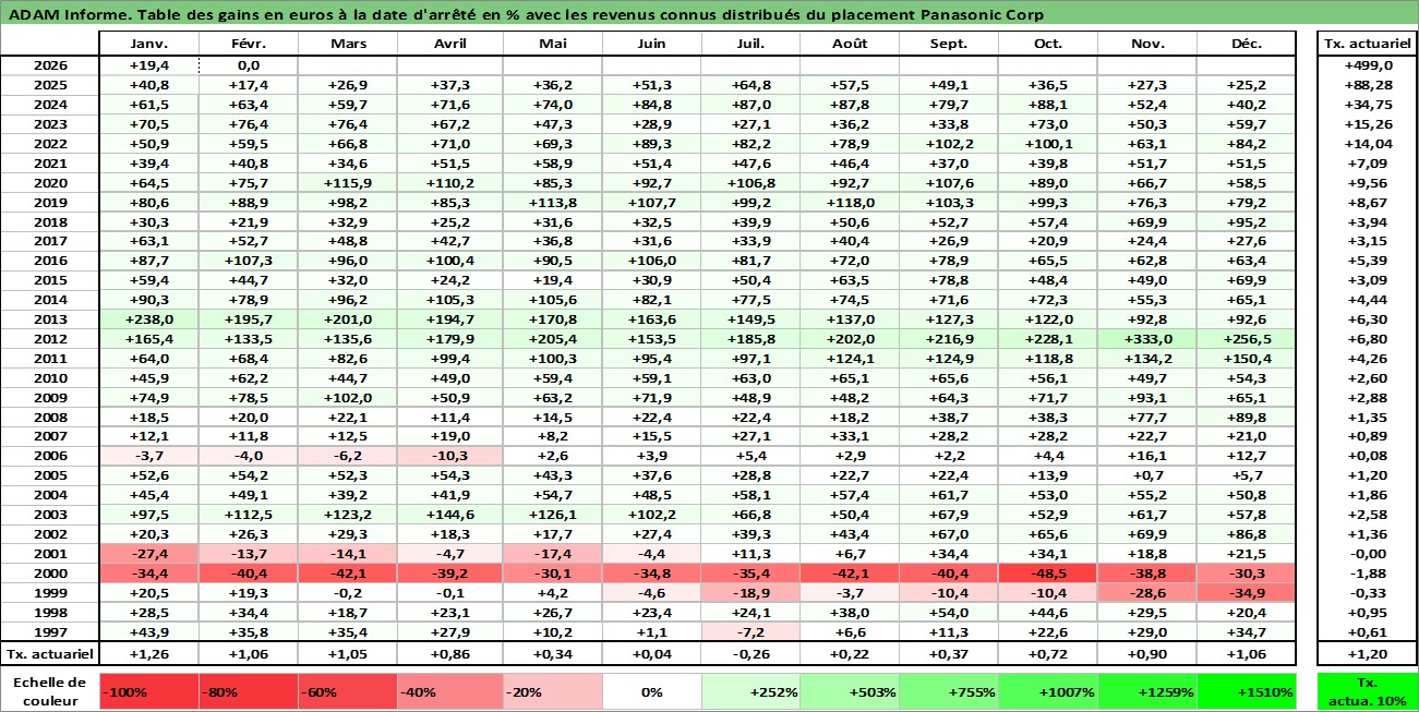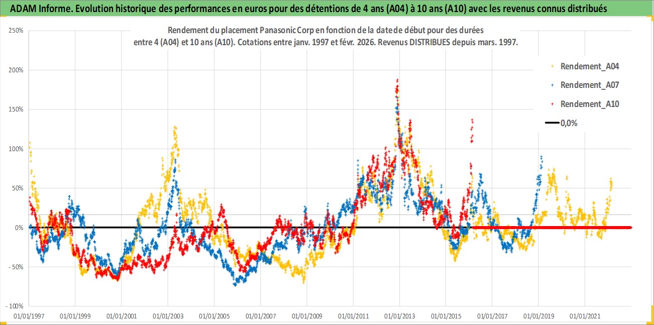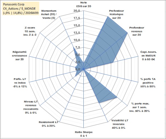Site dédié aux investisseursPage dédiée sur site financeAnalyse des valorisations hebdomadaires de l'action Panasonic Corp. Cet actif est cote en JPY. Les valorisations sont en contrevaleur EURO et couvrent les semaines 1997W01 a 2026W09. Les revenus de cet actif financier sont pris en compte depuis la semaine 1997W13. La note globale ESG de cet actif est estimee a 2.0 (apres rebasage entre 0 et 20).