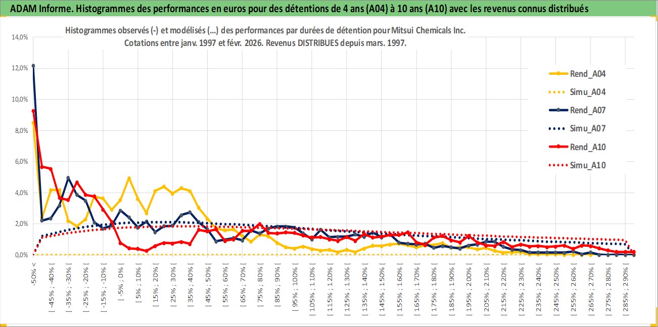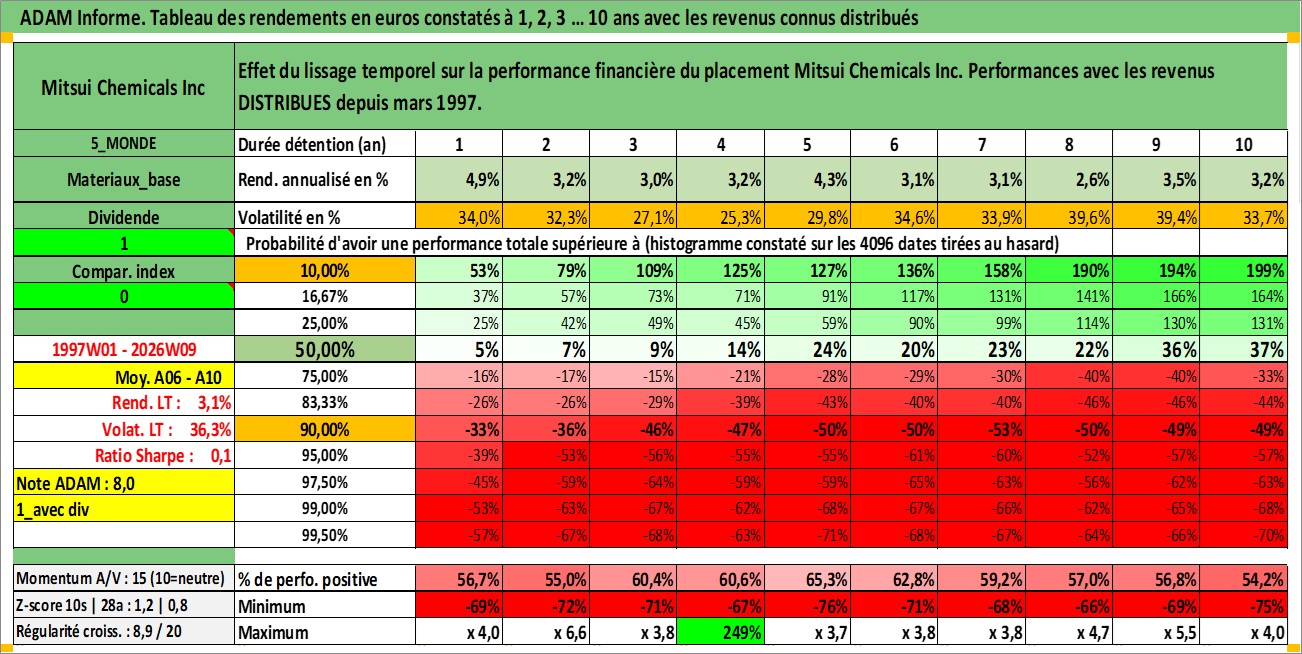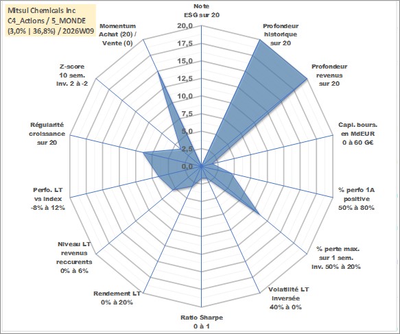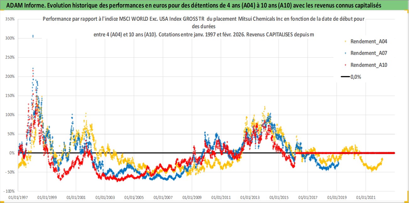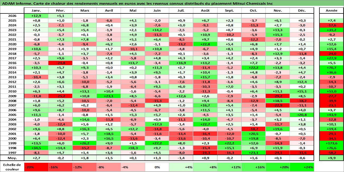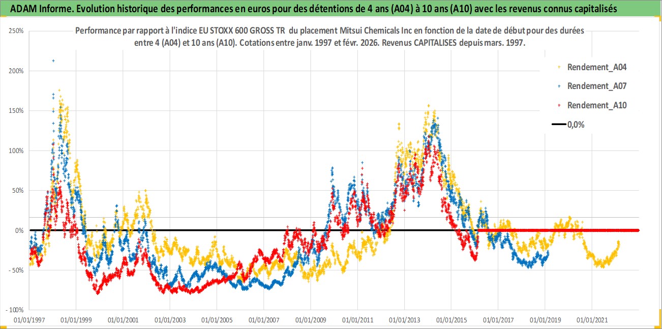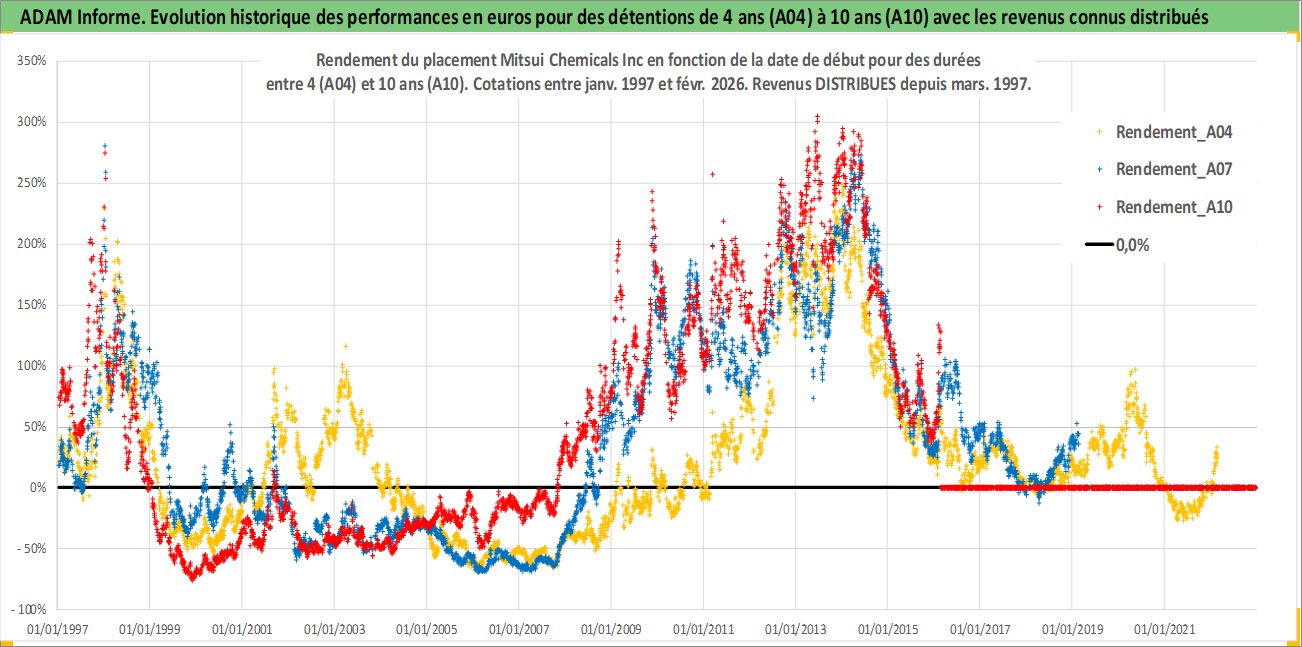 Site dédié aux investisseursPage dédiée sur site financeAnalyse des valorisations hebdomadaires de l'action Mitsui Chemicals Inc. Cet actif est cote en JPY. Les valorisations sont en contrevaleur EURO et couvrent les semaines 1997W01 a 2026W09. Les revenus de cet actif financier sont pris en compte depuis la semaine 1997W13. La note ESG de cet actif n'est pas connue.