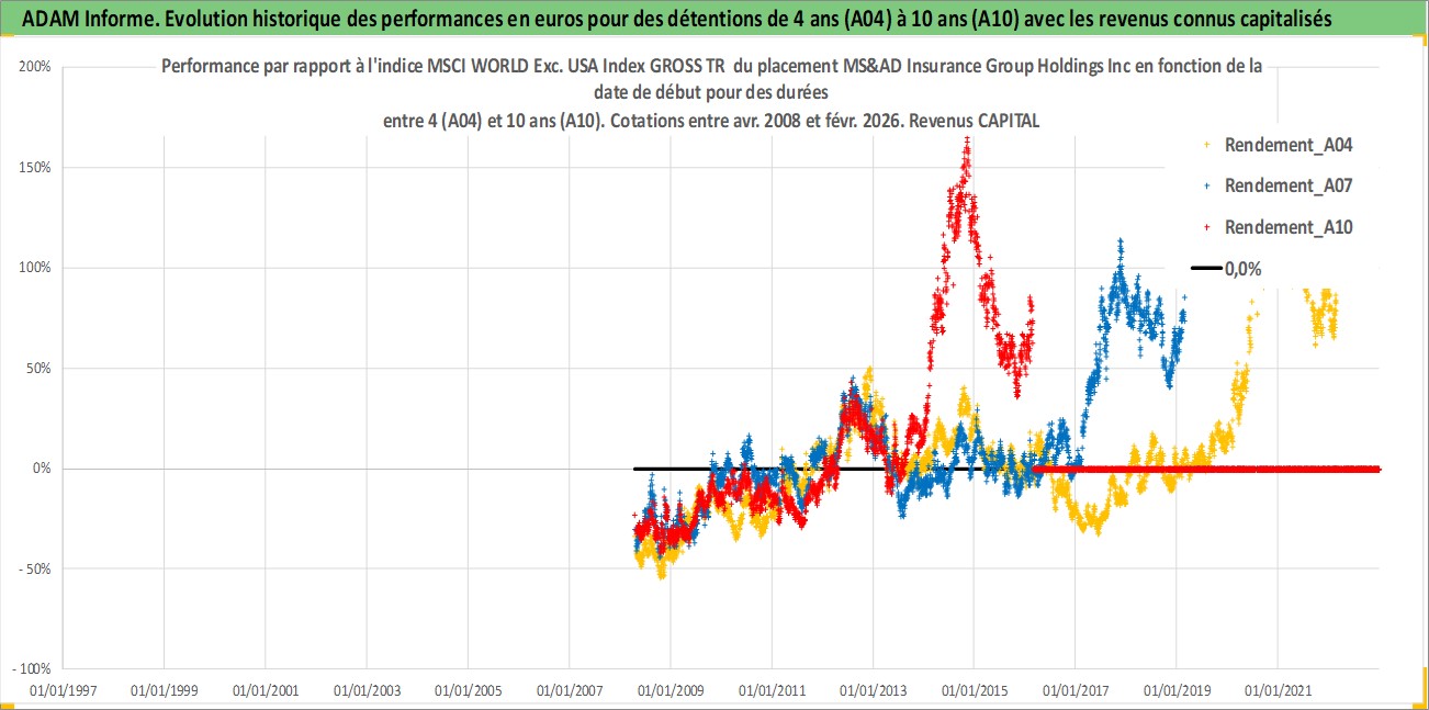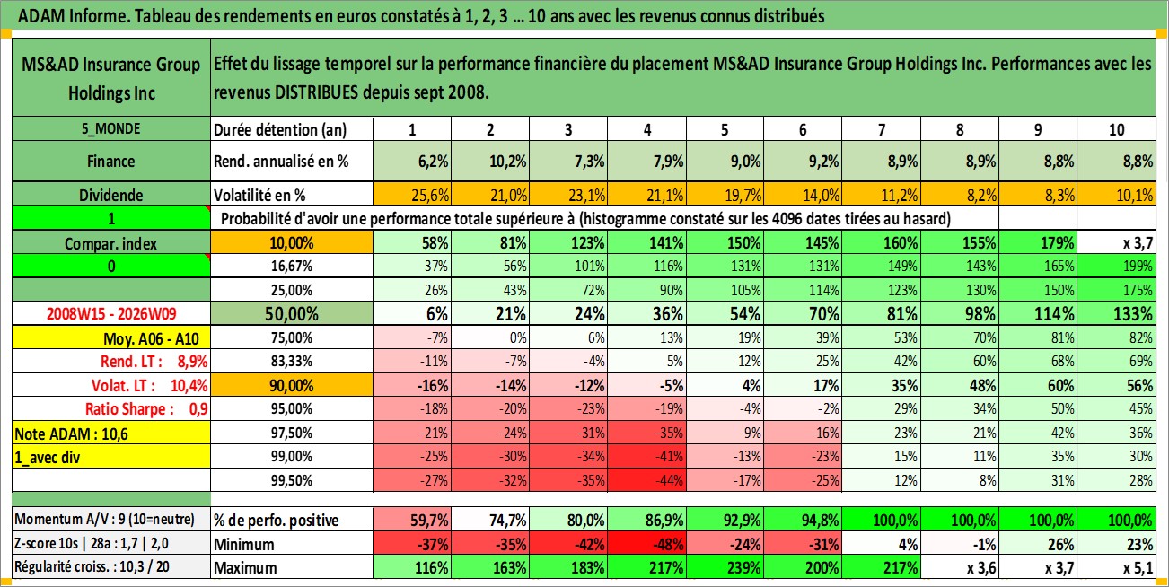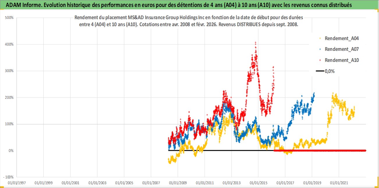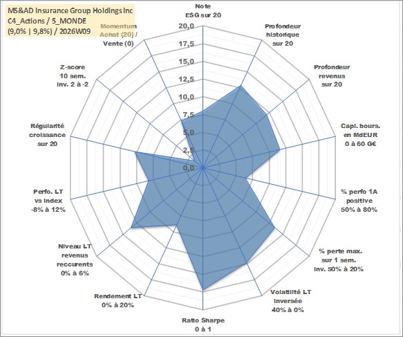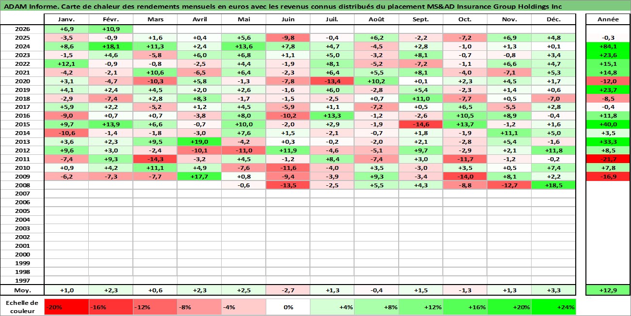 Site dédié aux investisseursPage dédiée sur site financeAnalyse des valorisations hebdomadaires de l'action MS&AD Insurance Group Holdings Inc. Cet actif est cote en JPY. Les valorisations sont en contrevaleur EURO et couvrent les semaines 2008W15 a 2026W09. Les revenus de cet actif financier sont pris en compte depuis la semaine 2008W39. La note globale ESG de cet actif est estimee a 8.0 (apres rebasage entre 0 et 20).