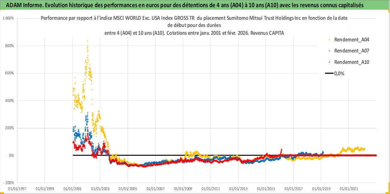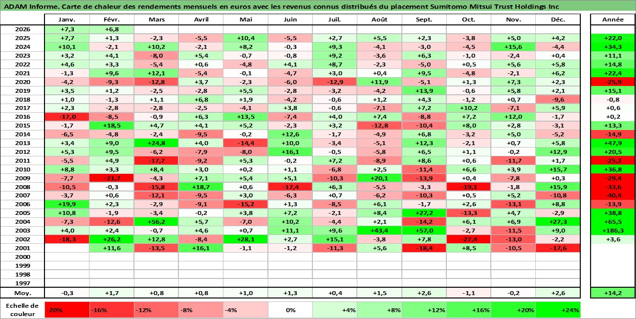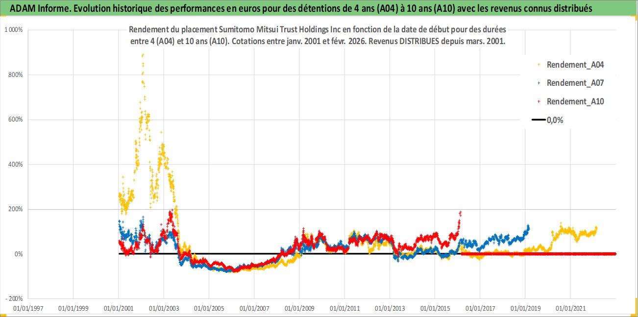 Site dédié aux investisseursPage dédiée sur site financeAnalyse des valorisations hebdomadaires de l'action Sumitomo Mitsui Trust Holdings Inc. Cet actif est cote en JPY. Les valorisations sont en contrevaleur EURO et couvrent les semaines 2001W01 a 2026W09. Les revenus de cet actif financier sont pris en compte depuis la semaine 2001W13. La note globale ESG de cet actif est estimee a 10.0 (apres rebasage entre 0 et 20).