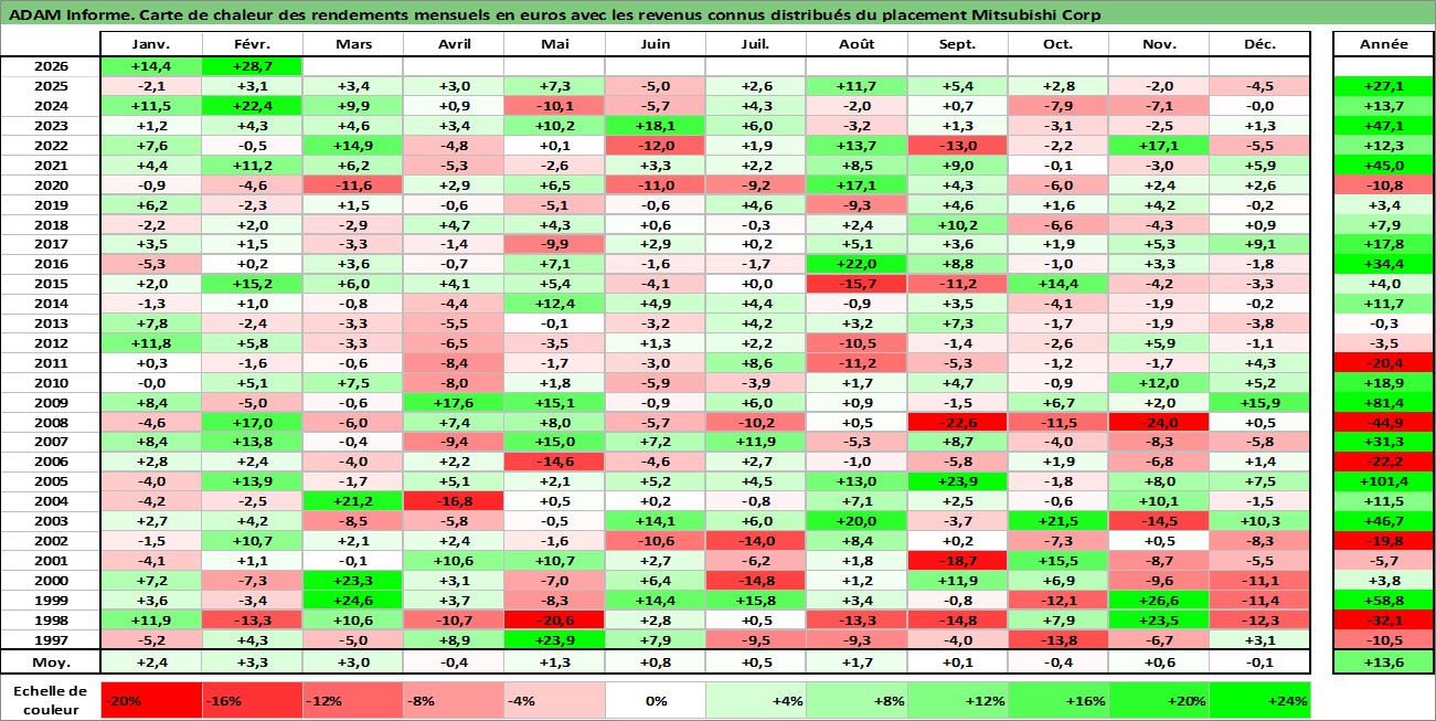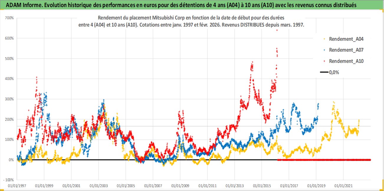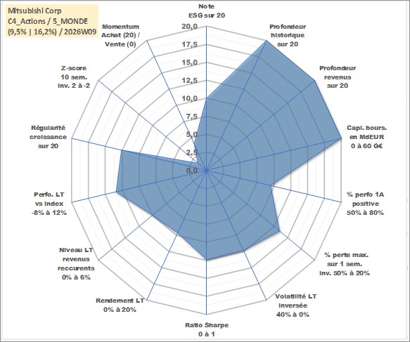 Site dédié aux investisseursPage dédiée sur site financeAnalyse des valorisations hebdomadaires de l'action Mitsubishi Corp. Cet actif est cote en JPY. Les valorisations sont en contrevaleur EURO et couvrent les semaines 1997W01 a 2026W09. Les revenus de cet actif financier sont pris en compte depuis la semaine 1997W13. La note globale ESG de cet actif est estimee a 10.0 (apres rebasage entre 0 et 20).