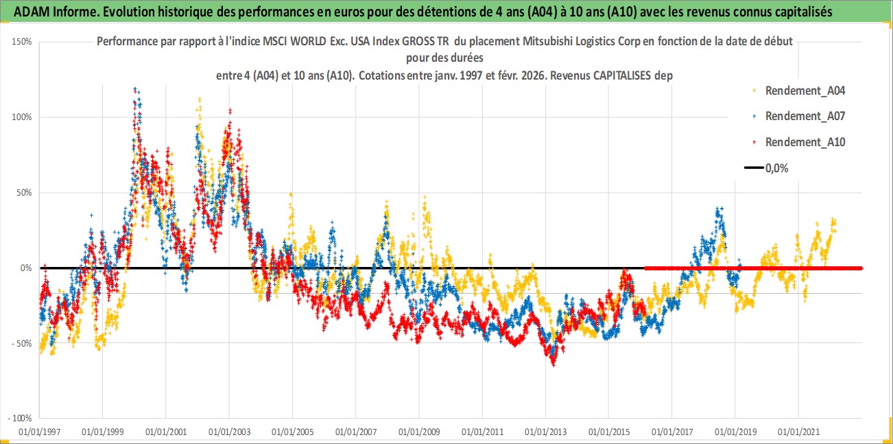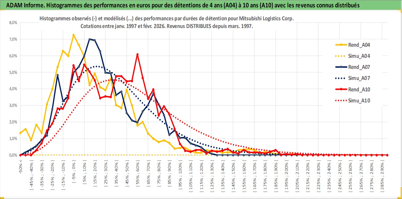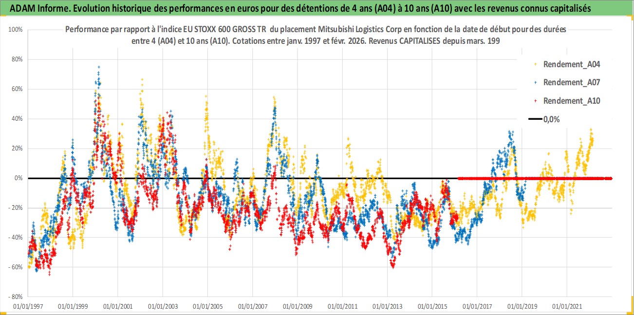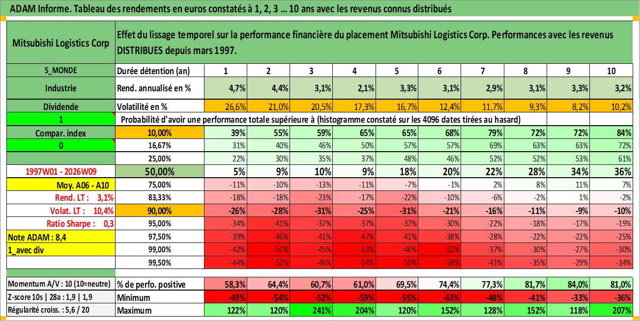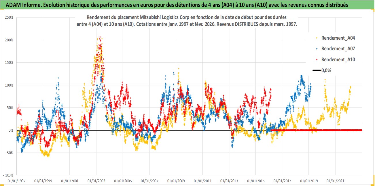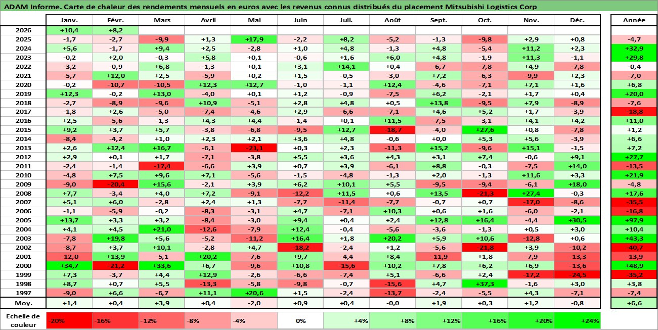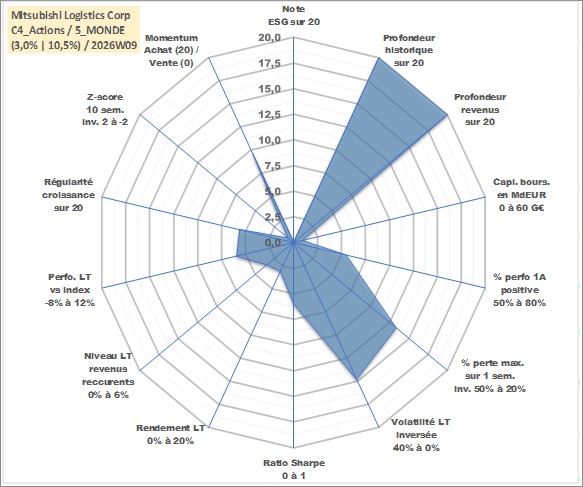 Site dédié aux investisseursPage dédiée sur site financeAnalyse des valorisations hebdomadaires de l'action Mitsubishi Logistics Corp. Cet actif est cote en JPY. Les valorisations sont en contrevaleur EURO et couvrent les semaines 1997W01 a 2026W09. Les revenus de cet actif financier sont pris en compte depuis la semaine 1997W13. La note ESG de cet actif n'est pas connue.