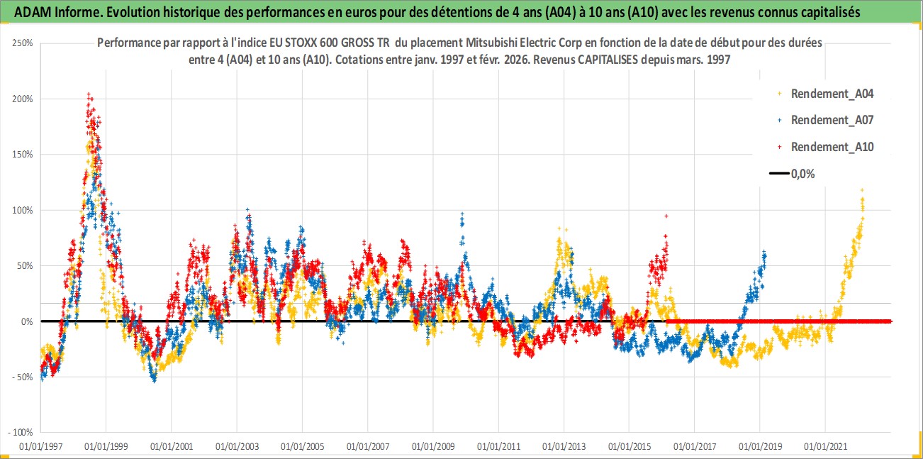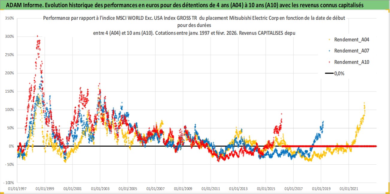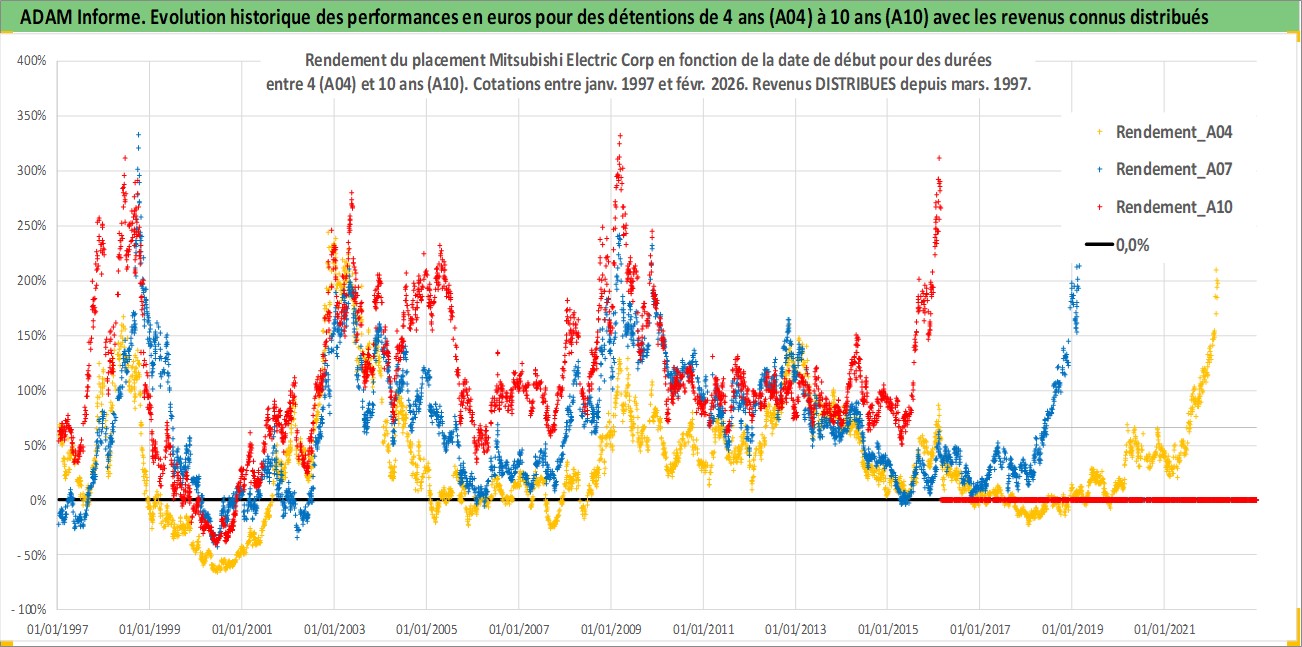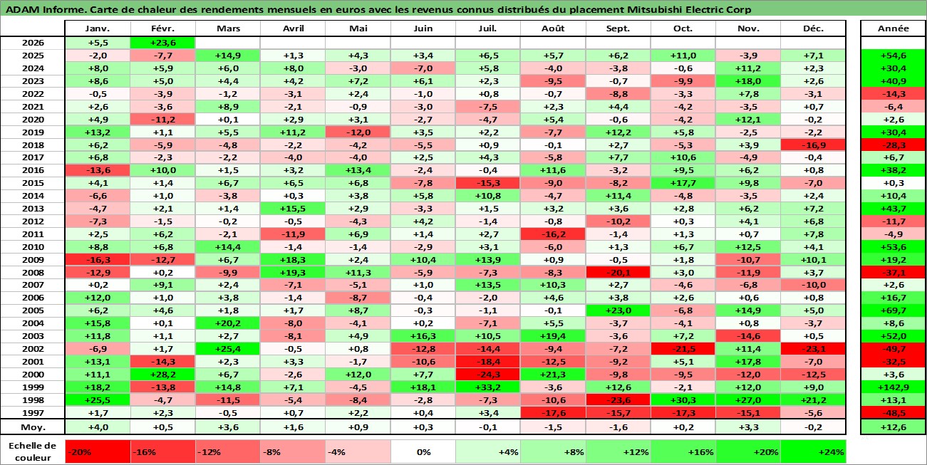 Site dédié aux investisseursPage dédiée sur site financeAnalyse des valorisations hebdomadaires de l'action Mitsubishi Electric Corp. Cet actif est cote en JPY. Les valorisations sont en contrevaleur EURO et couvrent les semaines 1997W01 a 2026W09. Les revenus de cet actif financier sont pris en compte depuis la semaine 1997W13. La note globale ESG de cet actif est estimee a 8.0 (apres rebasage entre 0 et 20).