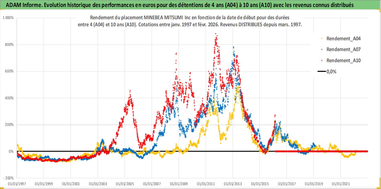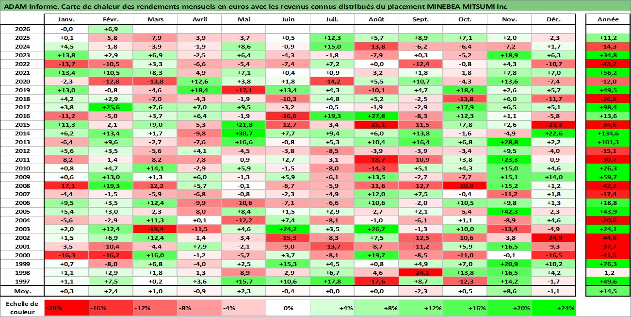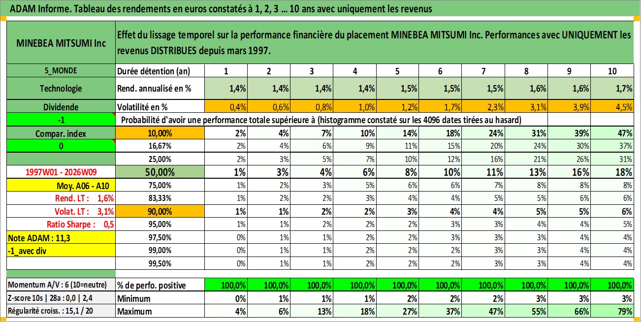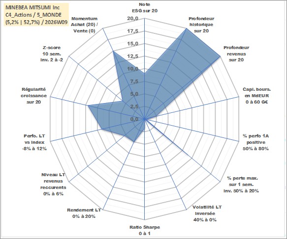 Site dédié aux investisseursPage dédiée sur site financeAnalyse des valorisations hebdomadaires de l'action MINEBEA MITSUMI Inc. Cet actif est cote en JPY. Les valorisations sont en contrevaleur EURO et couvrent les semaines 1997W01 a 2026W09. Les revenus de cet actif financier sont pris en compte depuis la semaine 1997W13. La note globale ESG de cet actif est estimee a 9.0 (apres rebasage entre 0 et 20).