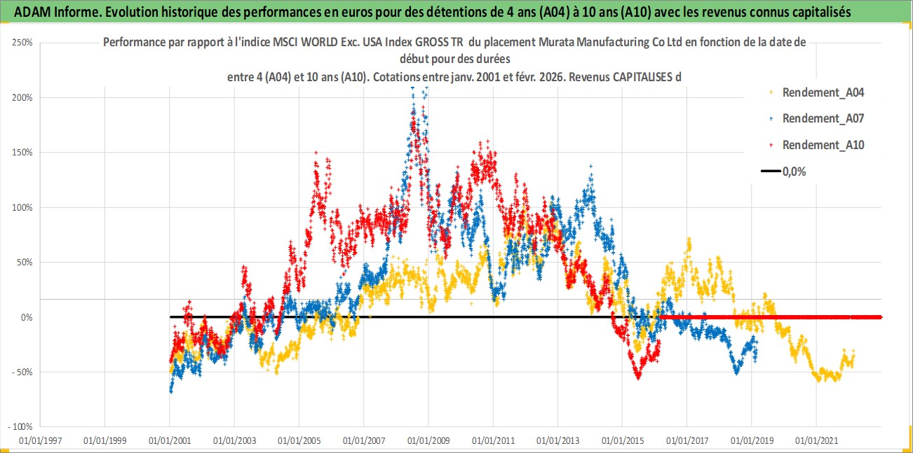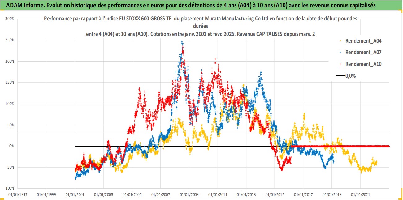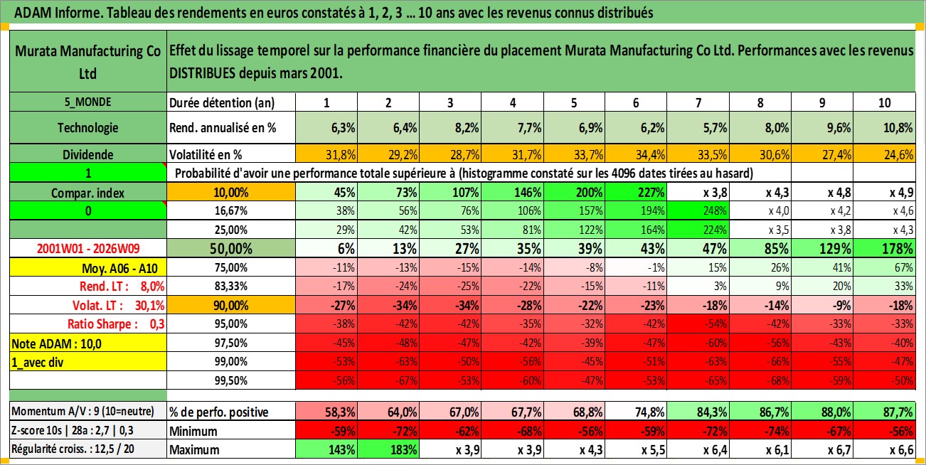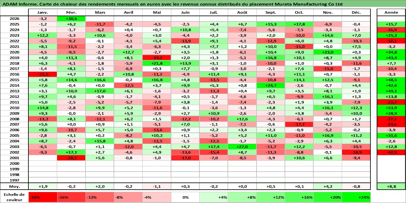 Site dédié aux investisseursPage dédiée sur site financeAnalyse des valorisations hebdomadaires de l'action Murata Manufacturing Co Ltd. Cet actif est cote en JPY. Les valorisations sont en contrevaleur EURO et couvrent les semaines 2001W01 a 2026W09. Les revenus de cet actif financier sont pris en compte depuis la semaine 2001W13. La note globale ESG de cet actif est estimee a 13.0 (apres rebasage entre 0 et 20).