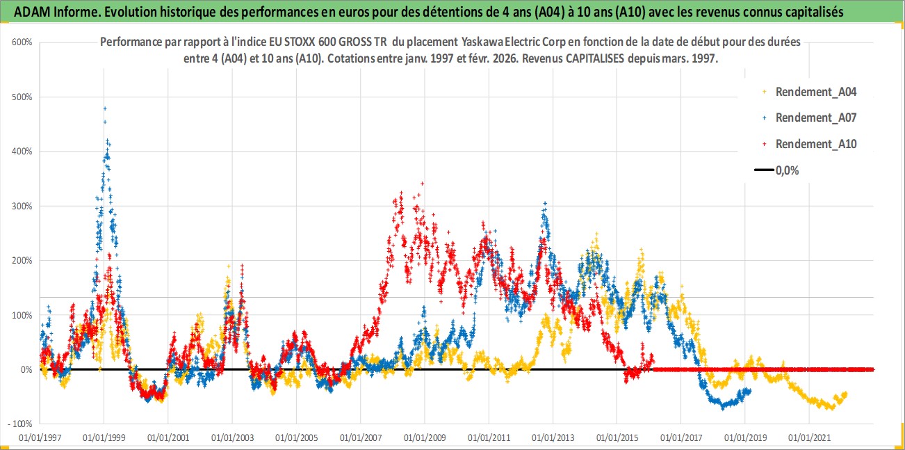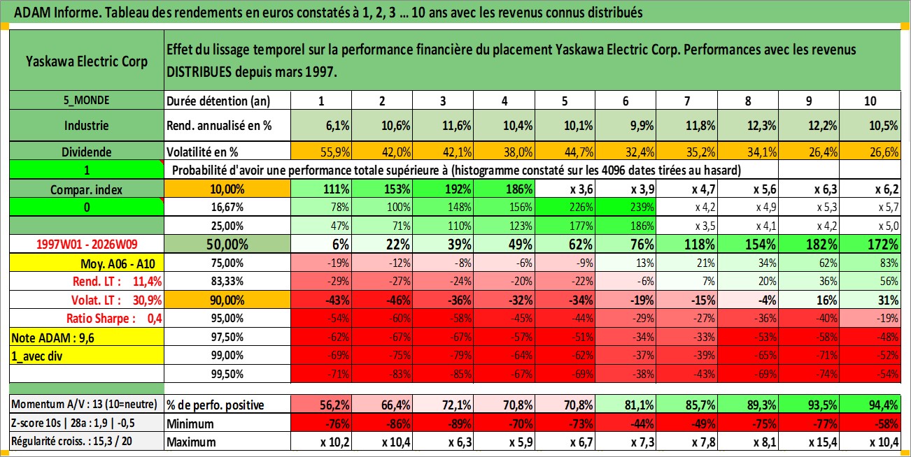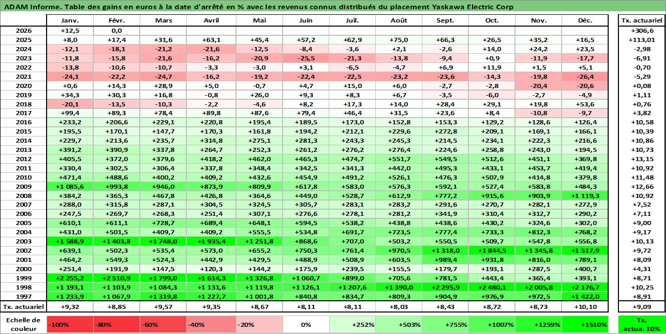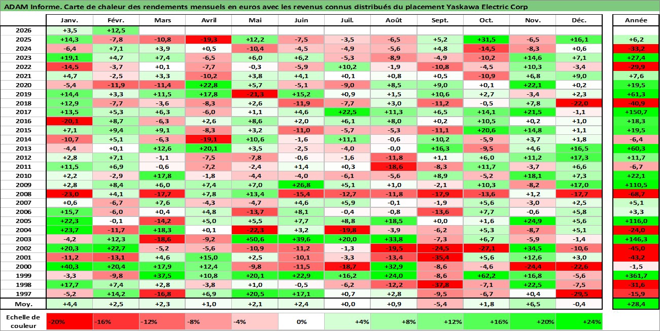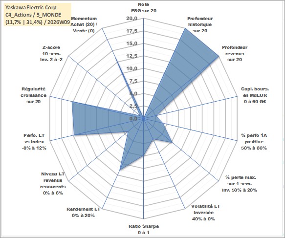 Site dédié aux investisseursPage dédiée sur site financeAnalyse des valorisations hebdomadaires de l'action Yaskawa Electric Corp. Cet actif est cote en JPY. Les valorisations sont en contrevaleur EURO et couvrent les semaines 1997W01 a 2026W09. Les revenus de cet actif financier sont pris en compte depuis la semaine 1997W11. La note ESG de cet actif n'est pas connue.