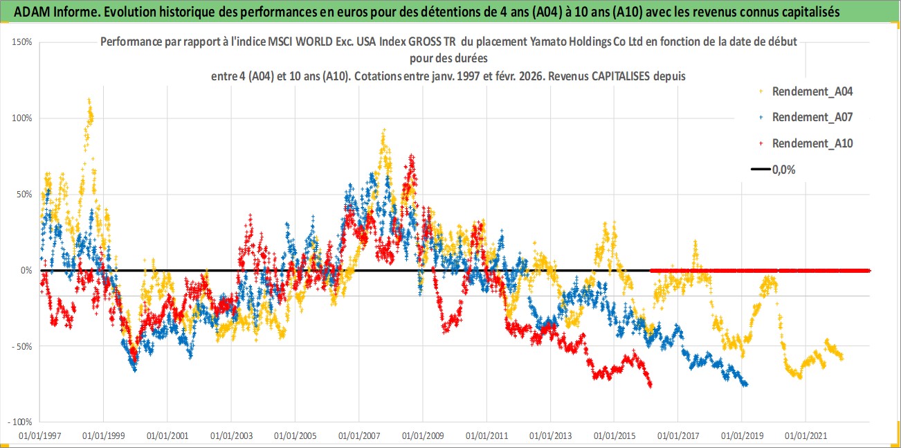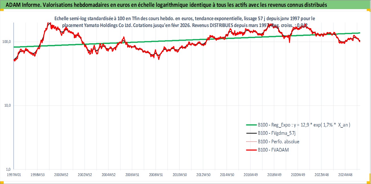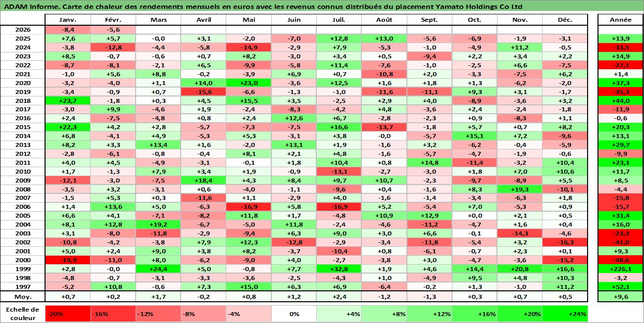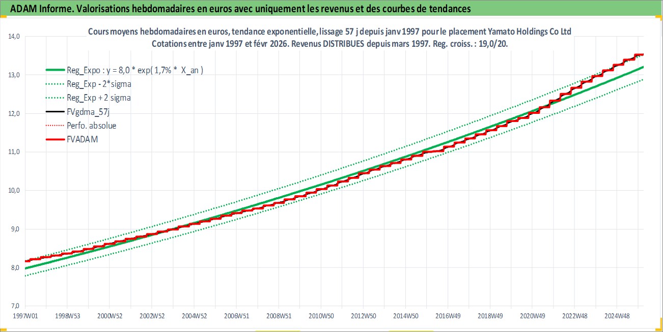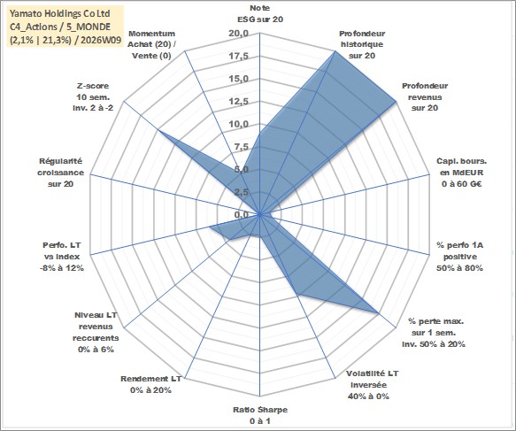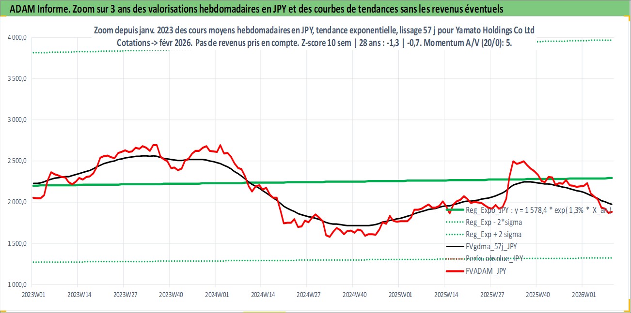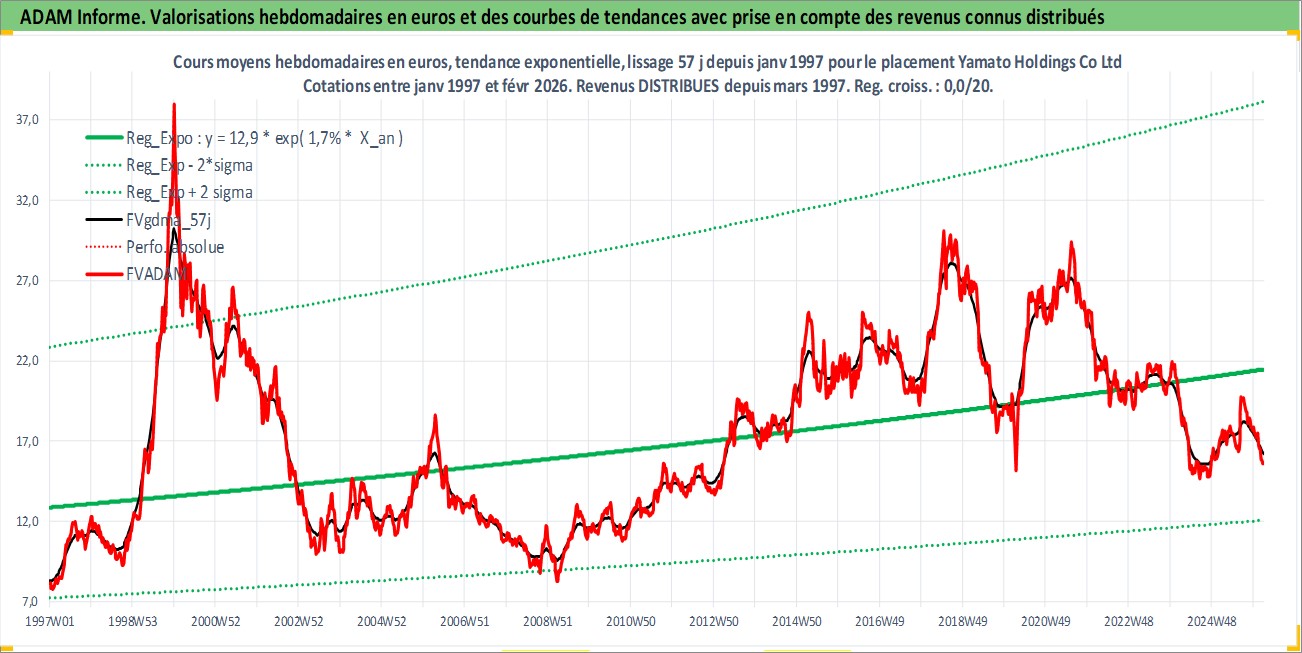 Site dédié aux investisseursPage dédiée sur site financeAnalyse des valorisations hebdomadaires de l'action Yamato Holdings Co Ltd. Cet actif est cote en JPY. Les valorisations sont en contrevaleur EURO et couvrent les semaines 1997W01 a 2026W09. Les revenus de cet actif financier sont pris en compte depuis la semaine 1997W13. La note globale ESG de cet actif est estimee a 9.0 (apres rebasage entre 0 et 20).