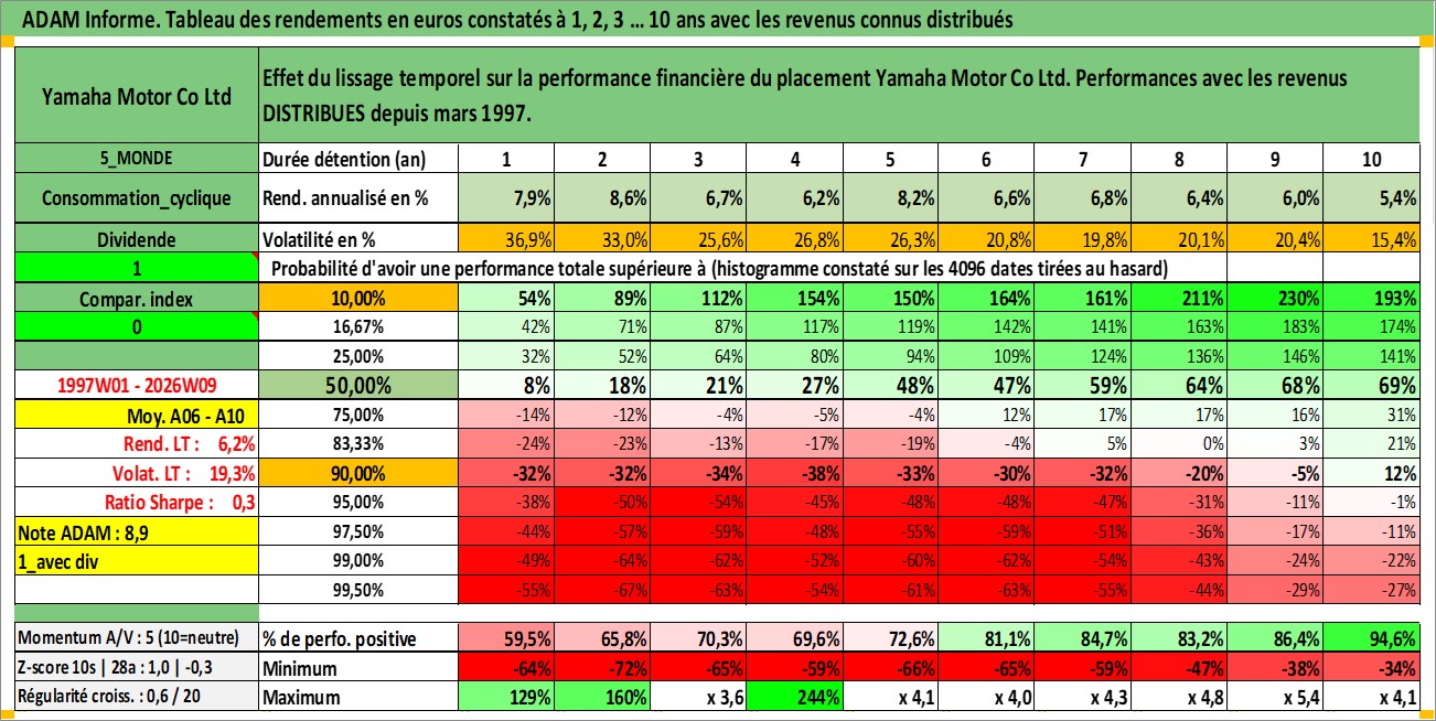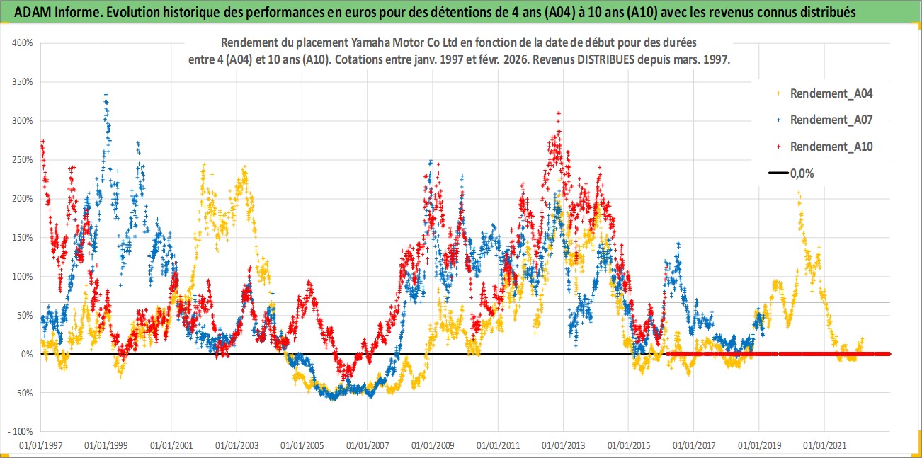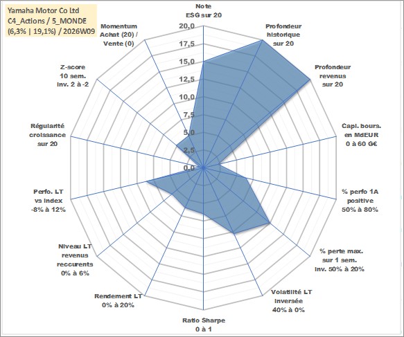 Site dédié aux investisseursPage dédiée sur site financeAnalyse des valorisations hebdomadaires de l'action Yamaha Motor Co Ltd. Cet actif est cote en JPY. Les valorisations sont en contrevaleur EURO et couvrent les semaines 1997W01 a 2026W09. Les revenus de cet actif financier sont pris en compte depuis la semaine 1997W13. La note globale ESG de cet actif est estimee a 15.0 (apres rebasage entre 0 et 20).