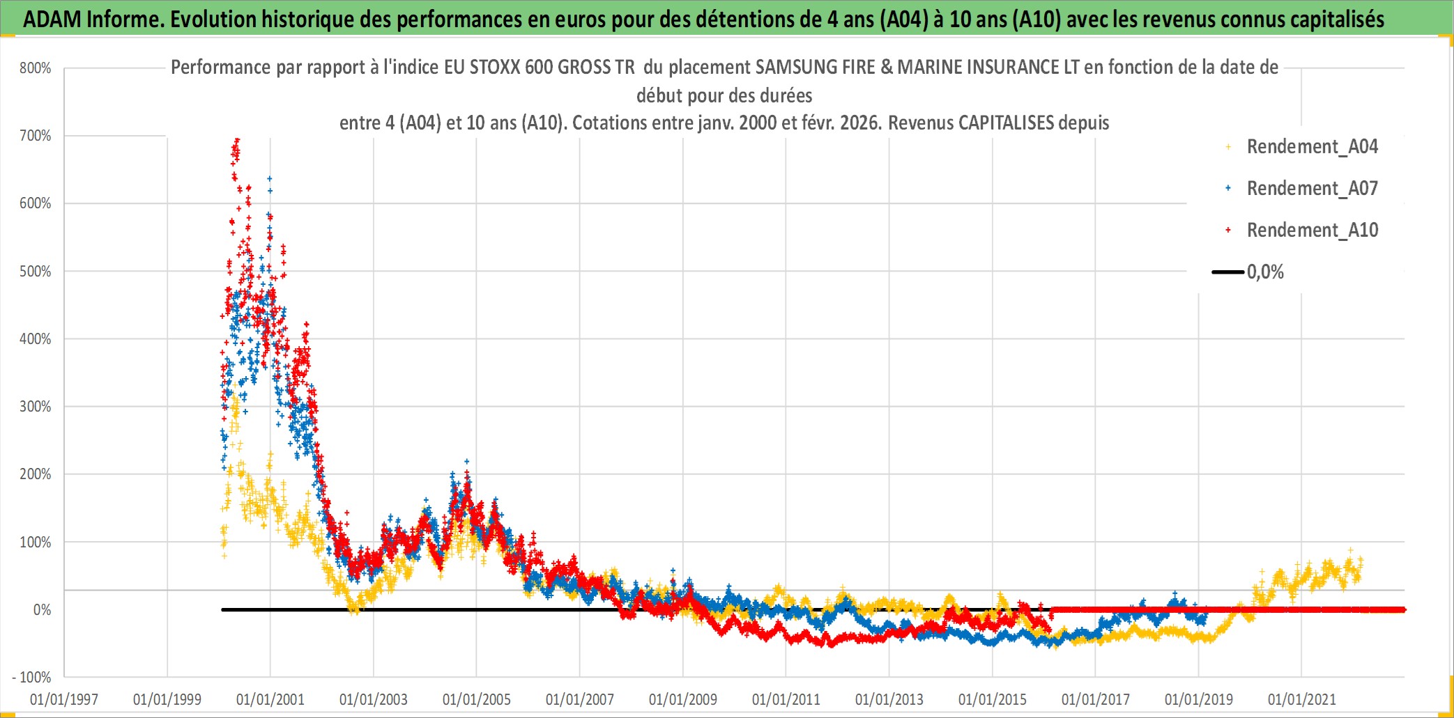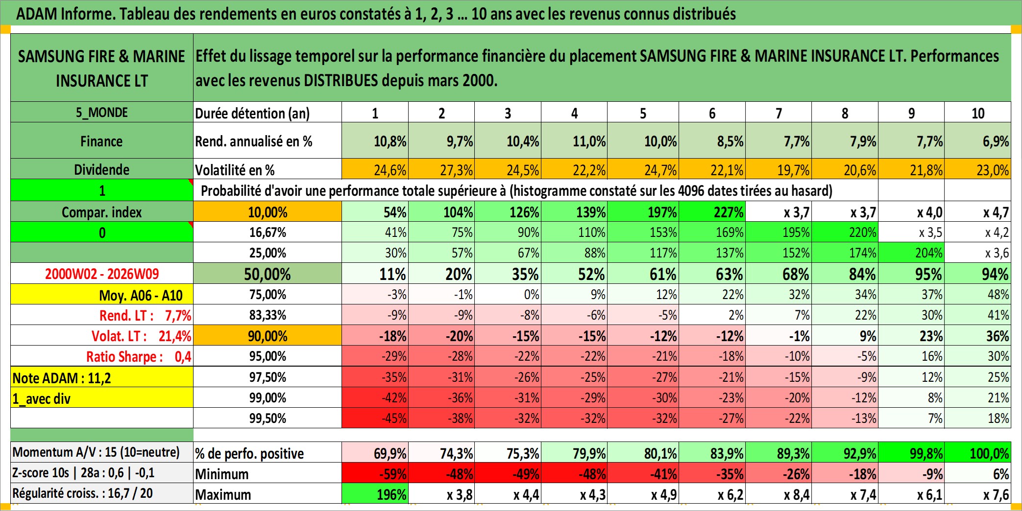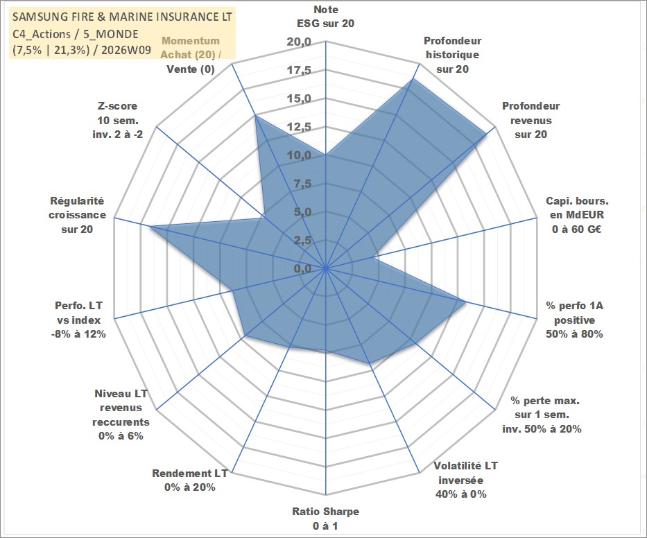 Site dédié aux investisseursPage dédiée sur site financeAnalyse des valorisations hebdomadaires de l'action SAMSUNG FIRE & MARINE INSURANCE LT. Cet actif est cote en KRW. Les valorisations sont en contrevaleur EURO et couvrent les semaines 2000W02 a 2026W09. Les revenus de cet actif financier sont pris en compte depuis la semaine 2000W13. La note globale ESG de cet actif est estimee a 10.0 (apres rebasage entre 0 et 20).