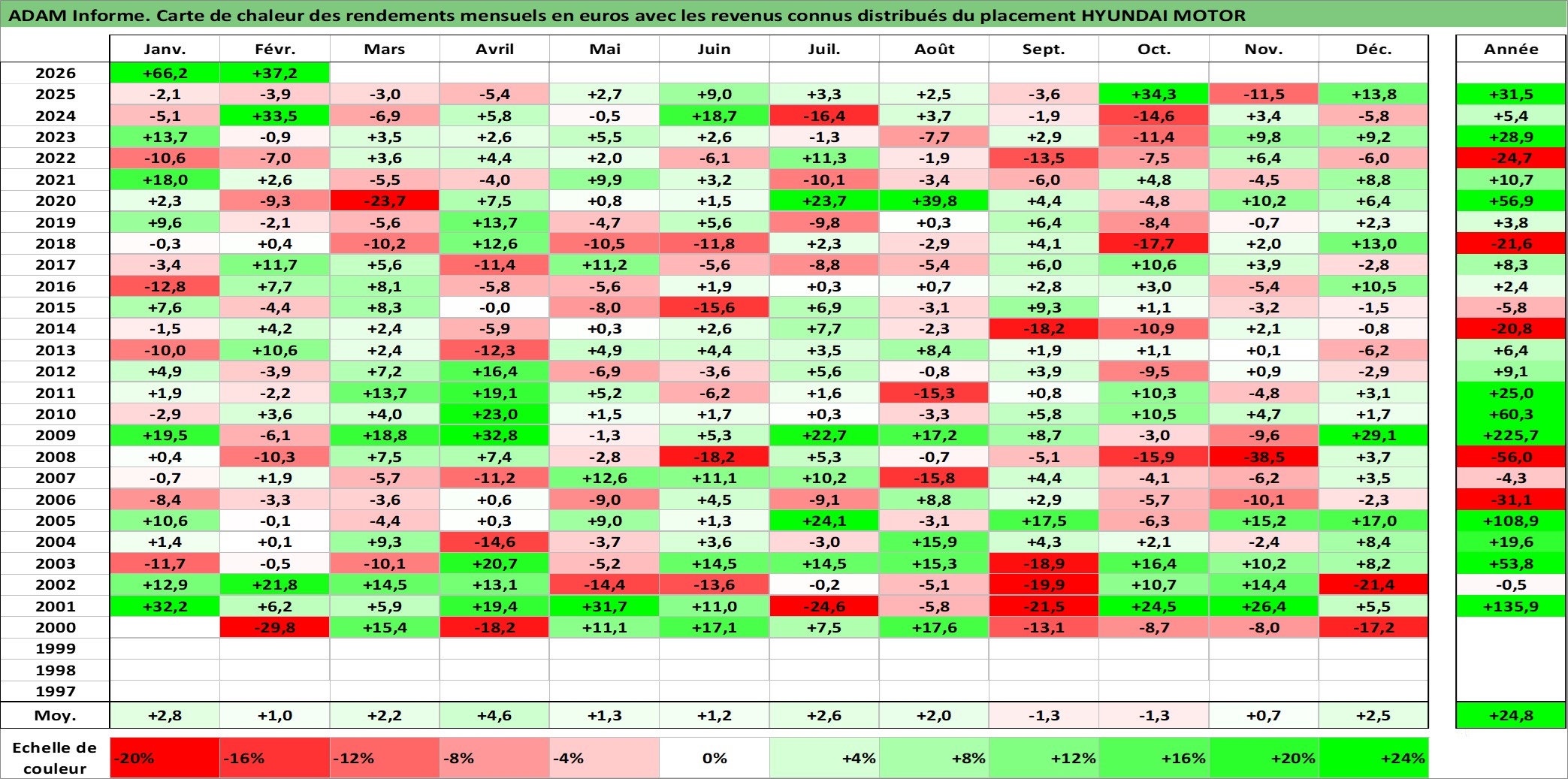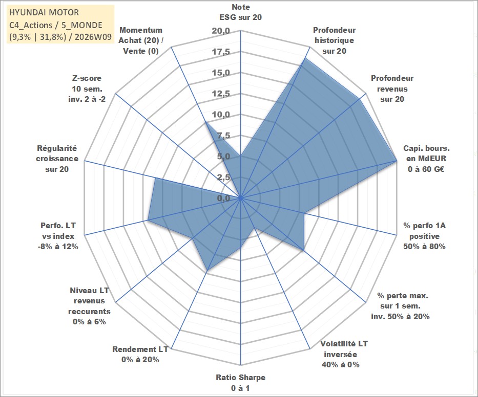 Site dédié aux investisseursPage dédiée sur site financeAnalyse des valorisations hebdomadaires de l'action HYUNDAI MOTOR. Cet actif est cote en KRW. Les valorisations sont en contrevaleur EURO et couvrent les semaines 2000W02 a 2026W09. Les revenus de cet actif financier sont pris en compte depuis la semaine 2000W01. La note globale ESG de cet actif est estimee a 5.0 (apres rebasage entre 0 et 20).