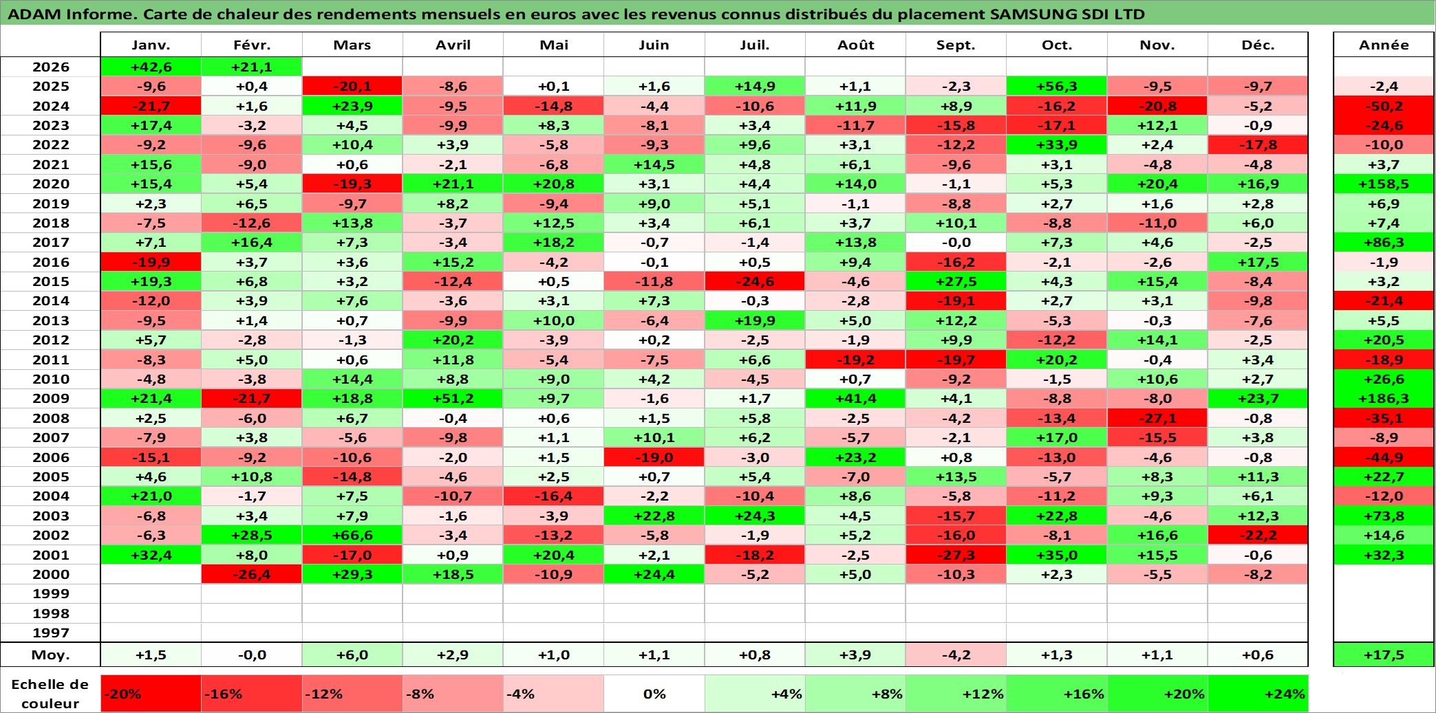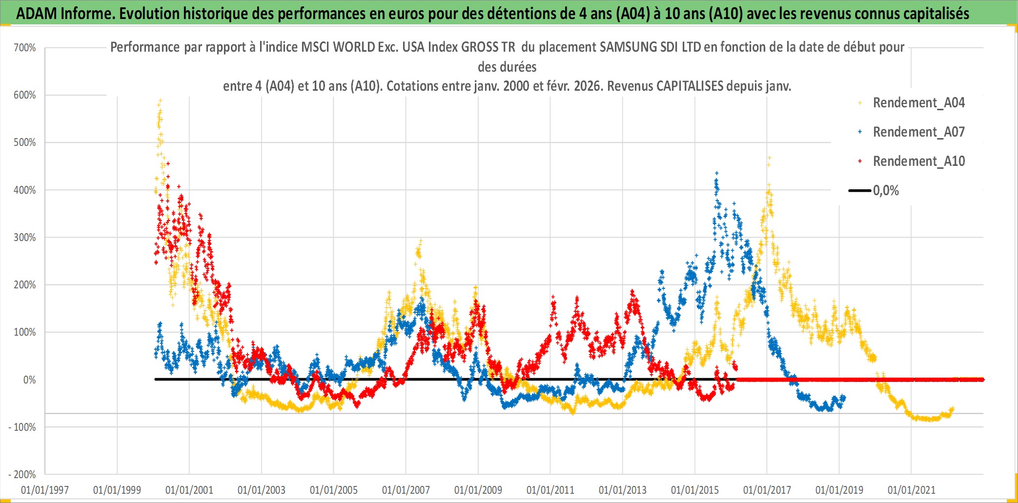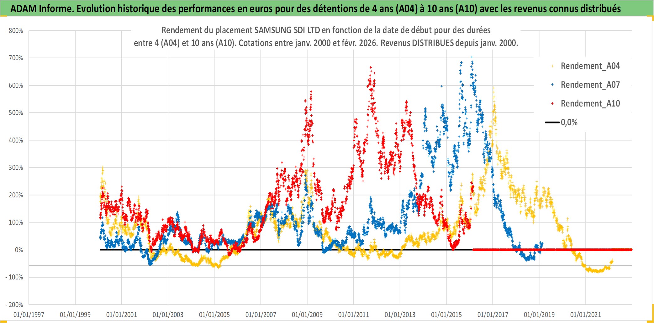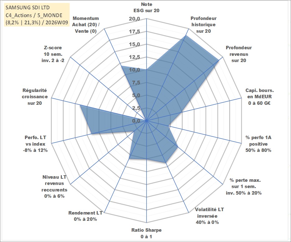 Site dédié aux investisseursPage dédiée sur site financeAnalyse des valorisations hebdomadaires de l'action SAMSUNG SDI LTD. Cet actif est cote en KRW. Les valorisations sont en contrevaleur EURO et couvrent les semaines 2000W02 a 2026W09. Les revenus de cet actif financier sont pris en compte depuis la semaine 2000W01. La note globale ESG de cet actif est estimee a 10.0 (apres rebasage entre 0 et 20).