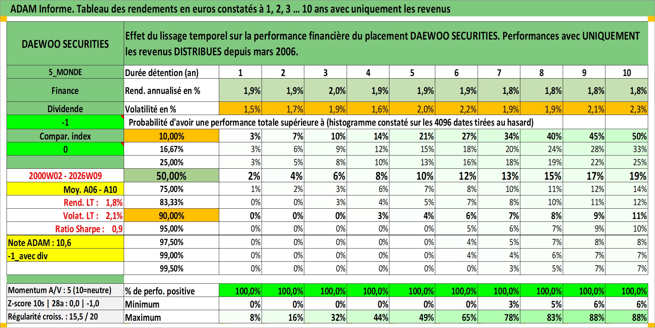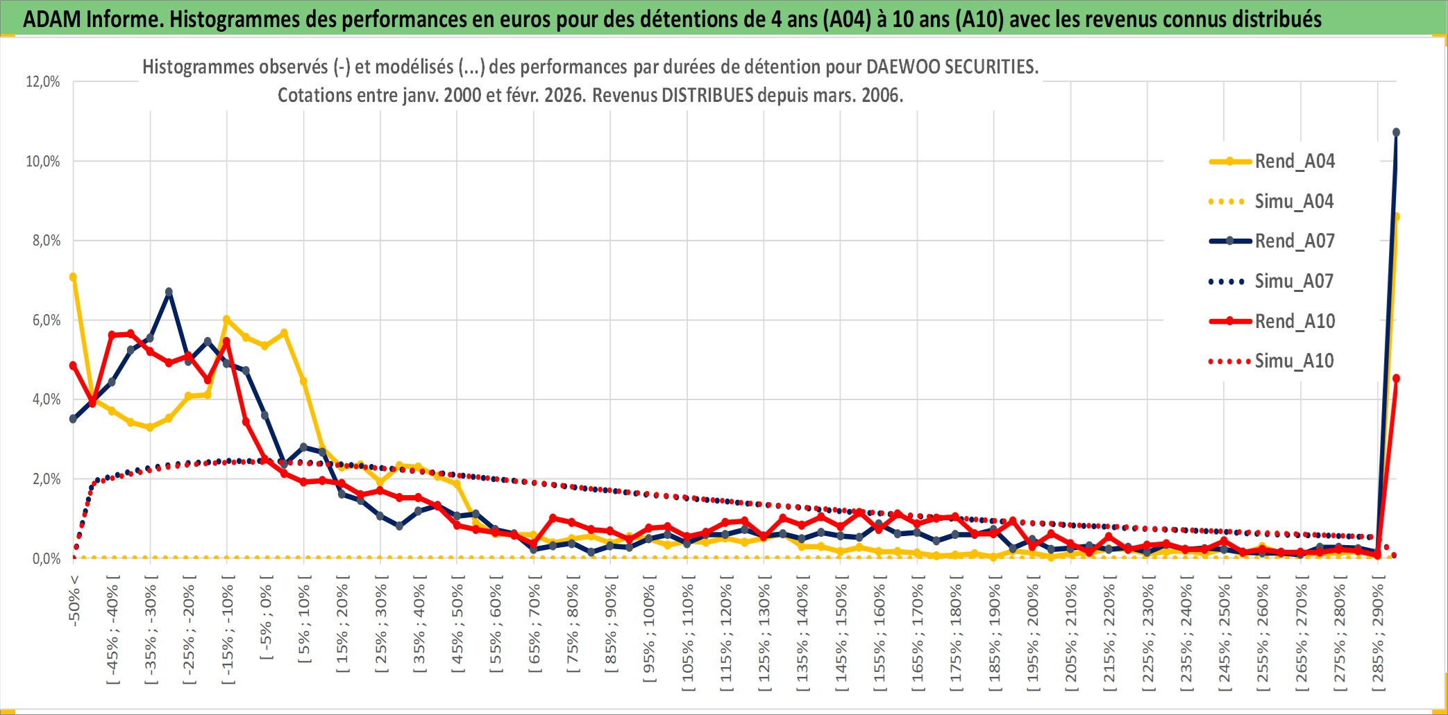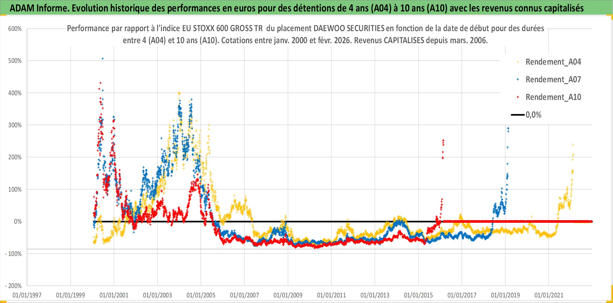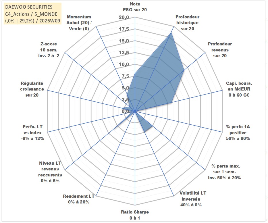 Site dédié aux investisseursPage dédiée sur site financeAnalyse des valorisations hebdomadaires de l'action DAEWOO SECURITIES. Cet actif est cote en KRW. Les valorisations sont en contrevaleur EURO et couvrent les semaines 2000W02 a 2026W09. Les revenus de cet actif financier sont pris en compte depuis la semaine 2006W13. La note globale ESG de cet actif est estimee a 8.0 (apres rebasage entre 0 et 20).
