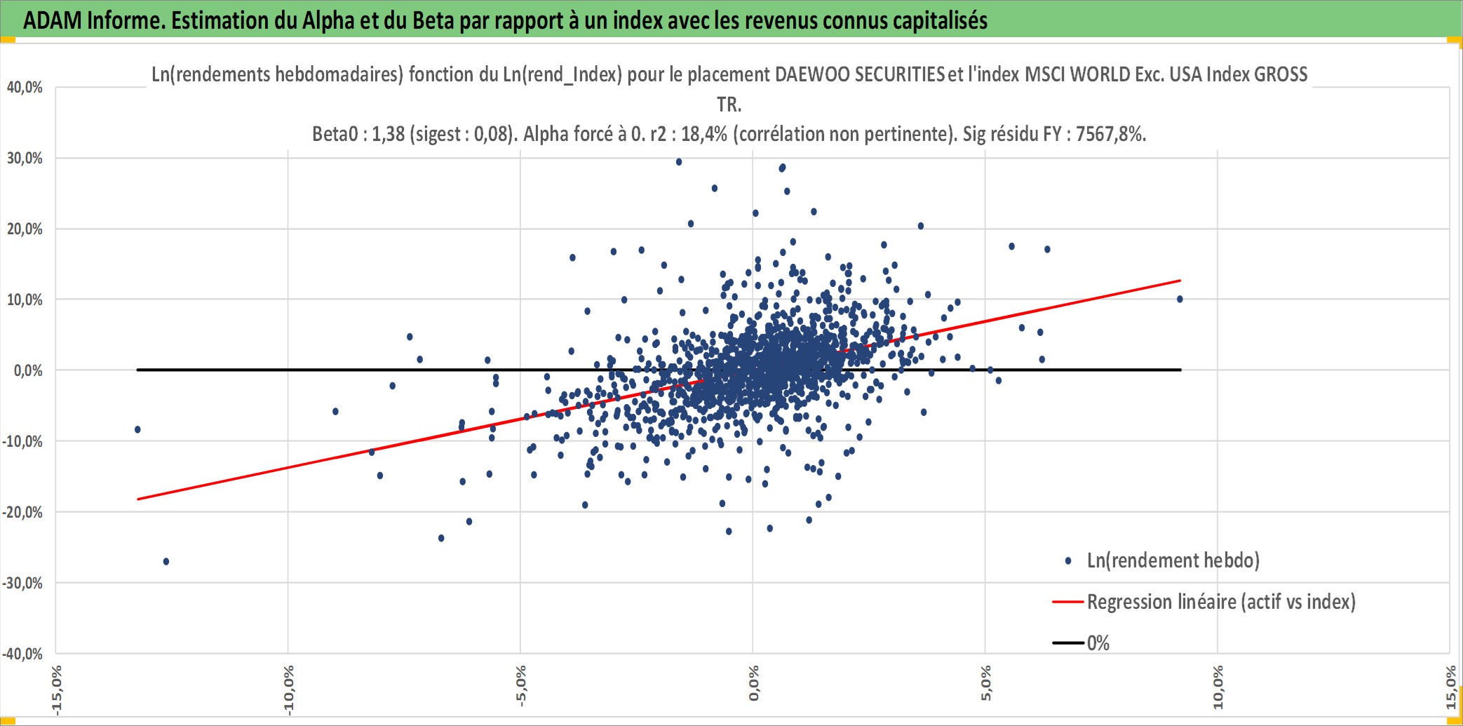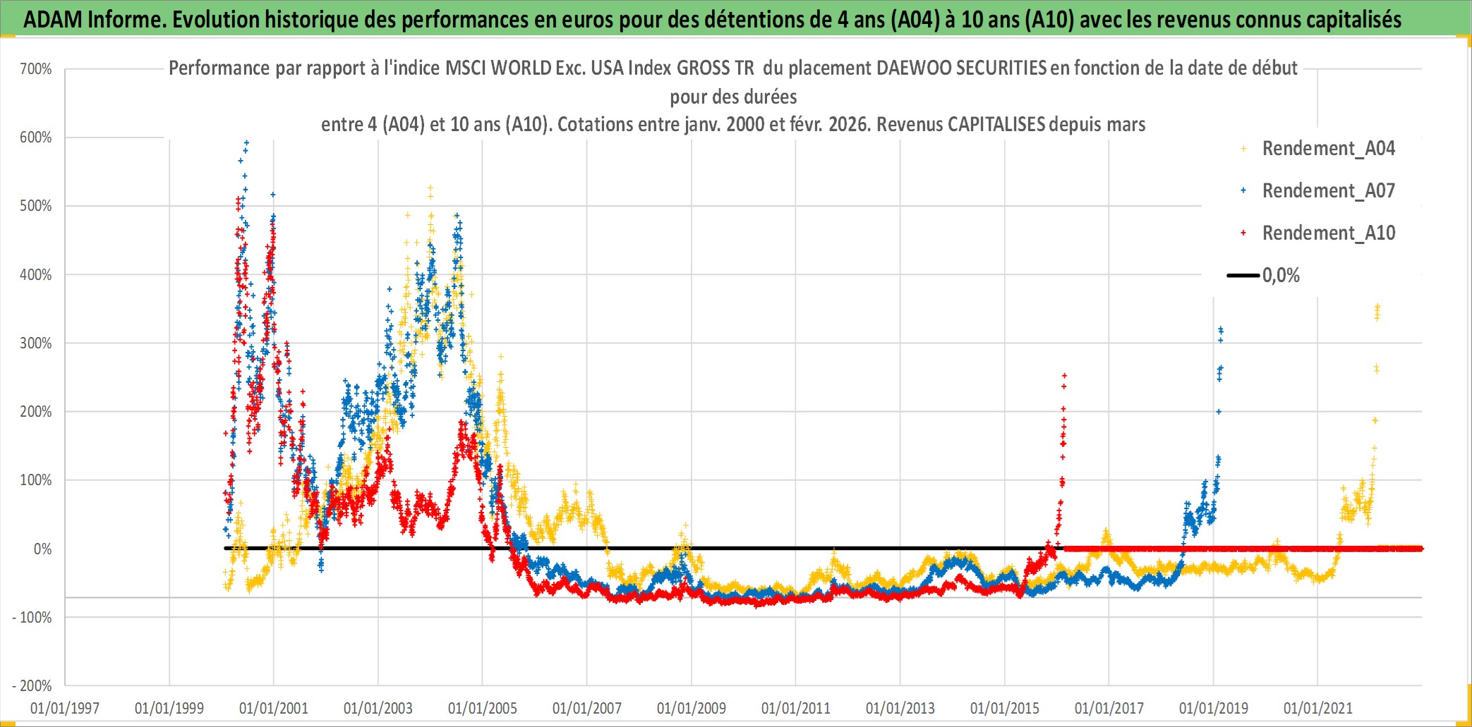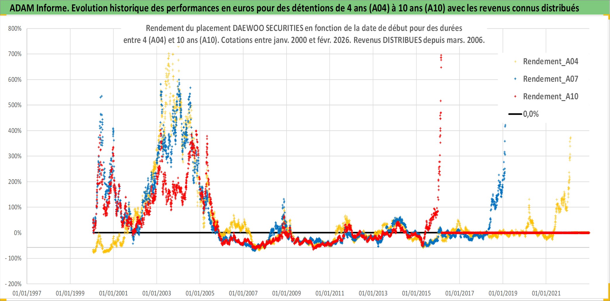 Site dédié aux investisseursPage dédiée sur site financeAnalyse des valorisations hebdomadaires de l'action DAEWOO SECURITIES. Cet actif est cote en KRW. Les valorisations sont en contrevaleur EURO et couvrent les semaines 2000W02 a 2026W09. Les revenus de cet actif financier sont pris en compte depuis la semaine 2006W13. La note globale ESG de cet actif est estimee a 8.0 (apres rebasage entre 0 et 20).