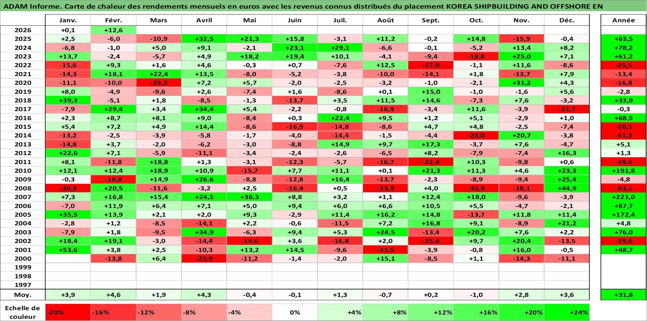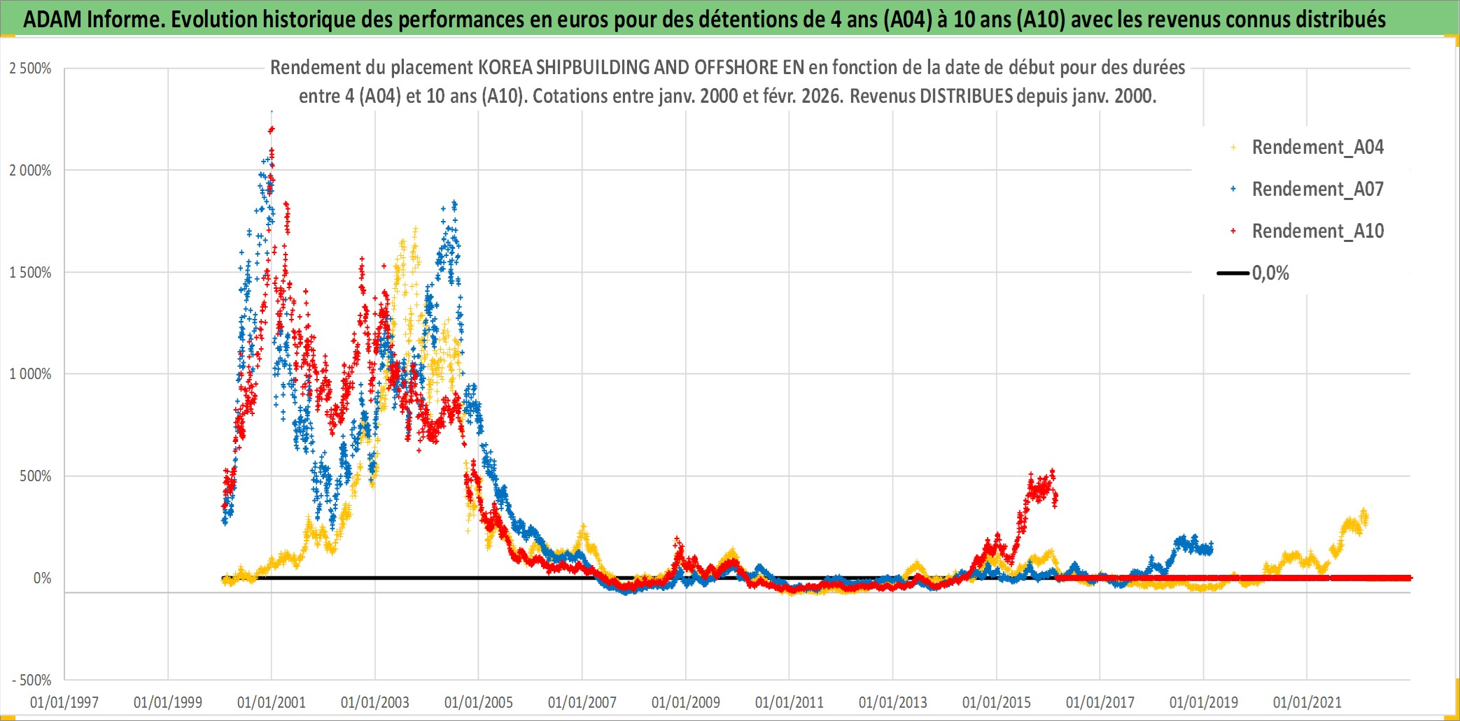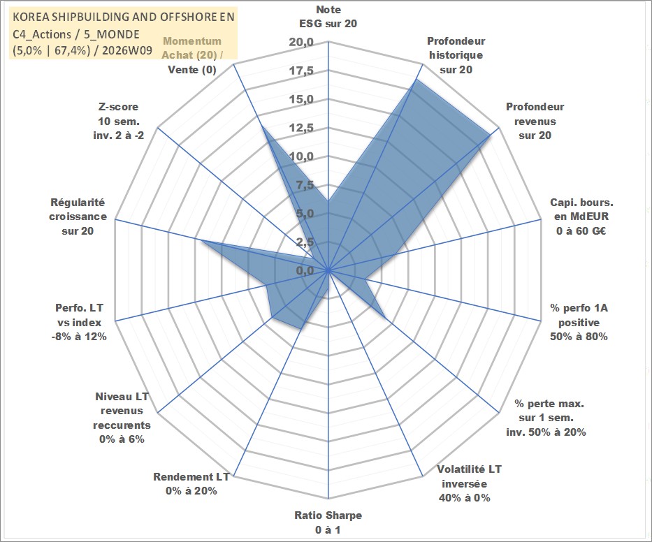 Site dédié aux investisseursPage dédiée sur site financeAnalyse des valorisations hebdomadaires de l'action KOREA SHIPBUILDING AND OFFSHORE EN. Cet actif est cote en KRW. Les valorisations sont en contrevaleur EURO et couvrent les semaines 2000W02 a 2026W09. Les revenus de cet actif financier sont pris en compte depuis la semaine 2000W01. La note globale ESG de cet actif est estimee a 6.0 (apres rebasage entre 0 et 20).