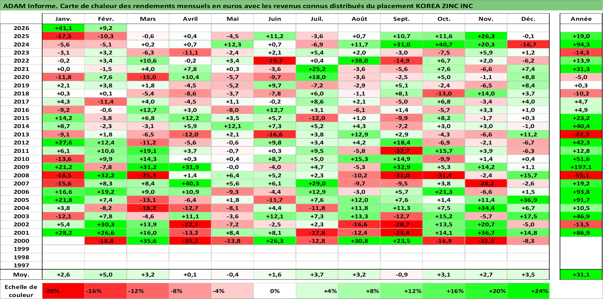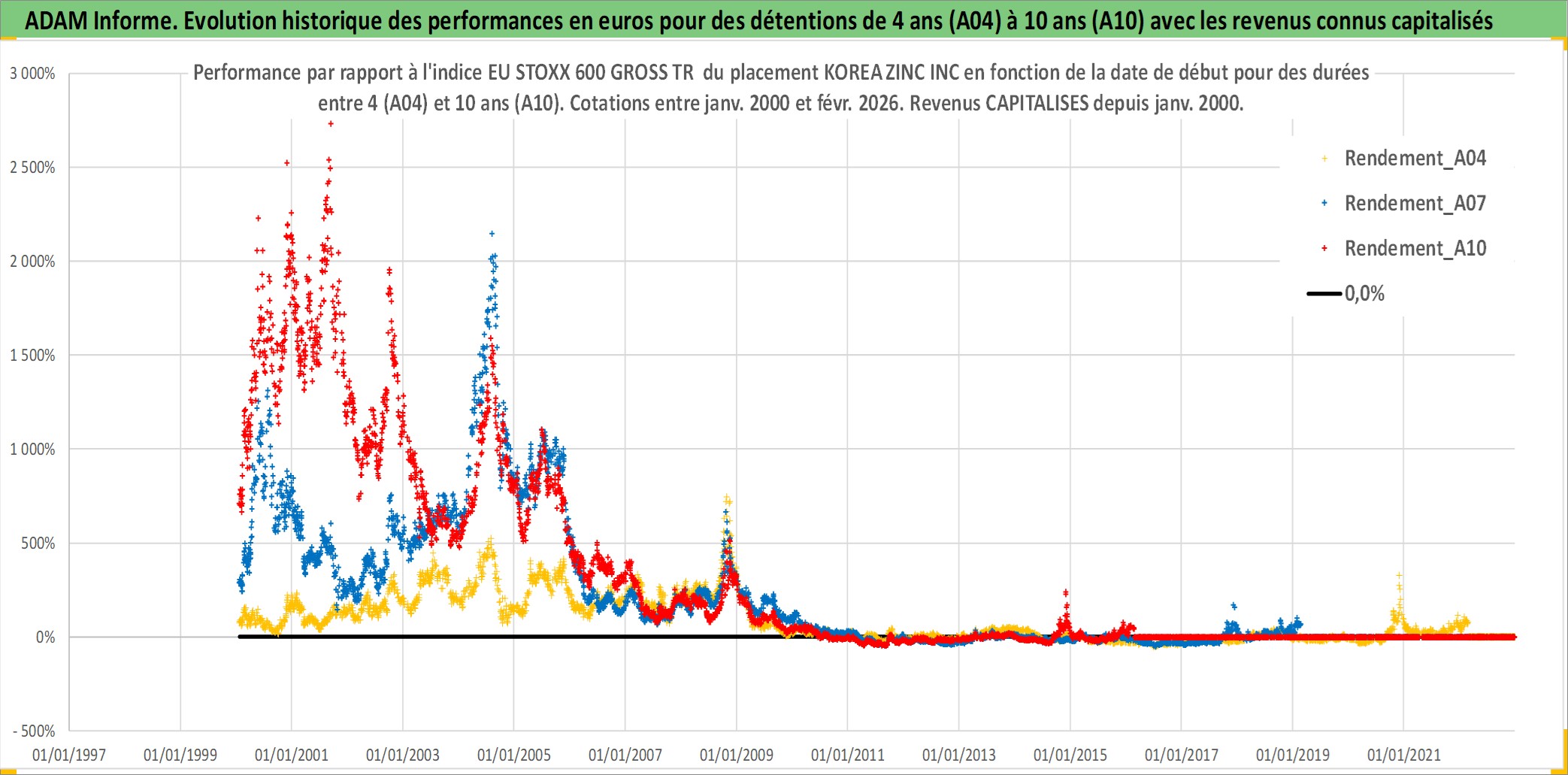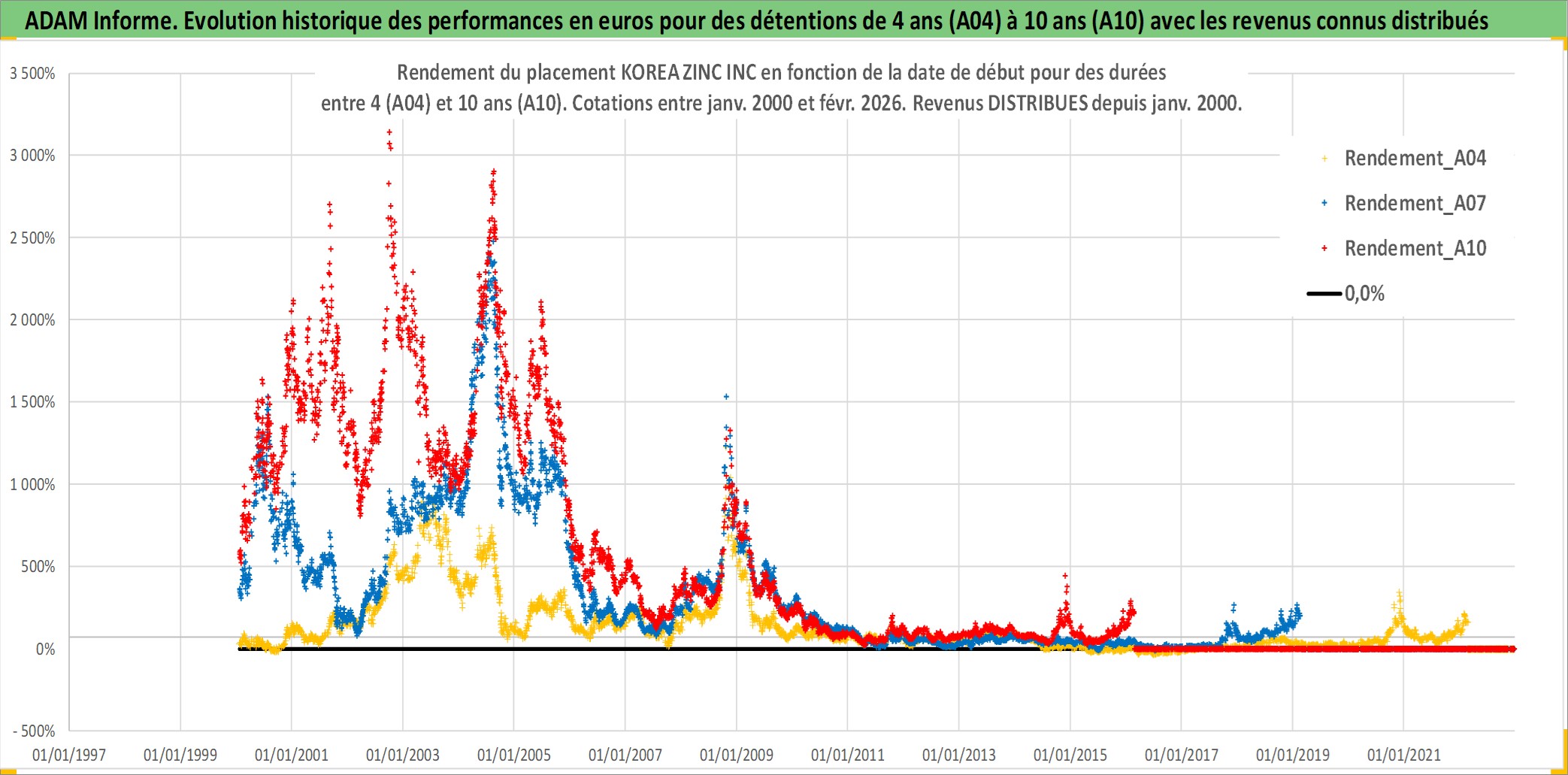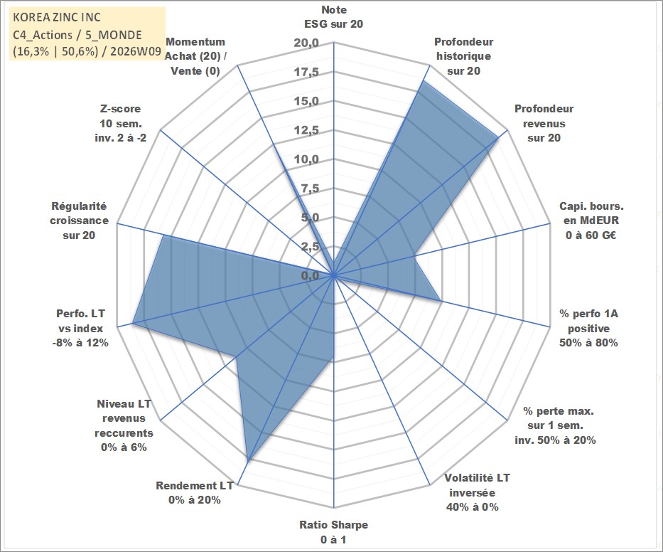 Site dédié aux investisseursPage dédiée sur site financeAnalyse des valorisations hebdomadaires de l'action KOREA ZINC INC. Cet actif est cote en KRW. Les valorisations sont en contrevaleur EURO et couvrent les semaines 2000W02 a 2026W09. Les revenus de cet actif financier sont pris en compte depuis la semaine 2000W01. La note globale ESG de cet actif est estimee a 1.0 (apres rebasage entre 0 et 20).