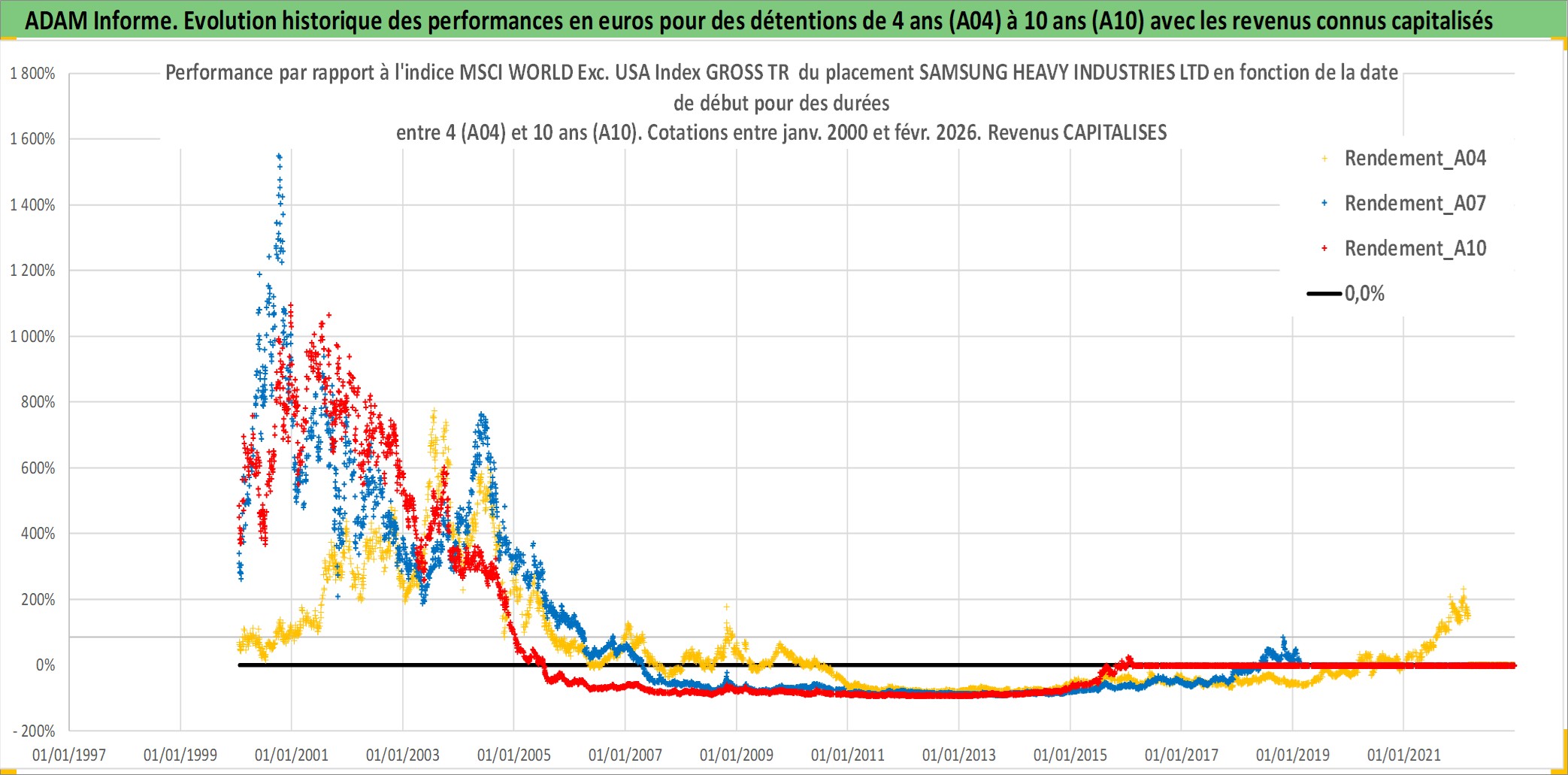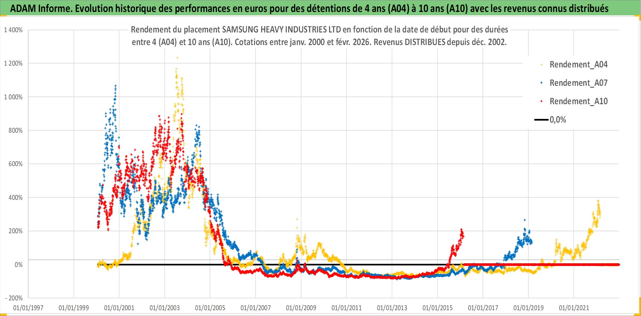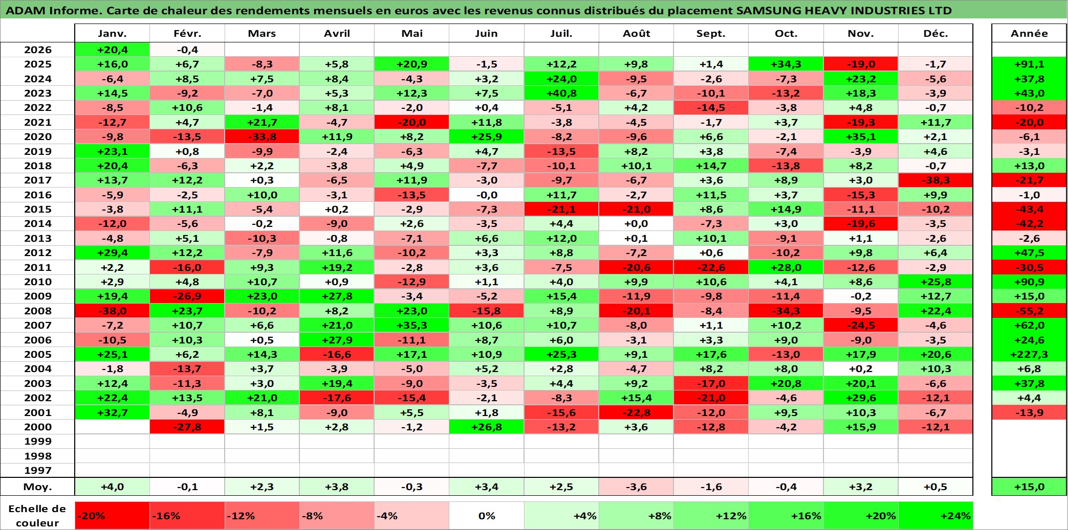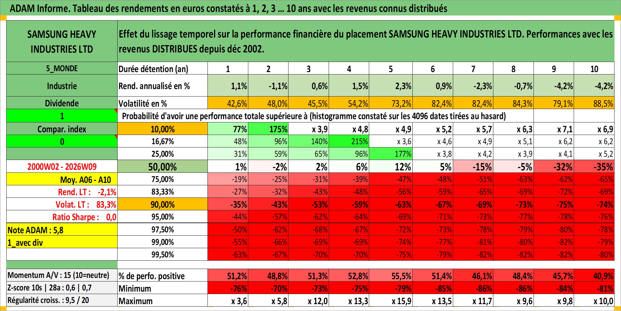 Site dédié aux investisseursPage dédiée sur site financeAnalyse des valorisations hebdomadaires de l'action SAMSUNG HEAVY INDUSTRIES LTD. Cet actif est cote en KRW. Les valorisations sont en contrevaleur EURO et couvrent les semaines 2000W02 a 2026W09. Les revenus de cet actif financier sont pris en compte depuis la semaine 2002W52. La note ESG de cet actif n'est pas connue.
