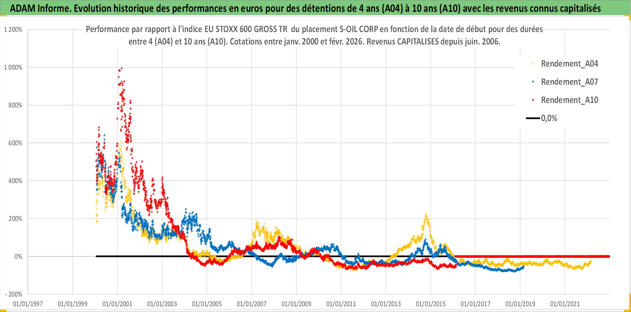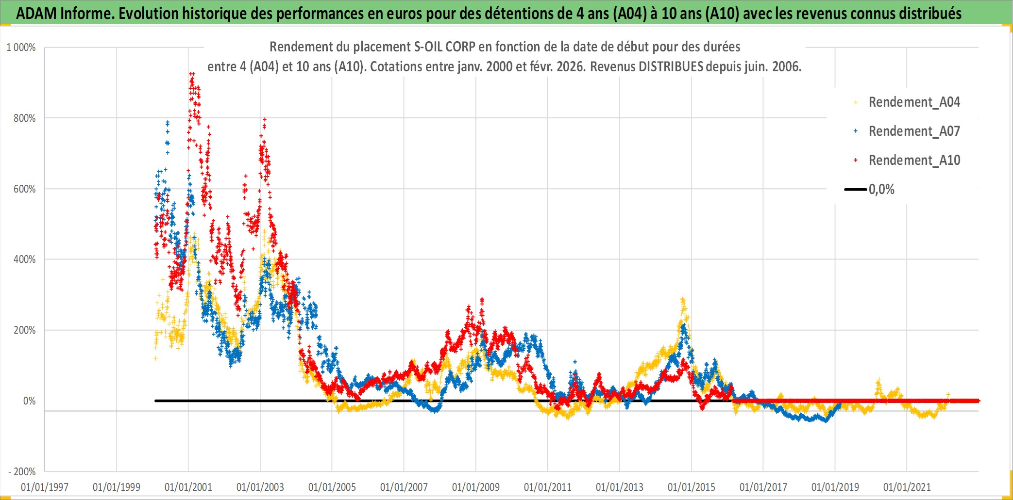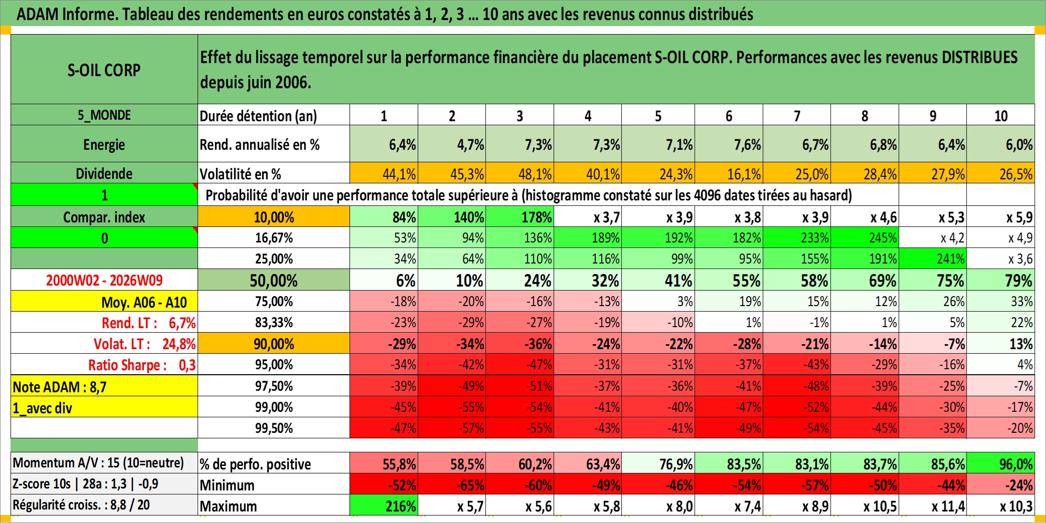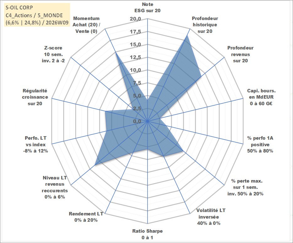 Site dédié aux investisseursPage dédiée sur site financeAnalyse des valorisations hebdomadaires de l'action S-OIL CORP. Cet actif est cote en KRW. Les valorisations sont en contrevaleur EURO et couvrent les semaines 2000W02 a 2026W09. Les revenus de cet actif financier sont pris en compte depuis la semaine 2006W26. La note globale ESG de cet actif est estimee a 4.0 (apres rebasage entre 0 et 20).