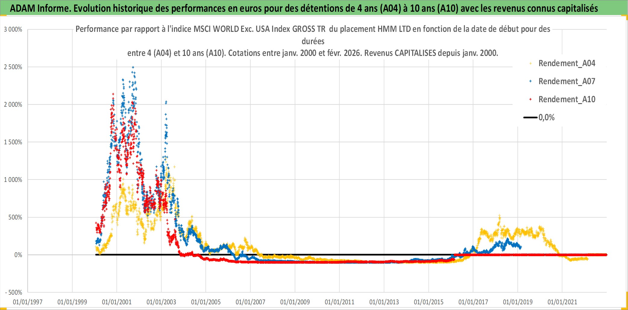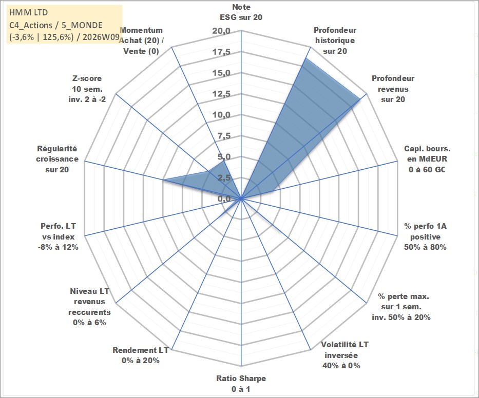 Site dédié aux investisseursPage dédiée sur site financeAnalyse des valorisations hebdomadaires de l'action HMM LTD. Cet actif est cote en KRW. Les valorisations sont en contrevaleur EURO et couvrent les semaines 2000W02 a 2026W09. Les revenus de cet actif financier sont pris en compte depuis la semaine 2000W01. La note ESG de cet actif n'est pas connue.
