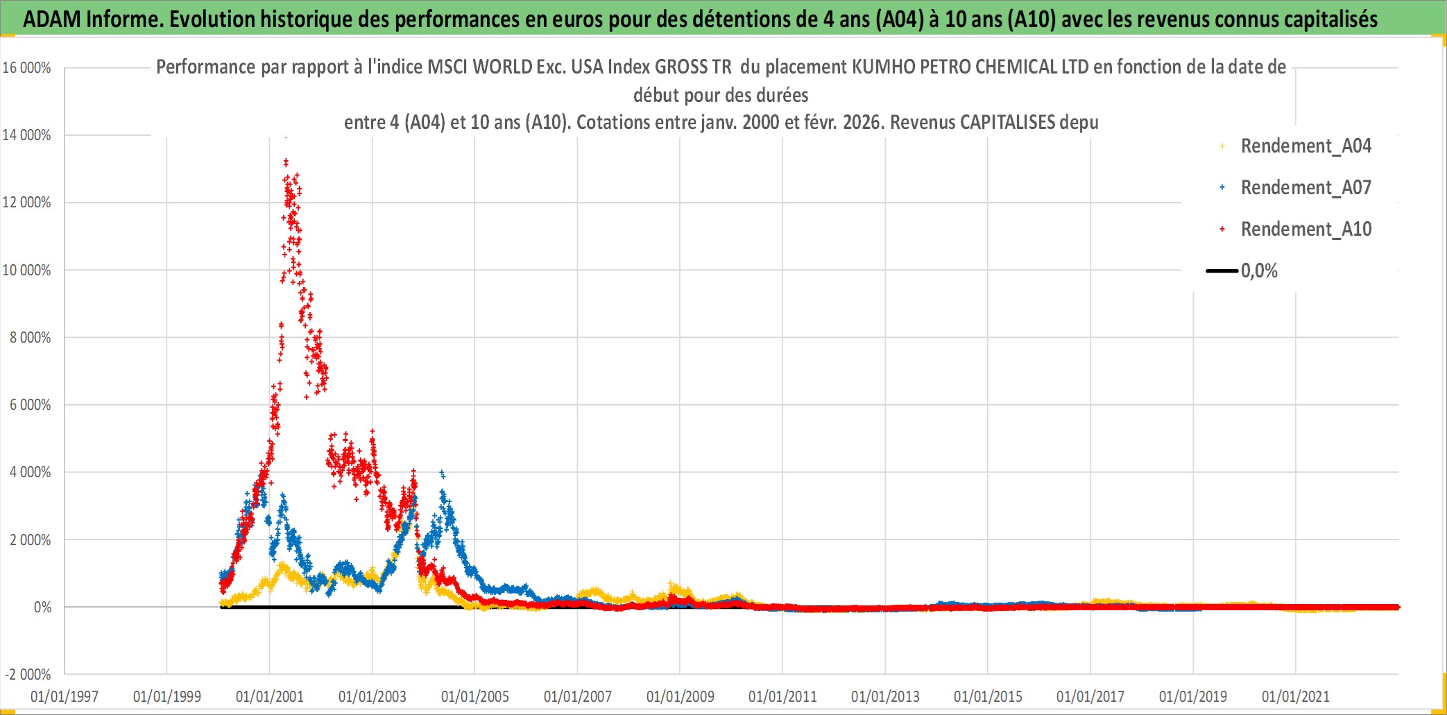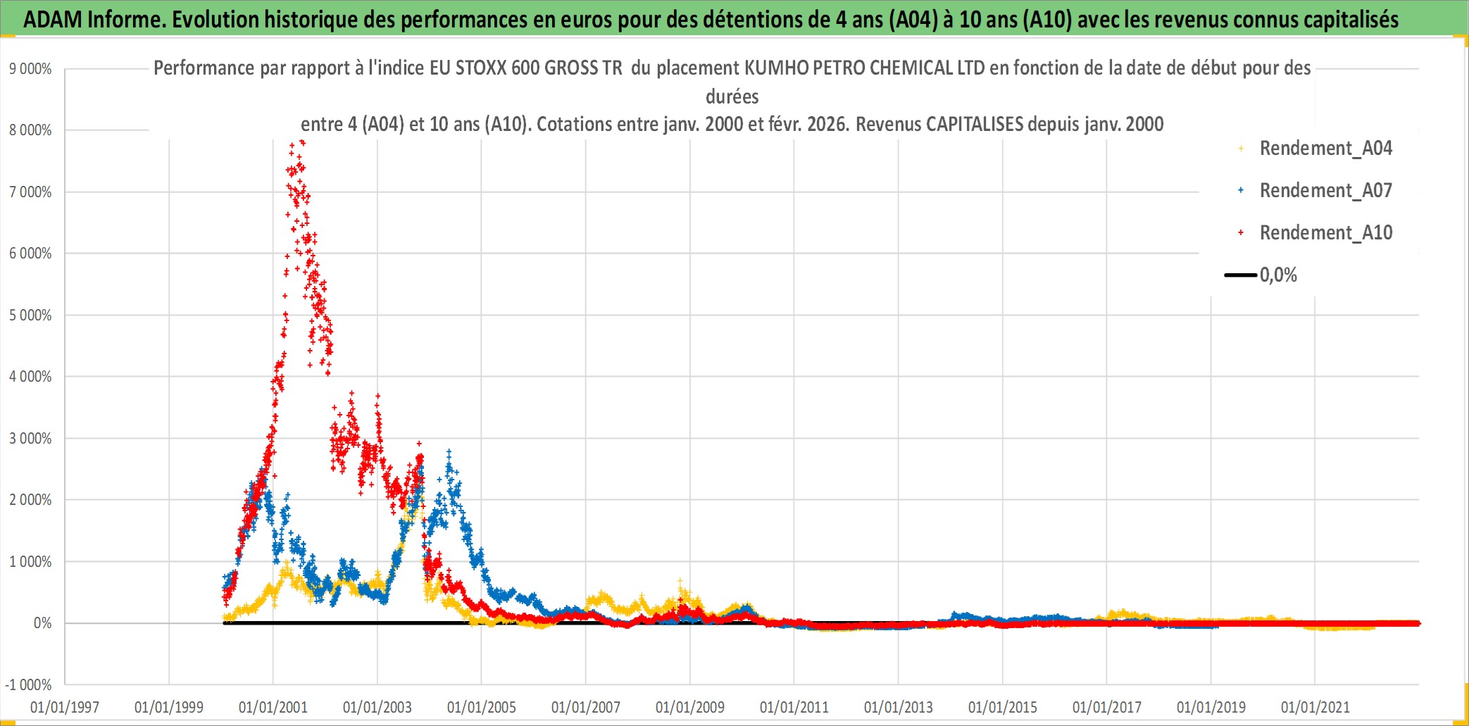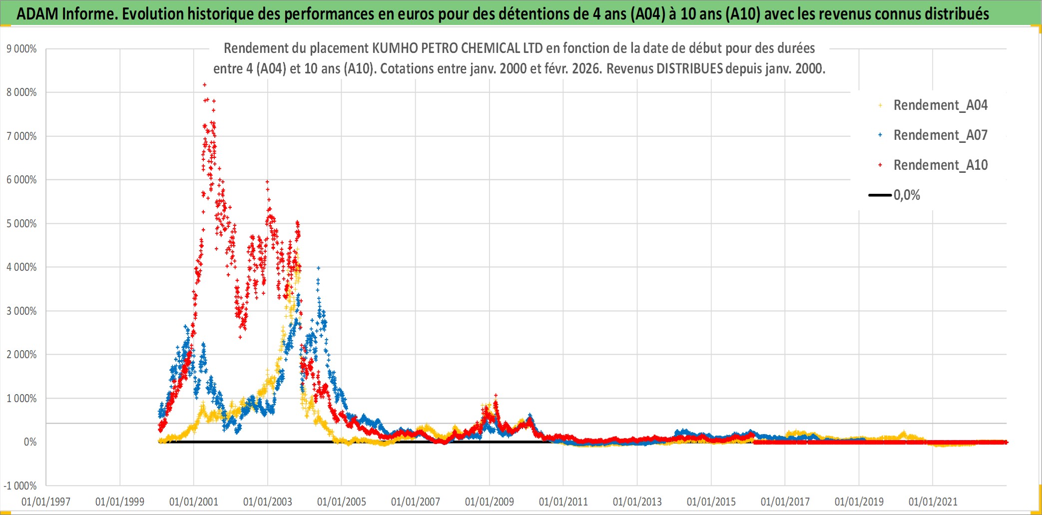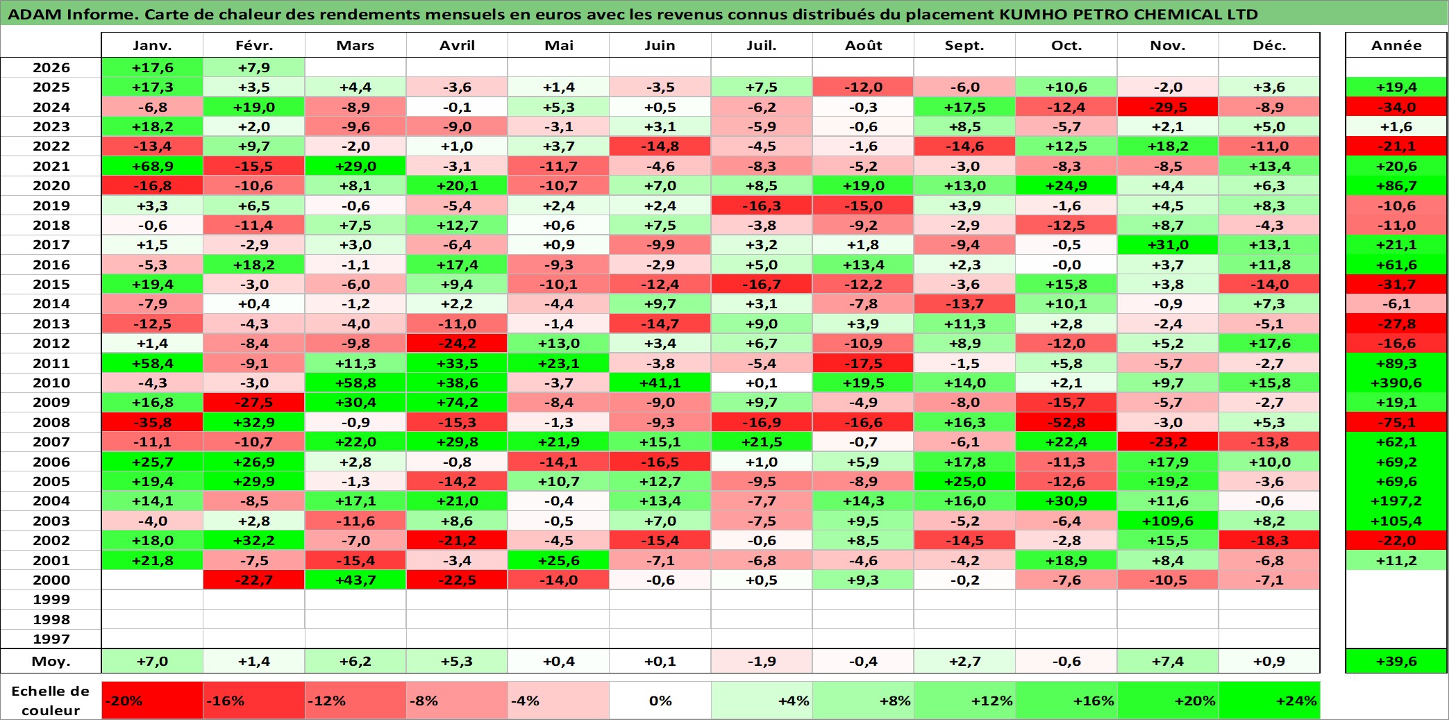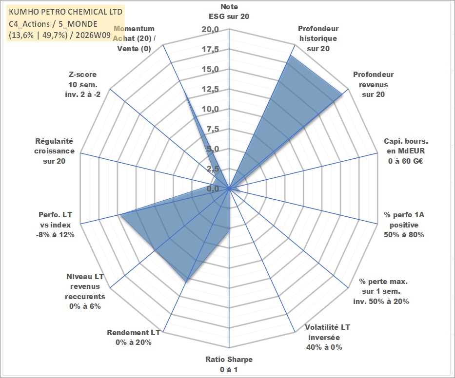 Site dédié aux investisseursPage dédiée sur site financeAnalyse des valorisations hebdomadaires de l'action KUMHO PETRO CHEMICAL LTD. Cet actif est cote en KRW. Les valorisations sont en contrevaleur EURO et couvrent les semaines 2000W02 a 2026W09. Les revenus de cet actif financier sont pris en compte depuis la semaine 2000W01. La note ESG de cet actif n'est pas connue.