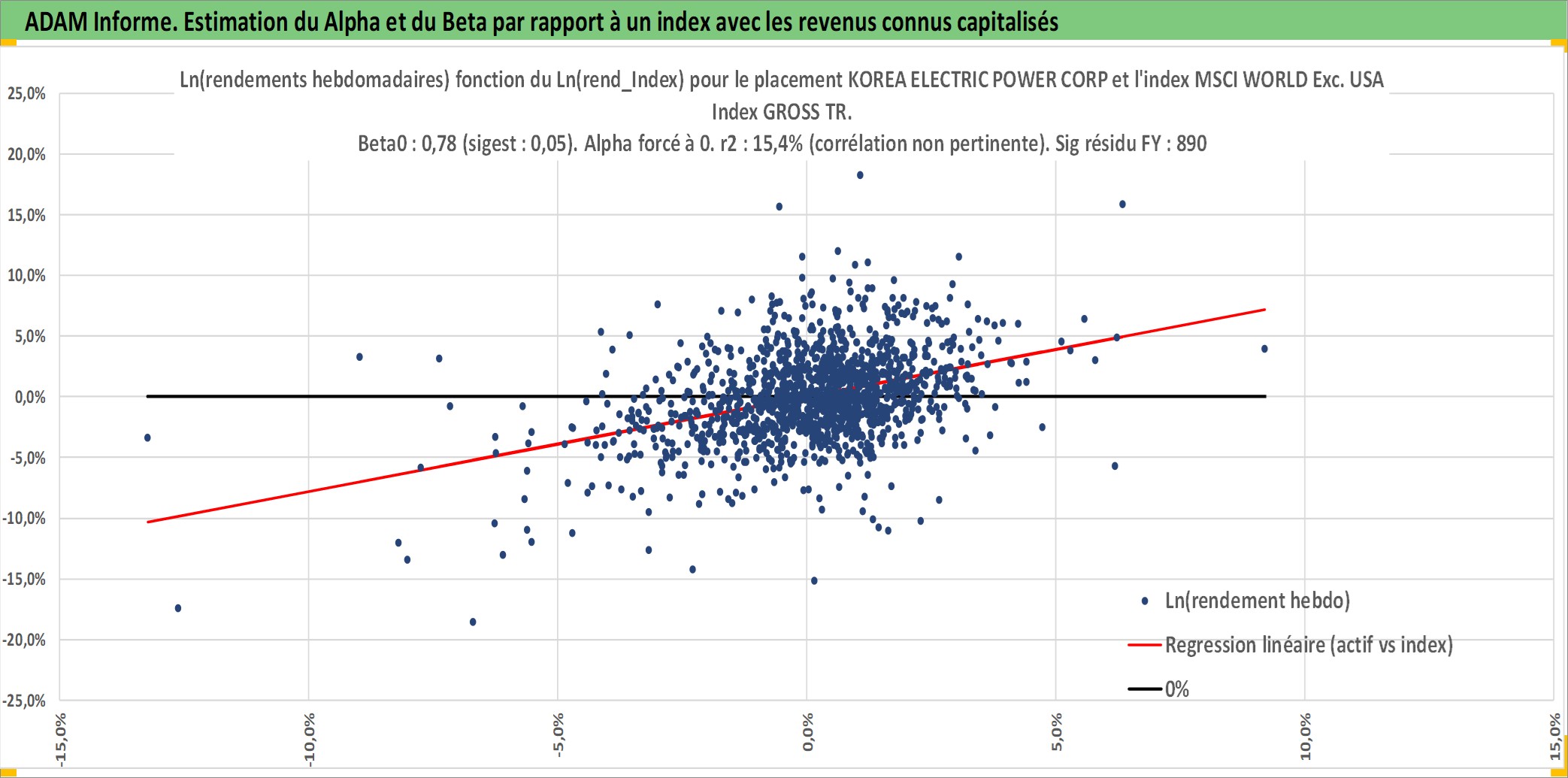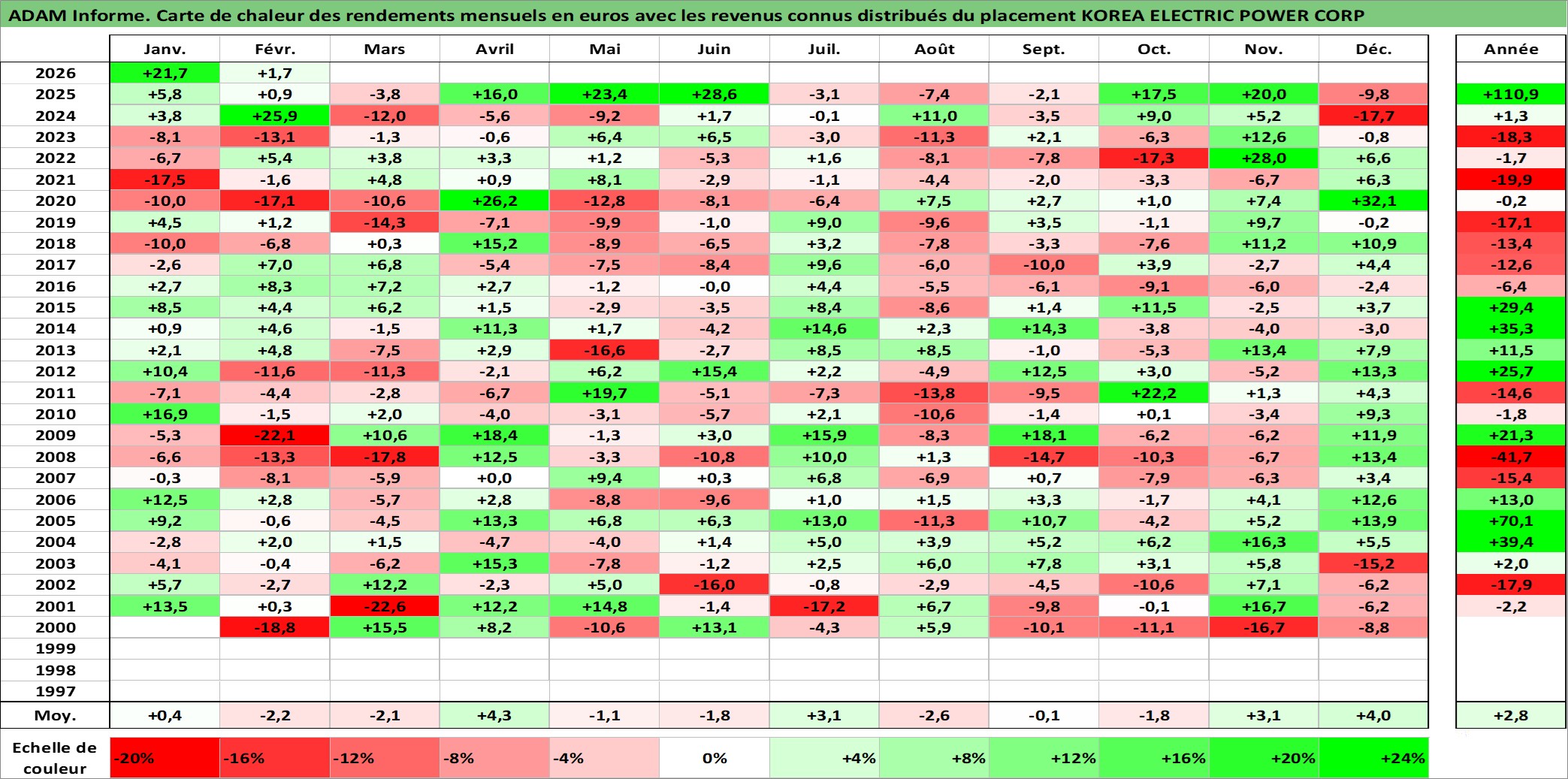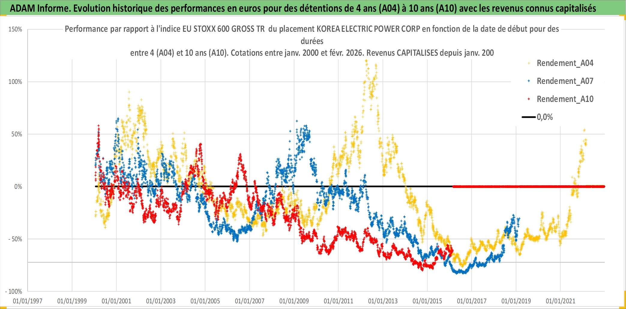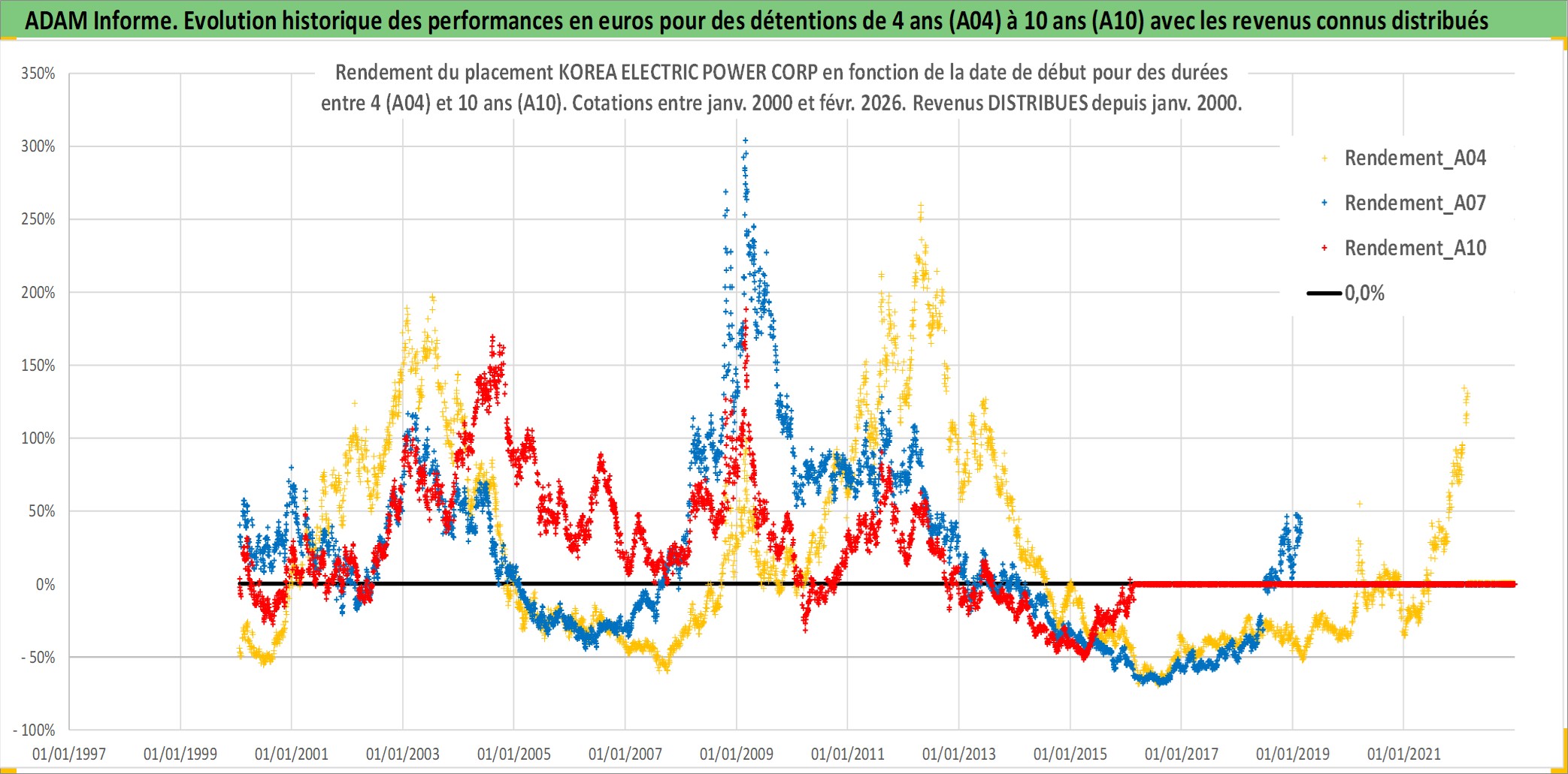 Site dédié aux investisseursPage dédiée sur site financeAnalyse des valorisations hebdomadaires de l'action KOREA ELECTRIC POWER CORP. Cet actif est cote en KRW. Les valorisations sont en contrevaleur EURO et couvrent les semaines 2000W02 a 2026W09. Les revenus de cet actif financier sont pris en compte depuis la semaine 2000W01. La note globale ESG de cet actif est estimee a 4.0 (apres rebasage entre 0 et 20).