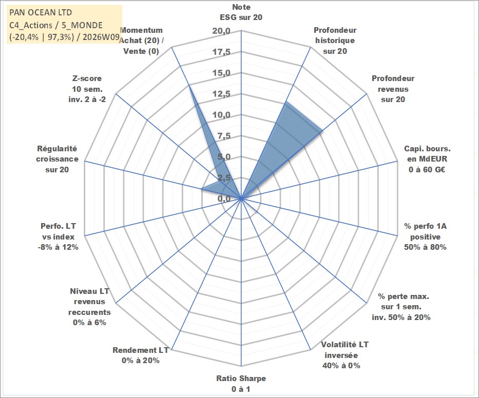Site dédié aux investisseursPage dédiée sur site financeAnalyse des valorisations hebdomadaires de l'action PAN OCEAN LTD. Cet actif est cote en KRW. Les valorisations sont en contrevaleur EURO et couvrent les semaines 2007W39 a 2026W09. Les revenus de cet actif financier sont pris en compte depuis la semaine 2007W52. La note ESG de cet actif n'est pas connue.