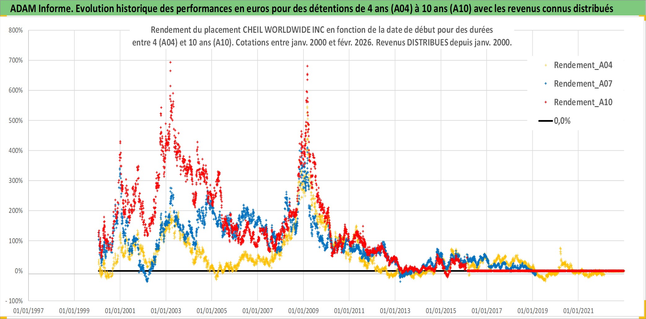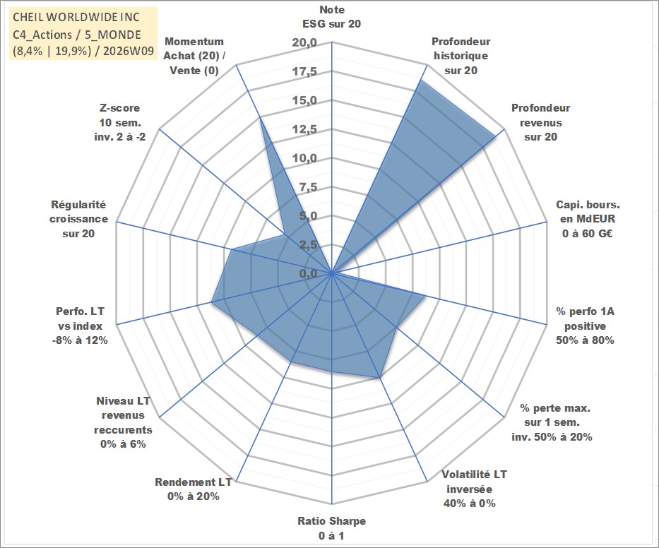 Site dédié aux investisseursPage dédiée sur site financeAnalyse des valorisations hebdomadaires de l'action CHEIL WORLDWIDE INC. Cet actif est cote en KRW. Les valorisations sont en contrevaleur EURO et couvrent les semaines 2000W02 a 2026W09. Les revenus de cet actif financier sont pris en compte depuis la semaine 2000W01. La note ESG de cet actif n'est pas connue.