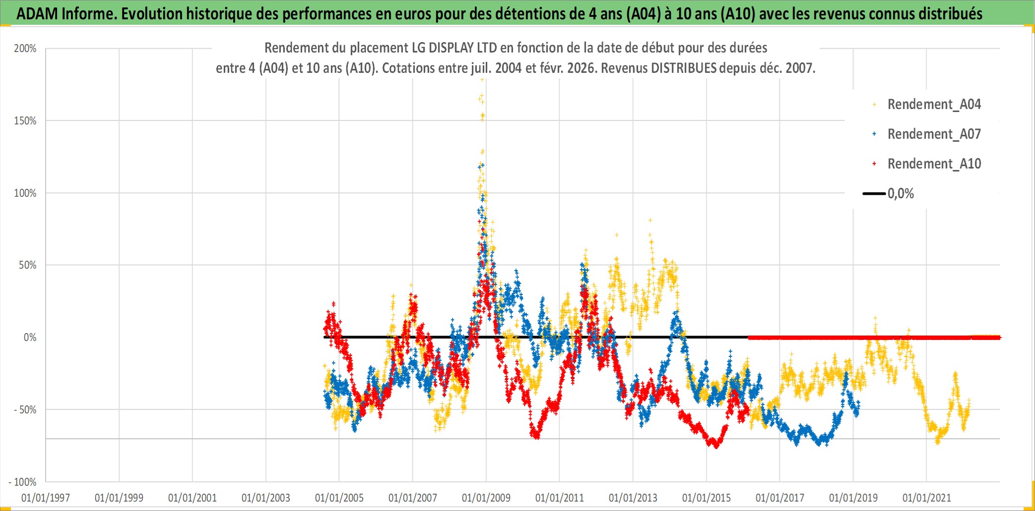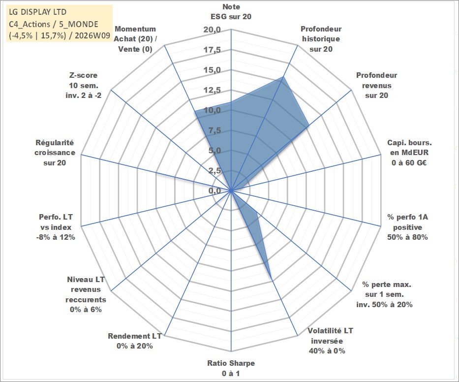 Site dédié aux investisseursPage dédiée sur site financeAnalyse des valorisations hebdomadaires de l'action LG DISPLAY LTD. Cet actif est cote en KRW. Les valorisations sont en contrevaleur EURO et couvrent les semaines 2004W31 a 2026W09. Les revenus de cet actif financier sont pris en compte depuis la semaine 2007W52. La note globale ESG de cet actif est estimee a 11.0 (apres rebasage entre 0 et 20).