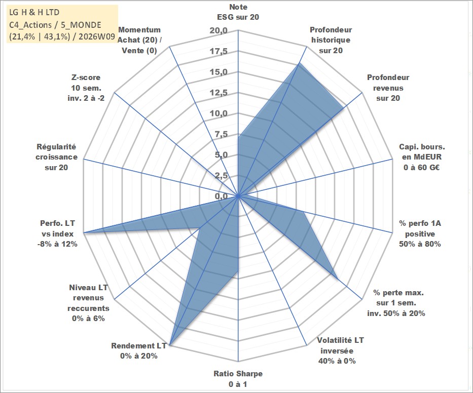 Site dédié aux investisseursPage dédiée sur site financeAnalyse des valorisations hebdomadaires de l'action LG H & H LTD. Cet actif est cote en KRW. Les valorisations sont en contrevaleur EURO et couvrent les semaines 2001W19 a 2026W09. Les revenus de cet actif financier sont pris en compte depuis la semaine 2001W52. La note globale ESG de cet actif est estimee a 7.0 (apres rebasage entre 0 et 20).