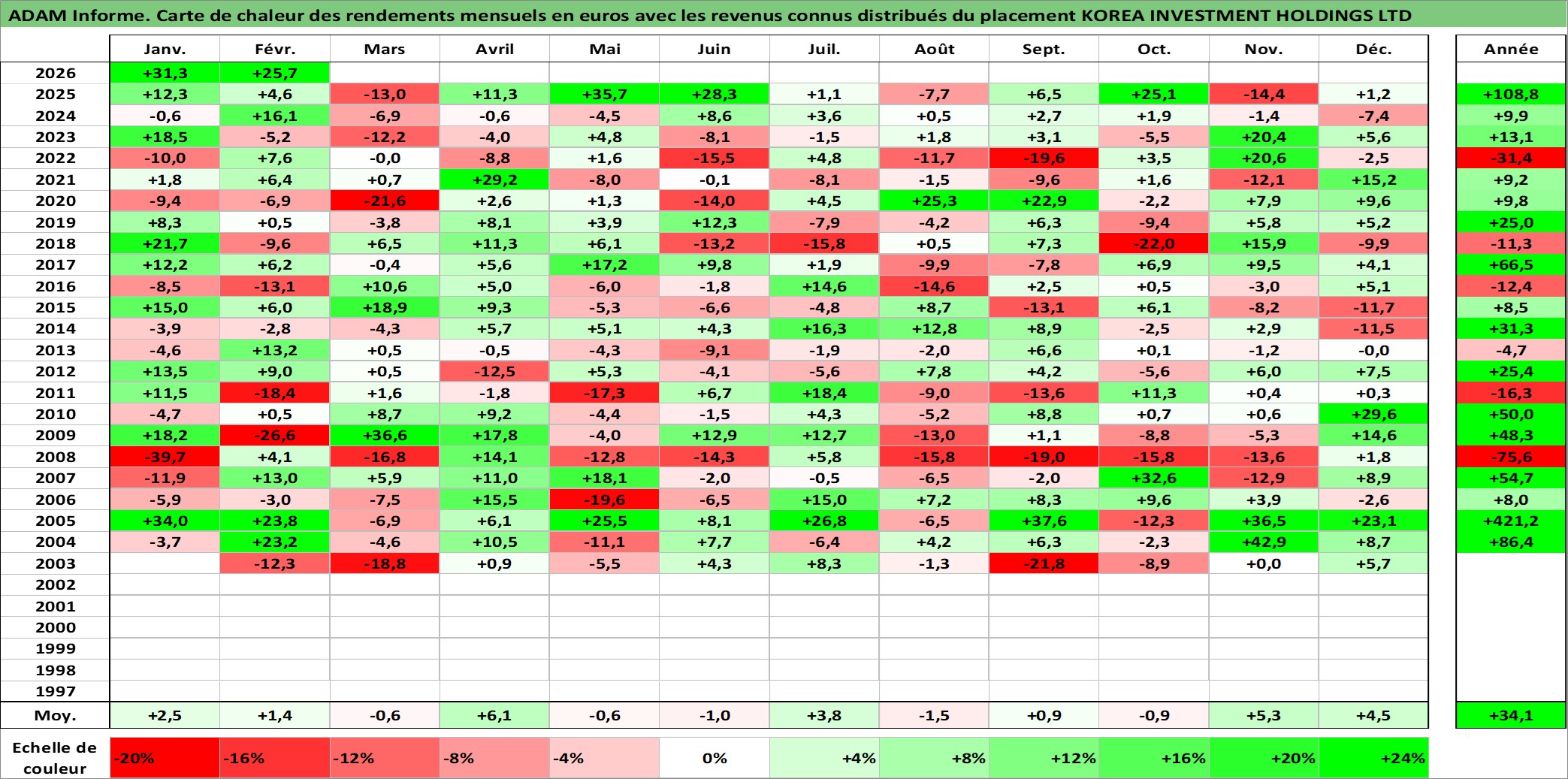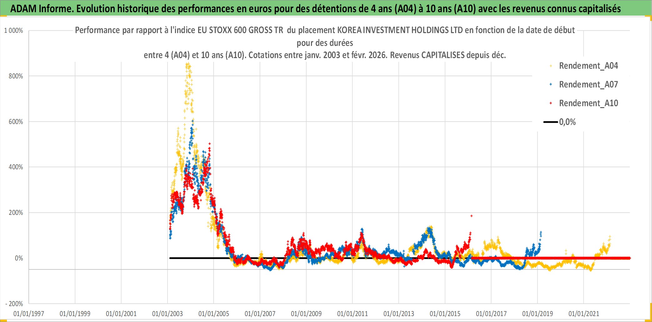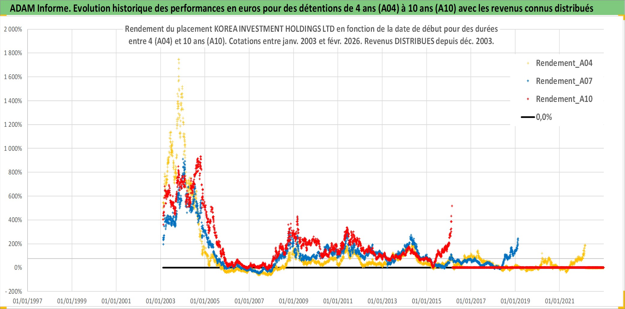 Site dédié aux investisseursPage dédiée sur site financeAnalyse des valorisations hebdomadaires de l'action KOREA INVESTMENT HOLDINGS LTD. Cet actif est cote en KRW. Les valorisations sont en contrevaleur EURO et couvrent les semaines 2003W05 a 2026W09. Les revenus de cet actif financier sont pris en compte depuis la semaine 2004W01. La note ESG de cet actif n'est pas connue.