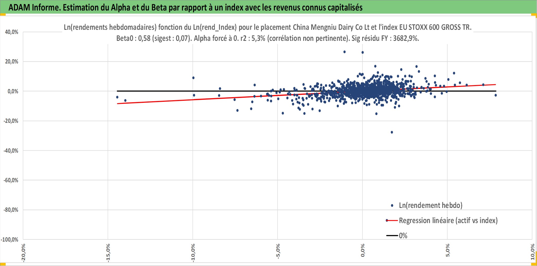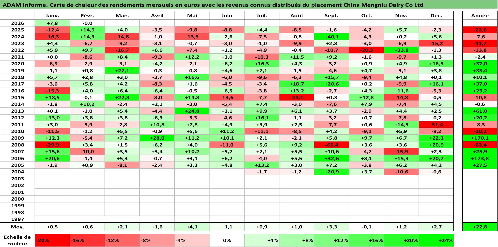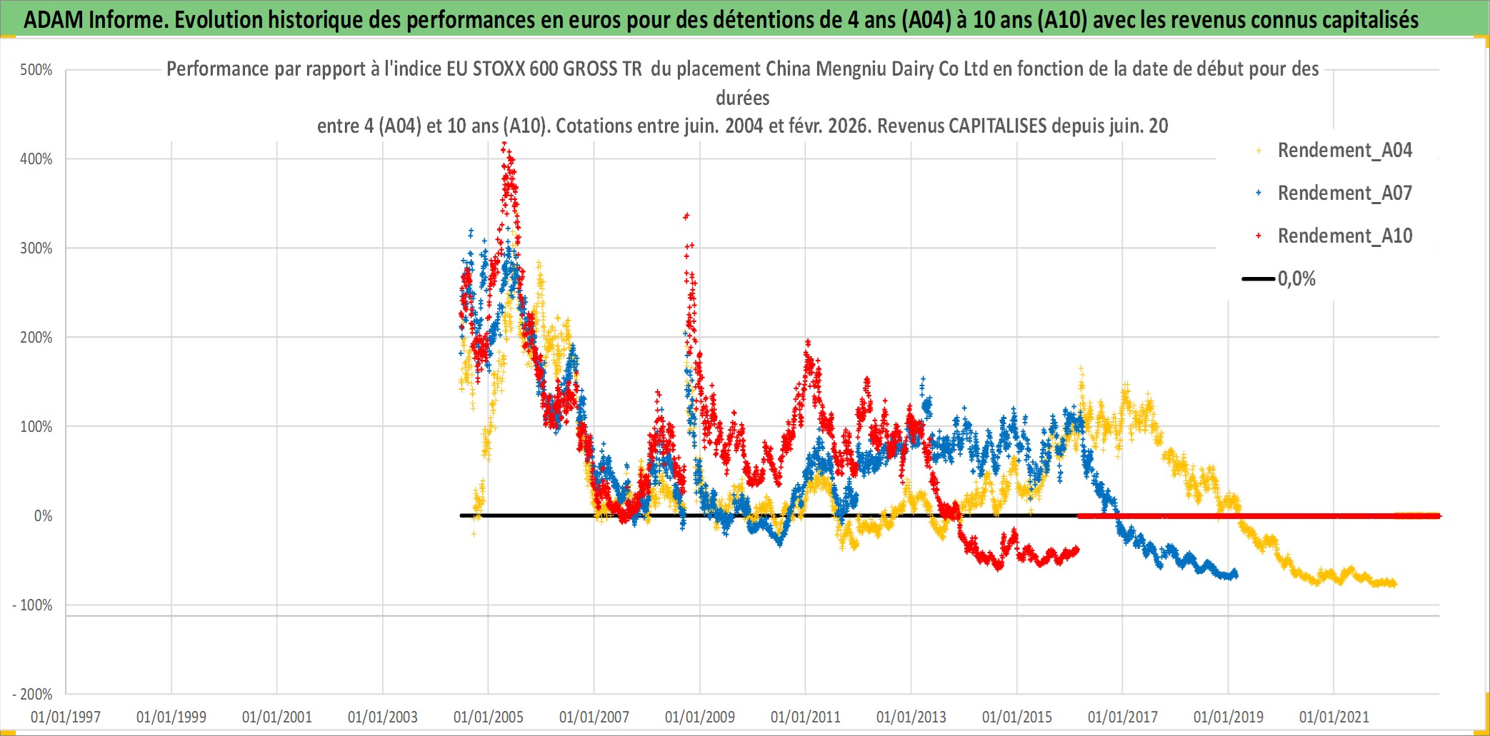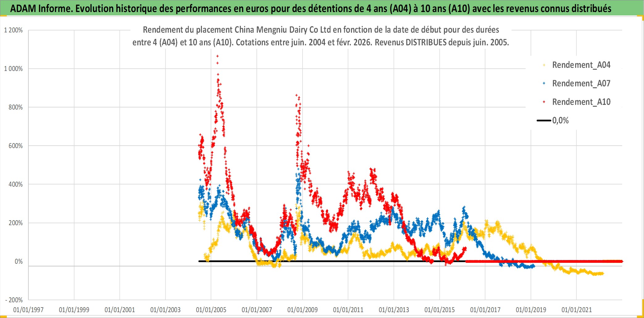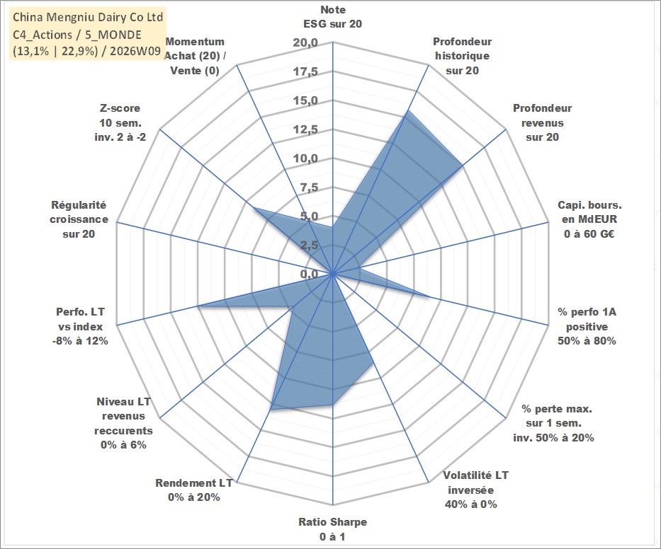 Site dédié aux investisseursPage dédiée sur site financeAnalyse des valorisations hebdomadaires de l'action China Mengniu Dairy Co Ltd. Cet actif est cote en HKD. Les valorisations sont en contrevaleur EURO et couvrent les semaines 2004W24 a 2026W09. Les revenus de cet actif financier sont pris en compte depuis la semaine 2005W25. La note globale ESG de cet actif est estimee a 4.0 (apres rebasage entre 0 et 20).