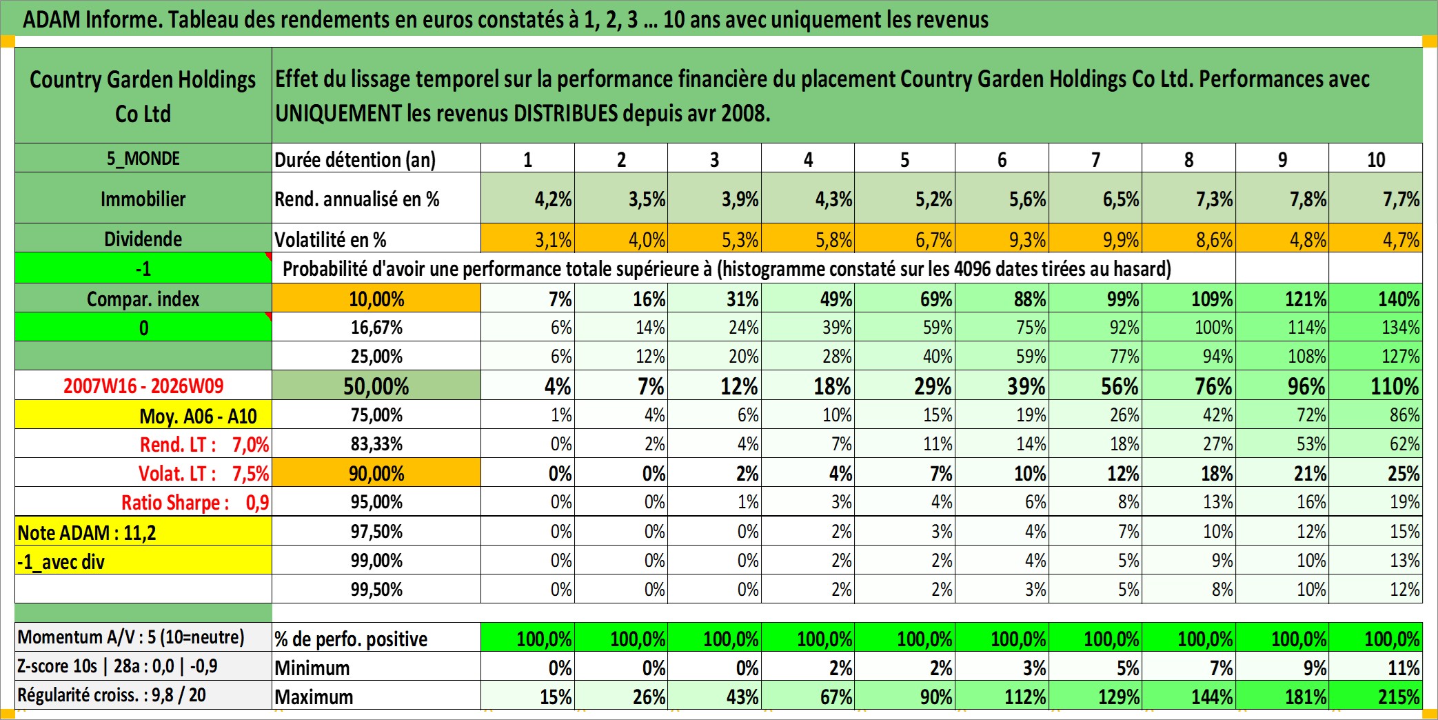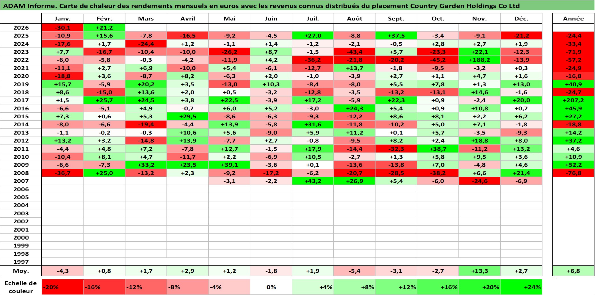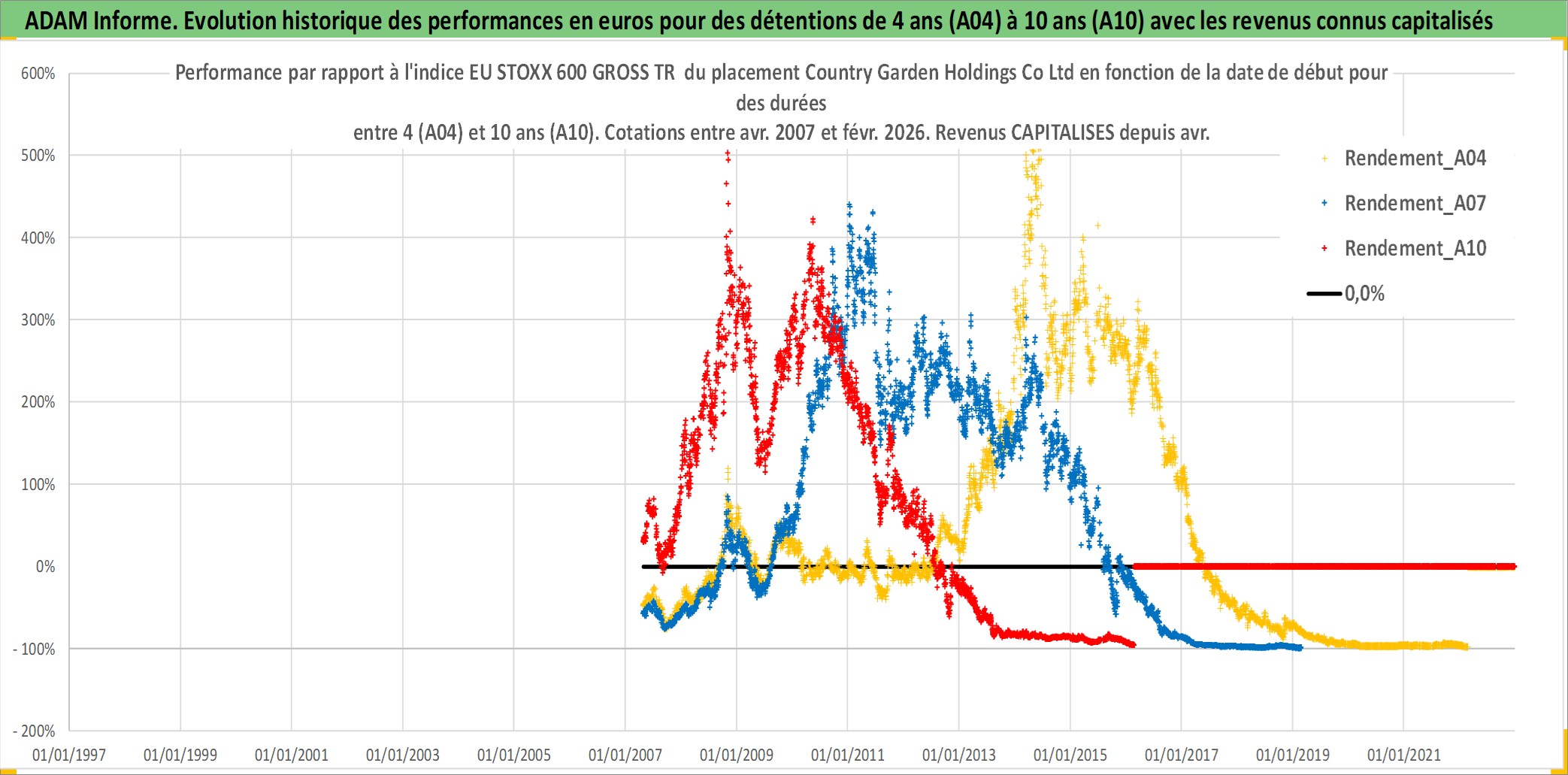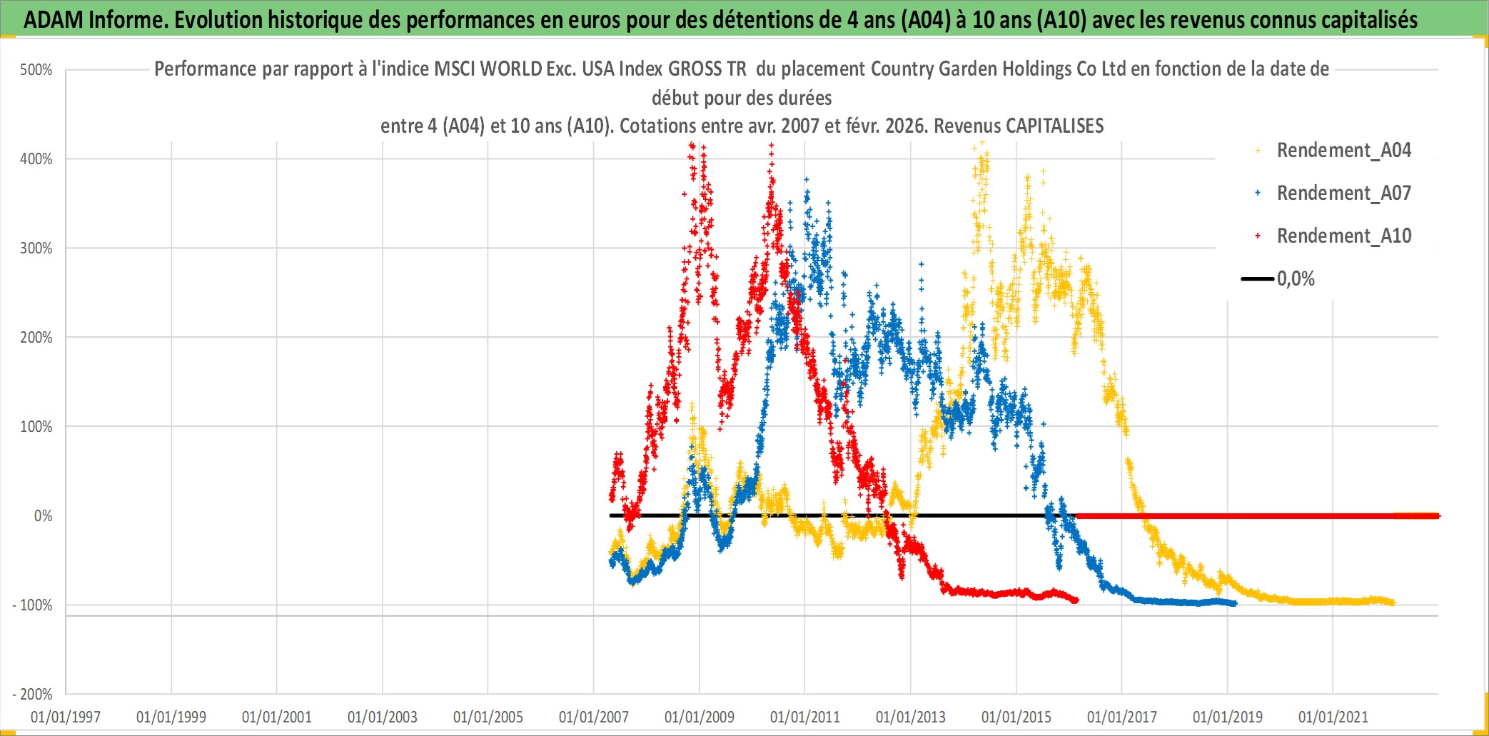 Site dédié aux investisseursPage dédiée sur site financeAnalyse des valorisations hebdomadaires de l'action Country Garden Holdings Co Ltd. Cet actif est cote en HKD. Les valorisations sont en contrevaleur EURO et couvrent les semaines 2007W16 a 2026W09. Les revenus de cet actif financier sont pris en compte depuis la semaine 2008W15. La note globale ESG de cet actif est estimee a 9.0 (apres rebasage entre 0 et 20).