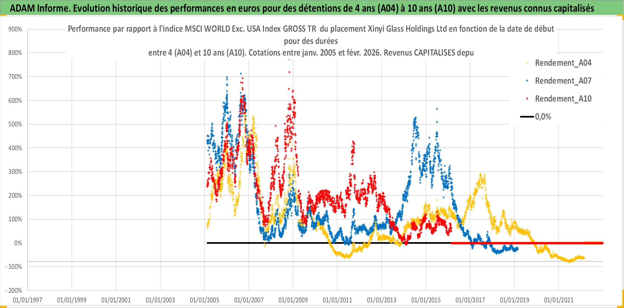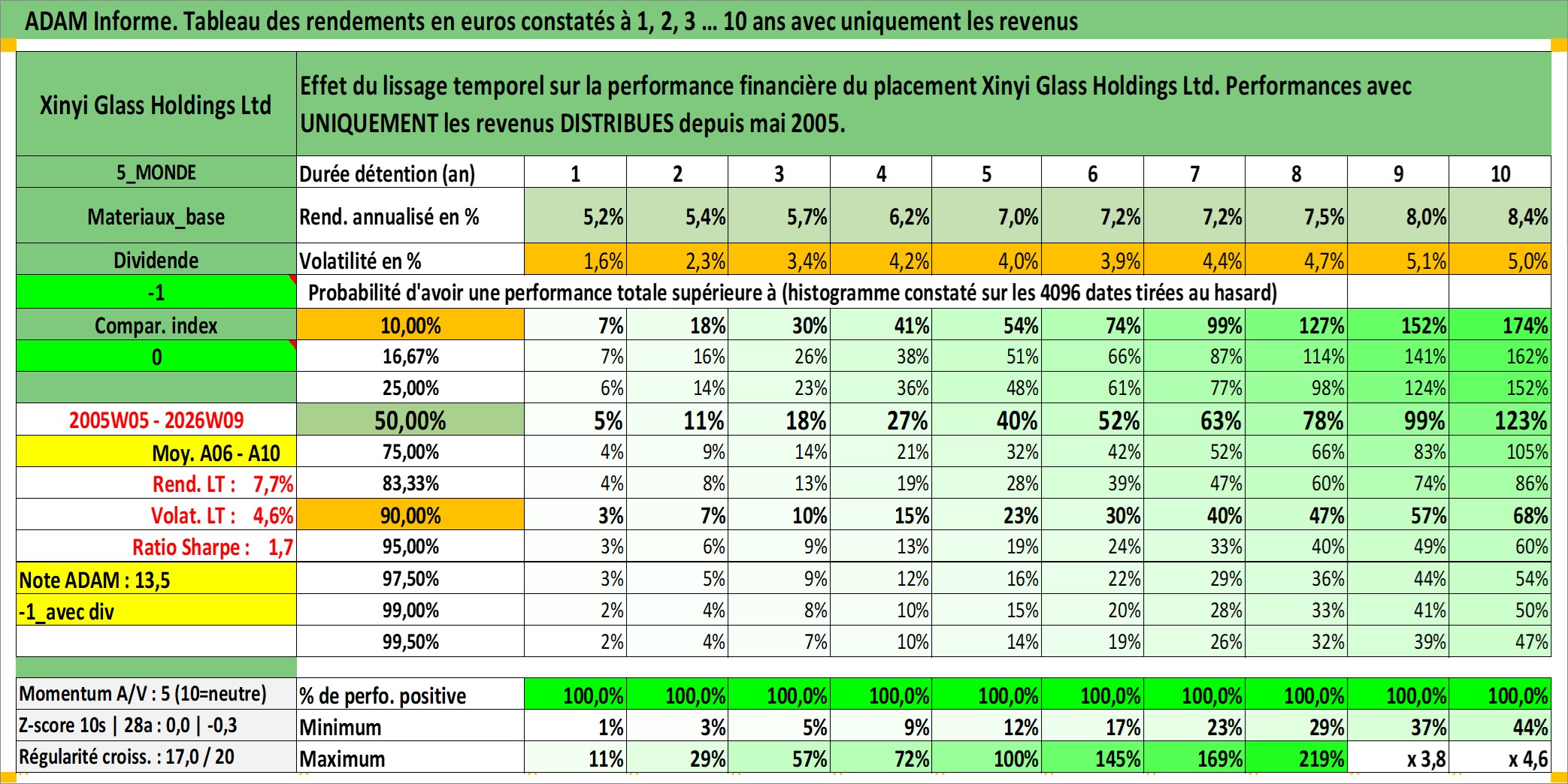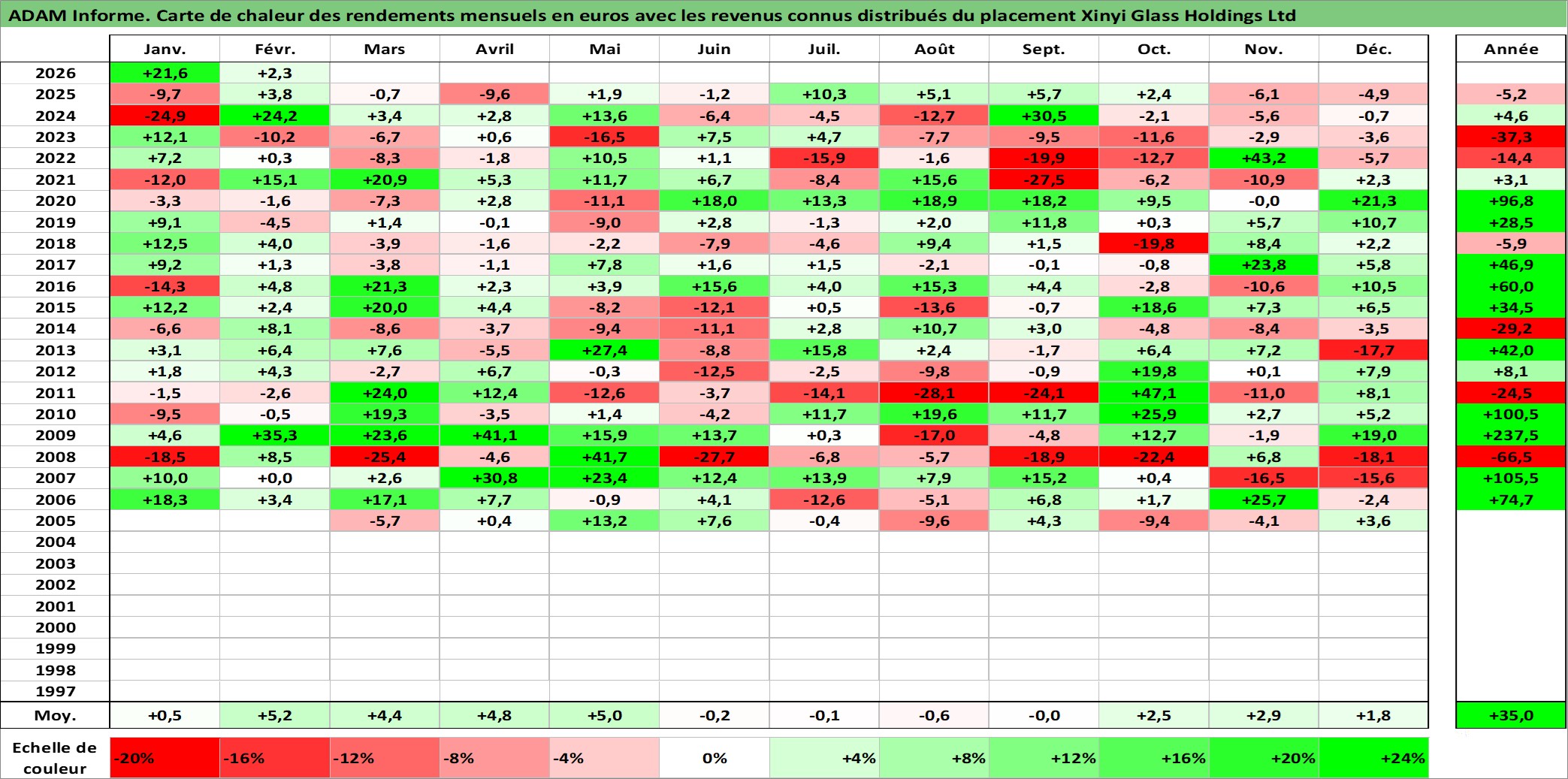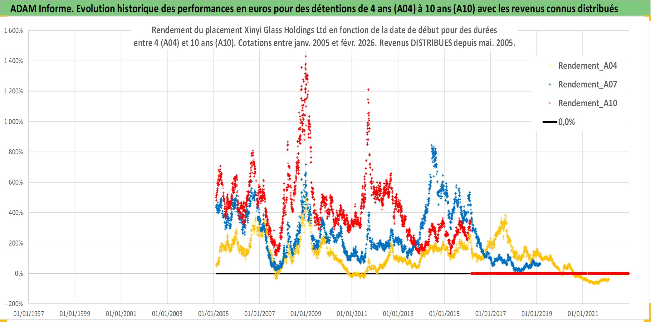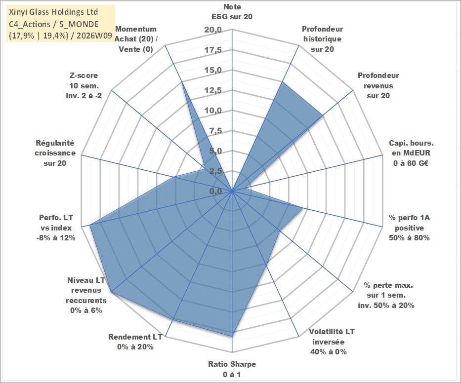 Site dédié aux investisseursPage dédiée sur site financeAnalyse des valorisations hebdomadaires de l'action Xinyi Glass Holdings Ltd. Cet actif est cote en HKD. Les valorisations sont en contrevaleur EURO et couvrent les semaines 2005W05 a 2026W09. Les revenus de cet actif financier sont pris en compte depuis la semaine 2005W19. La note ESG de cet actif n'est pas connue.