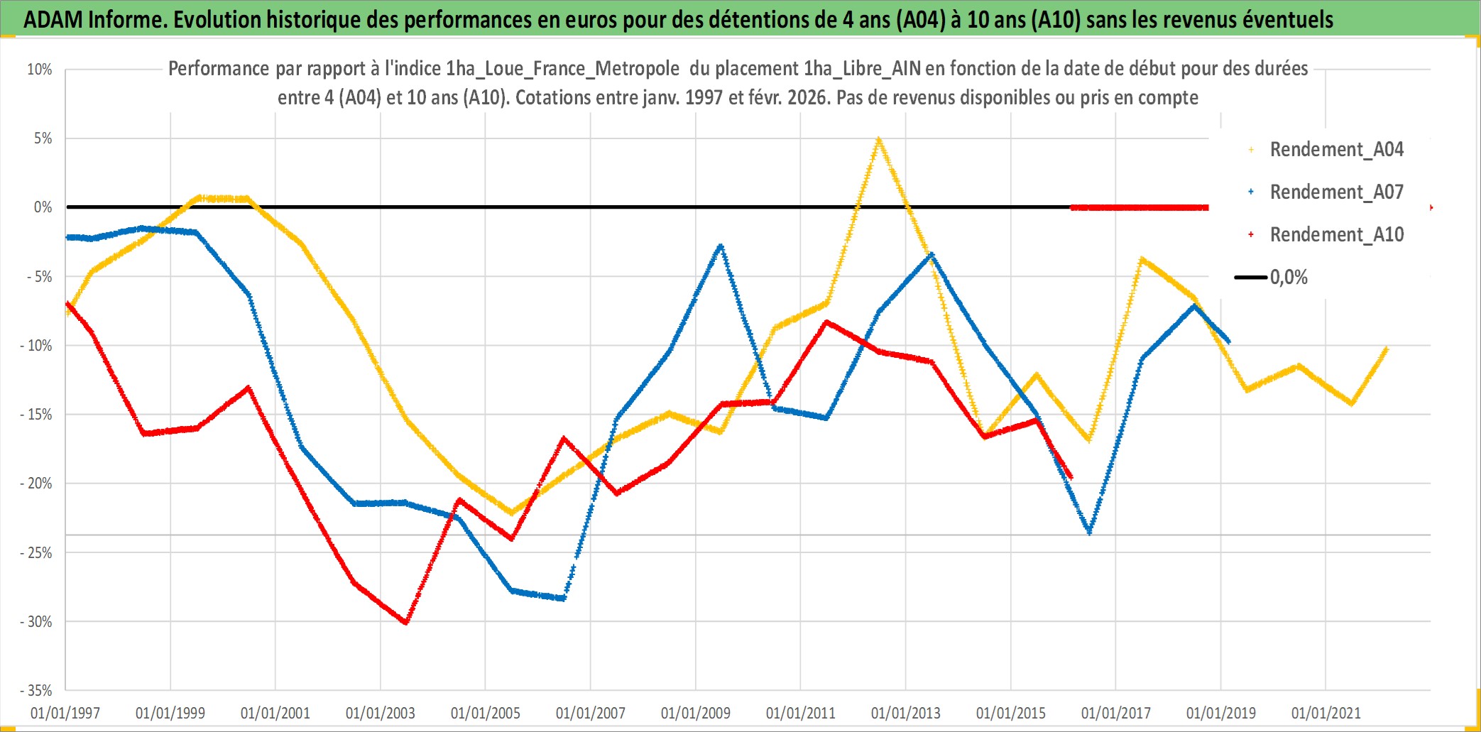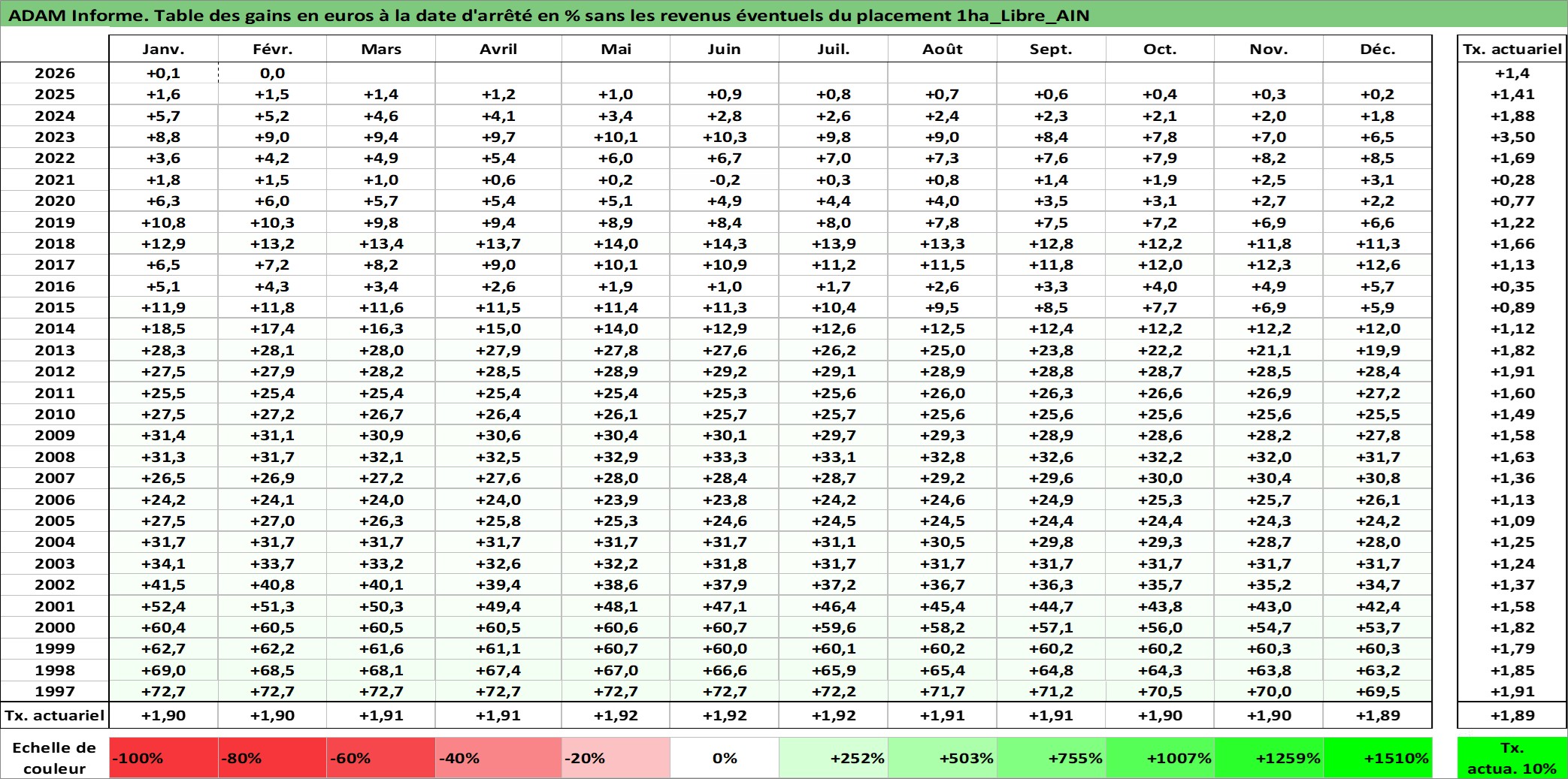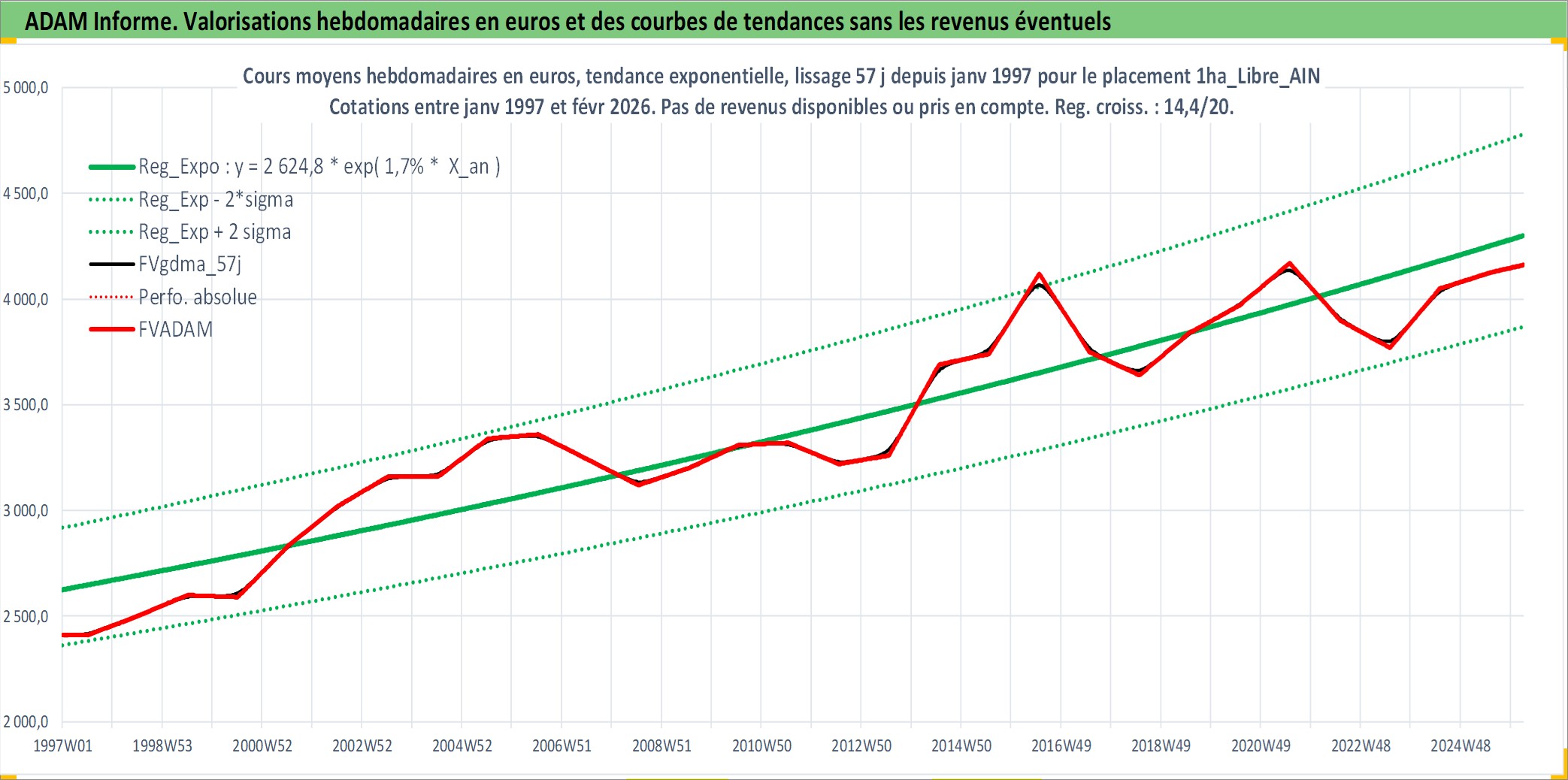 Site dédié aux investisseursPage dédiée sur site financeAnalyse des valorisations hebdomadaires de l'actif 1ha_Libre_AIN. Cet actif est cote en EUR. Les valorisations couvrent les semaines 1997W01 a 2026W09. Les fermages de ce bien foncier sont pris egaux a 2,5% annuels de la valeur venale du bien.
