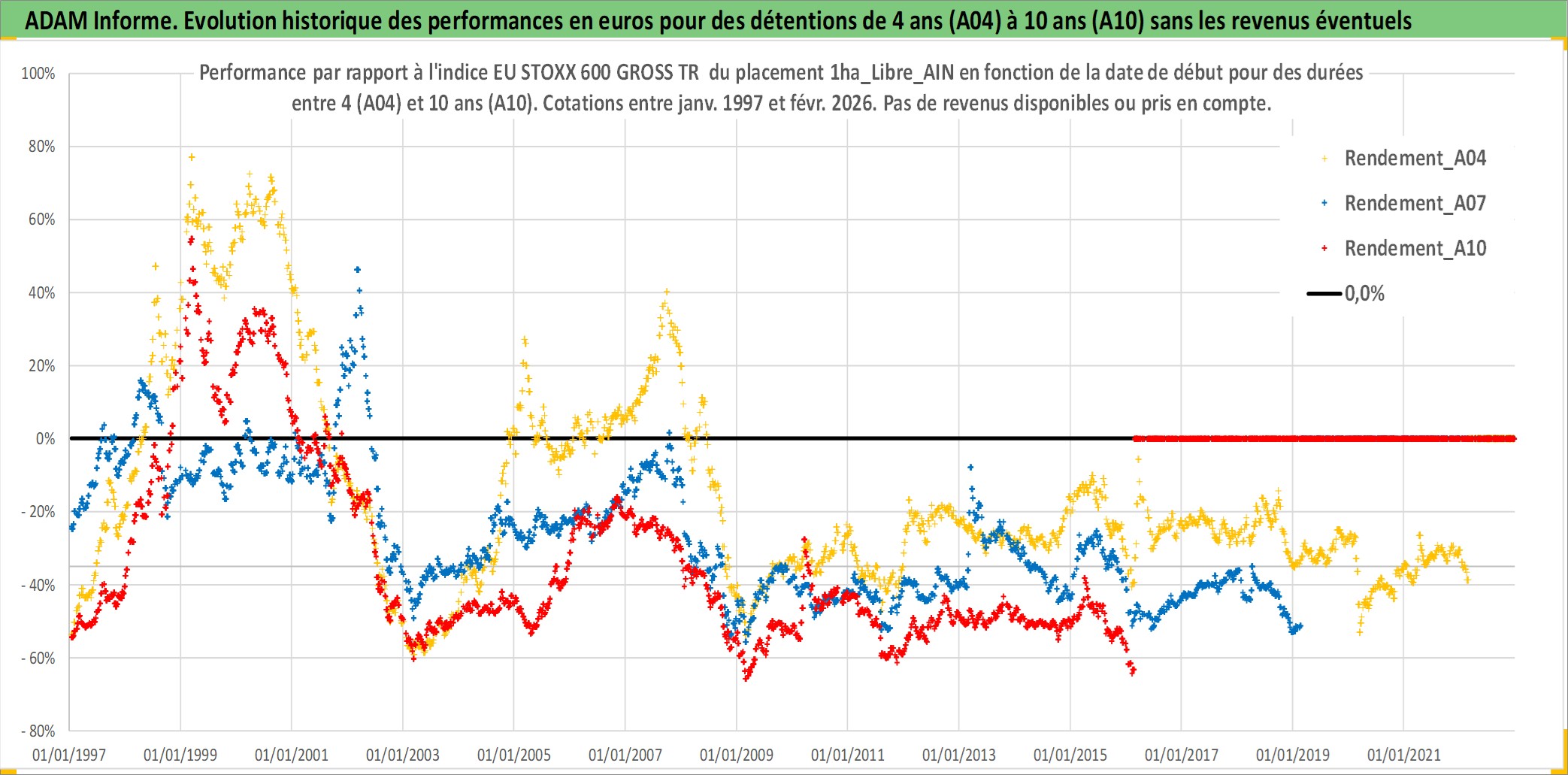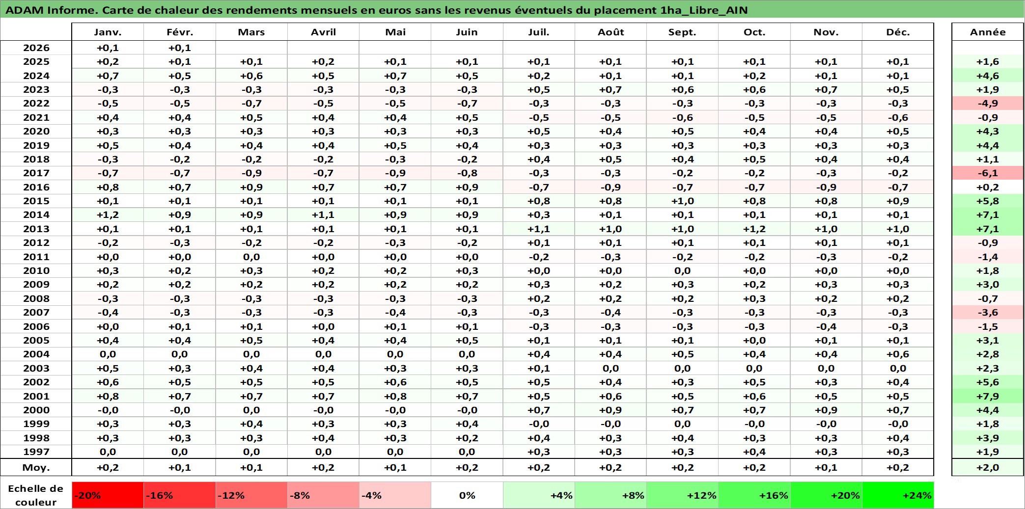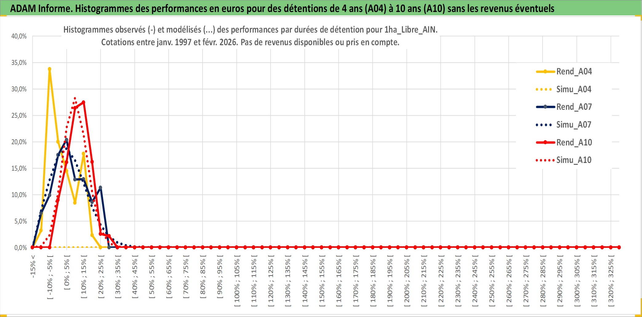 Site dédié aux investisseursPage dédiée sur site financeAnalyse des valorisations hebdomadaires de l'actif 1ha_Libre_AIN. Cet actif est cote en EUR. Les valorisations couvrent les semaines 1997W01 a 2026W09. Les fermages de ce bien foncier sont pris egaux a 2,5% annuels de la valeur venale du bien.