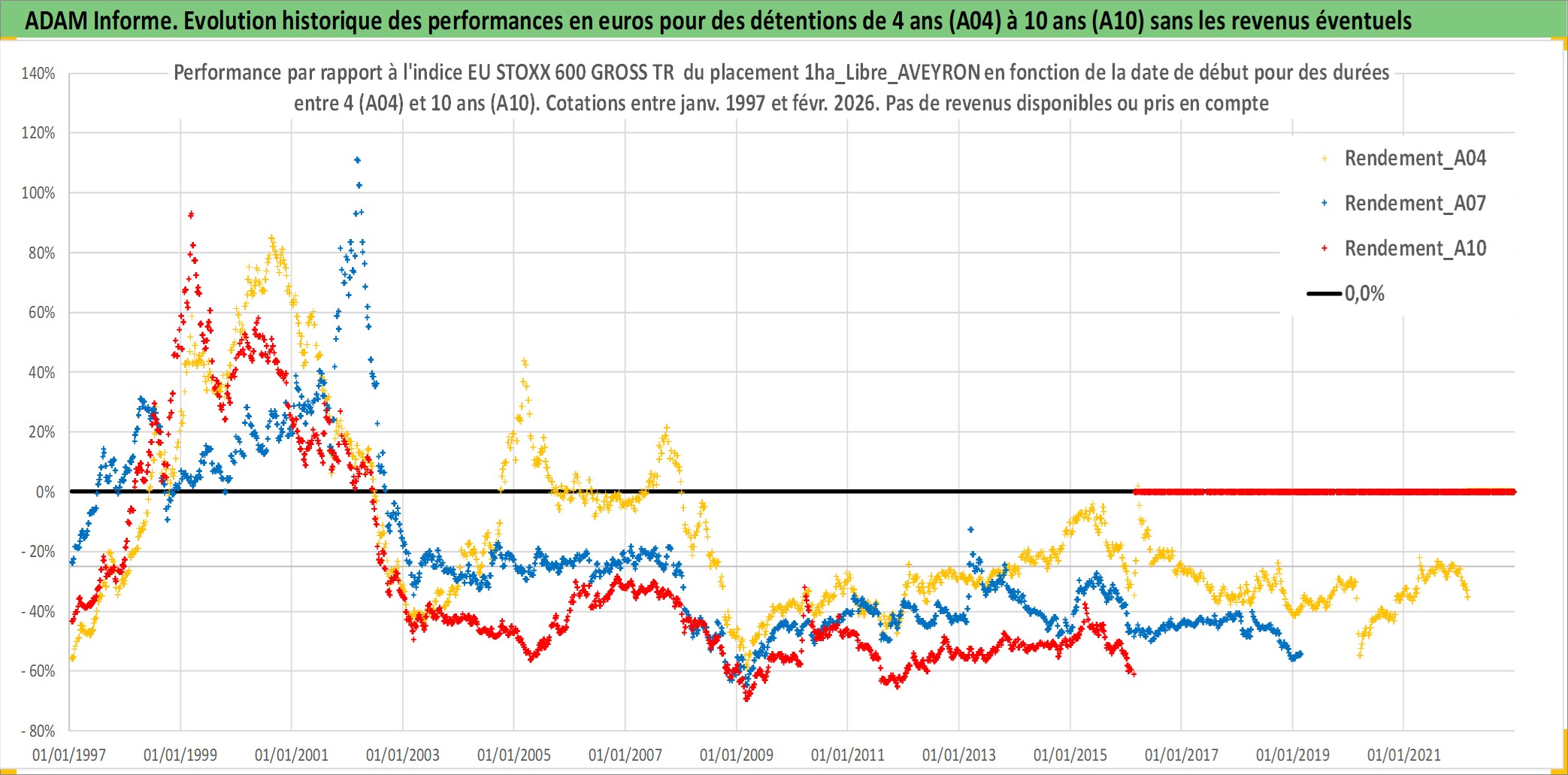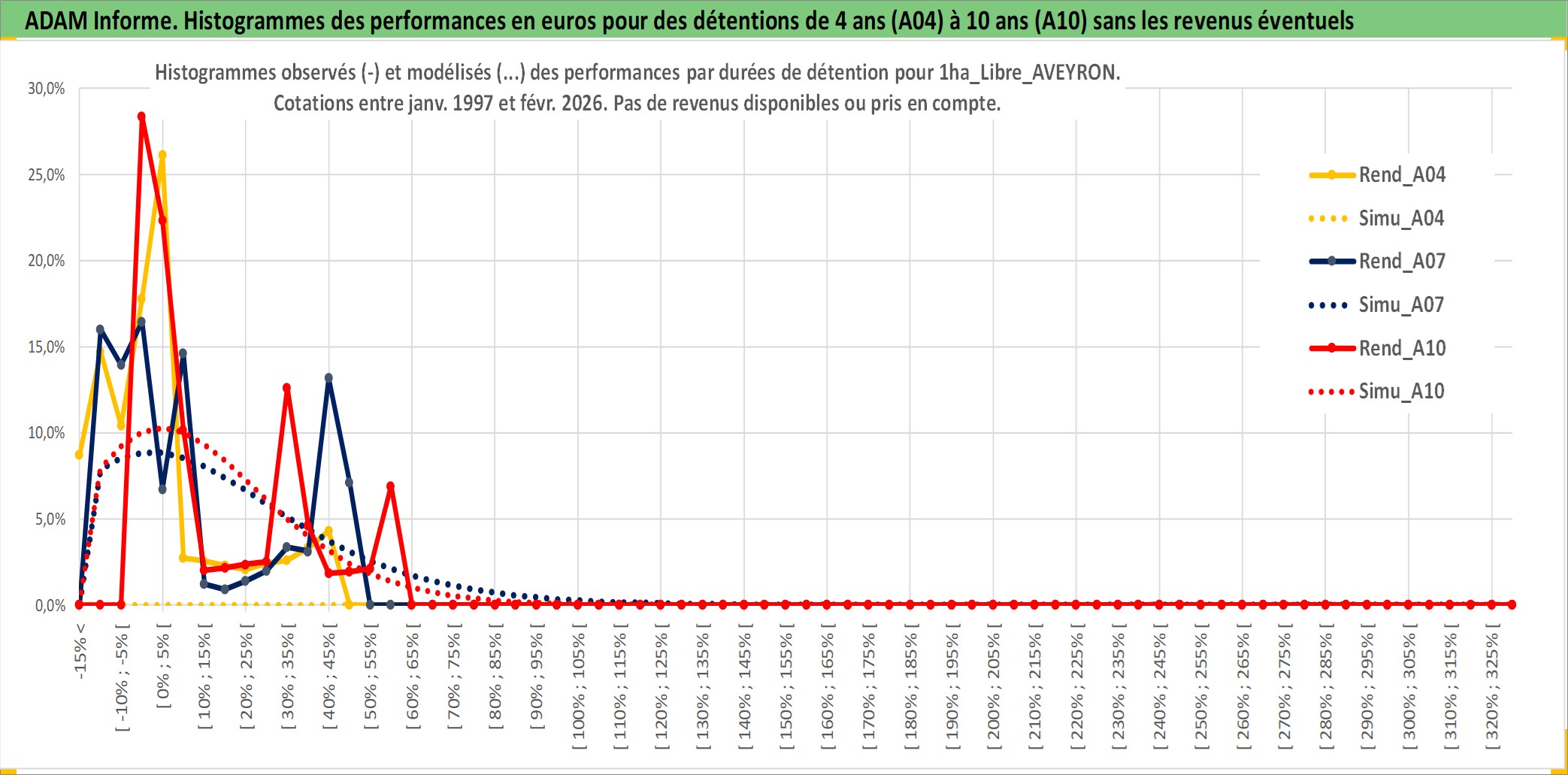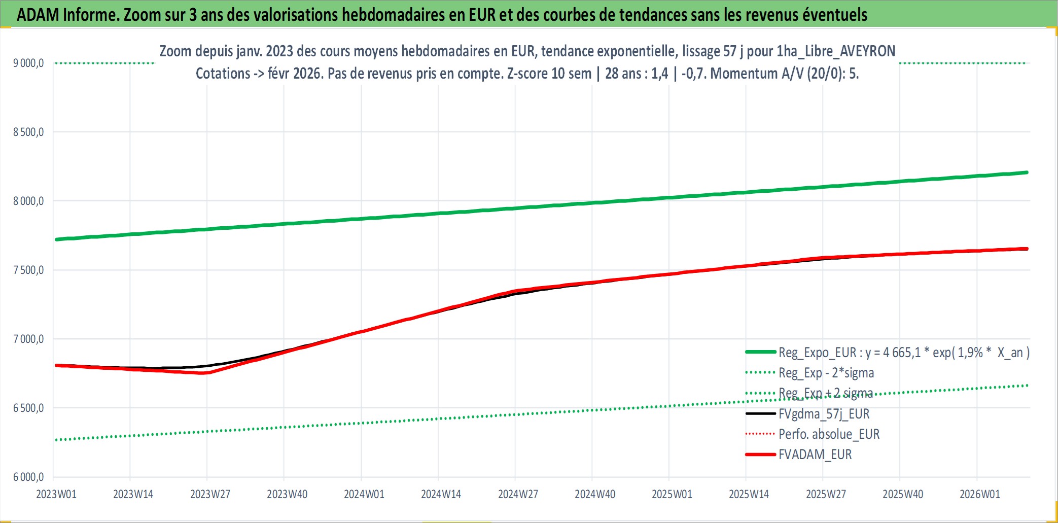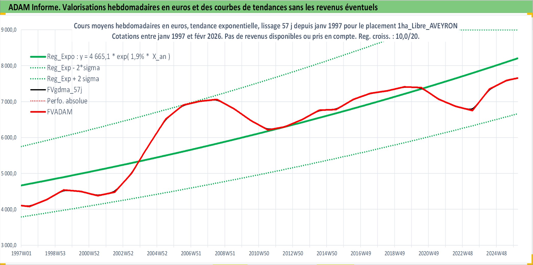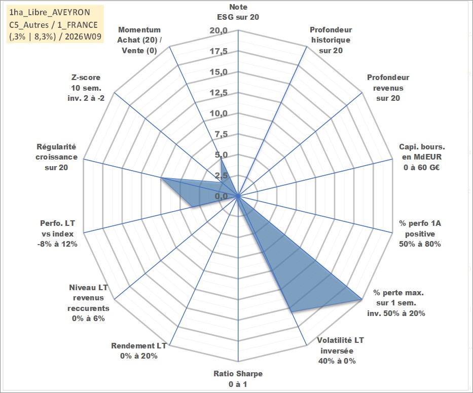Site dédié aux investisseursPage dédiée sur site financeAnalyse des valorisations hebdomadaires de l'actif 1ha_Libre_AVEYRON. Cet actif est cote en EUR. Les valorisations couvrent les semaines 1997W01 a 2026W09. Les fermages de ce bien foncier sont pris egaux a 2,5% annuels de la valeur venale du bien.