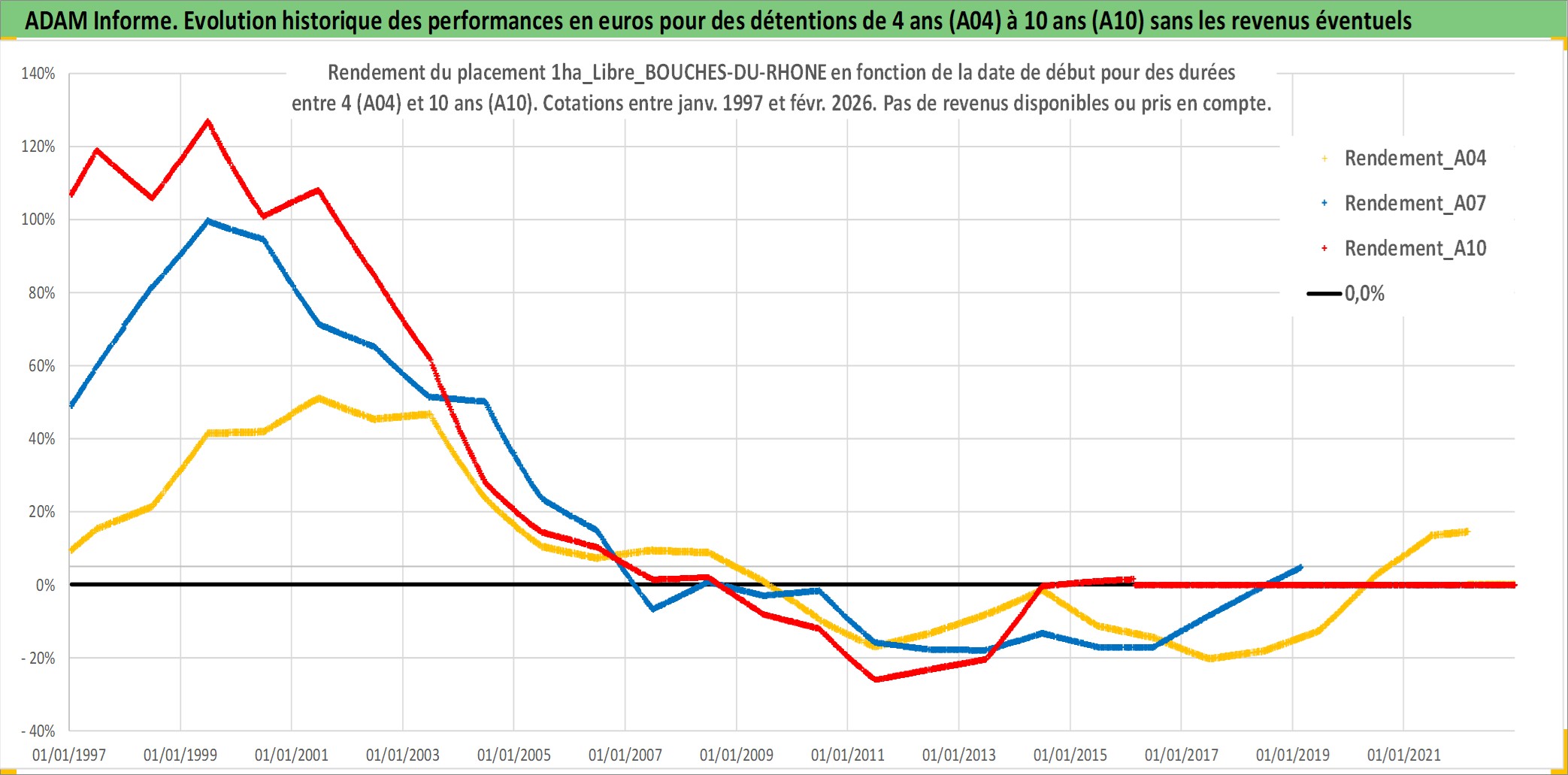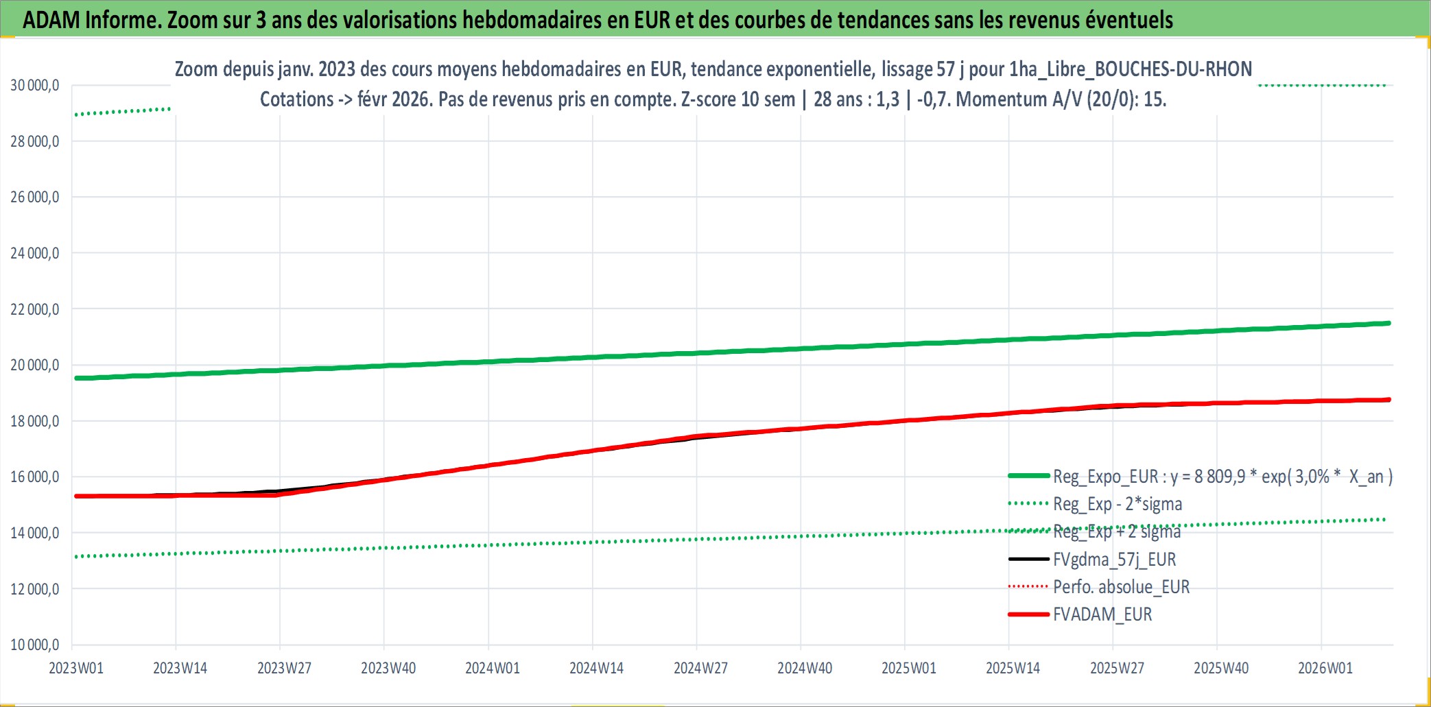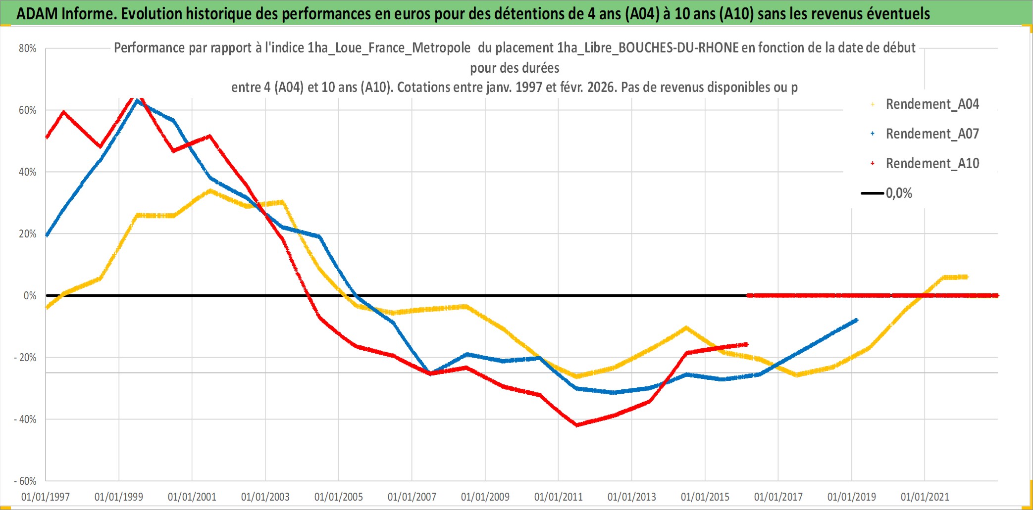 Site dédié aux investisseursPage dédiée sur site financeAnalyse des valorisations hebdomadaires de l'actif 1ha_Libre_BOUCHES-DU-RHONE. Cet actif est cote en EUR. Les valorisations couvrent les semaines 1997W01 a 2026W09. Les fermages de ce bien foncier sont pris egaux a 2,5% annuels de la valeur venale du bien.