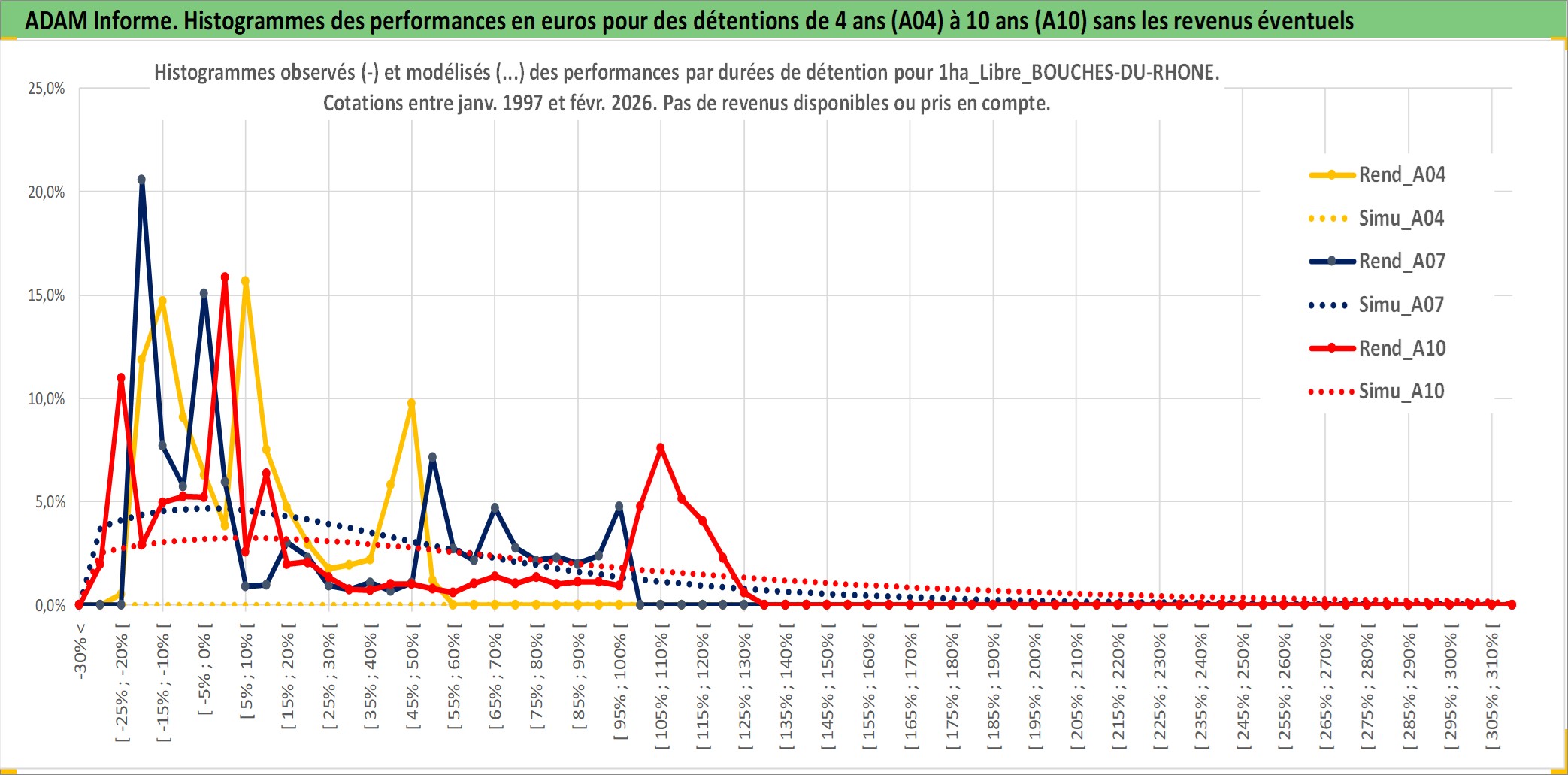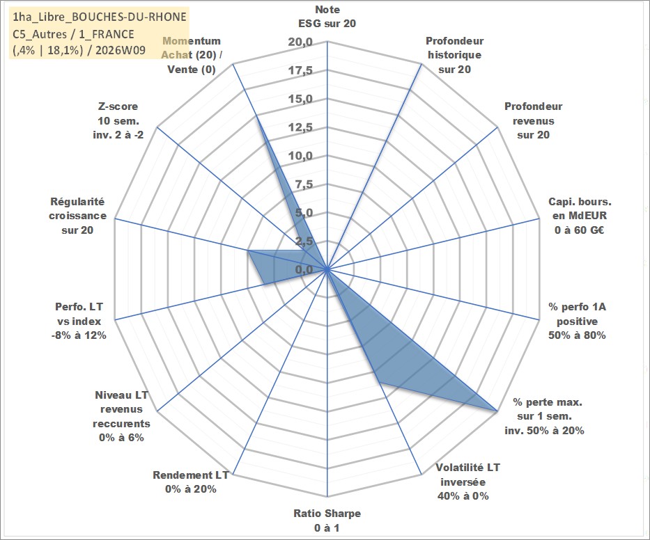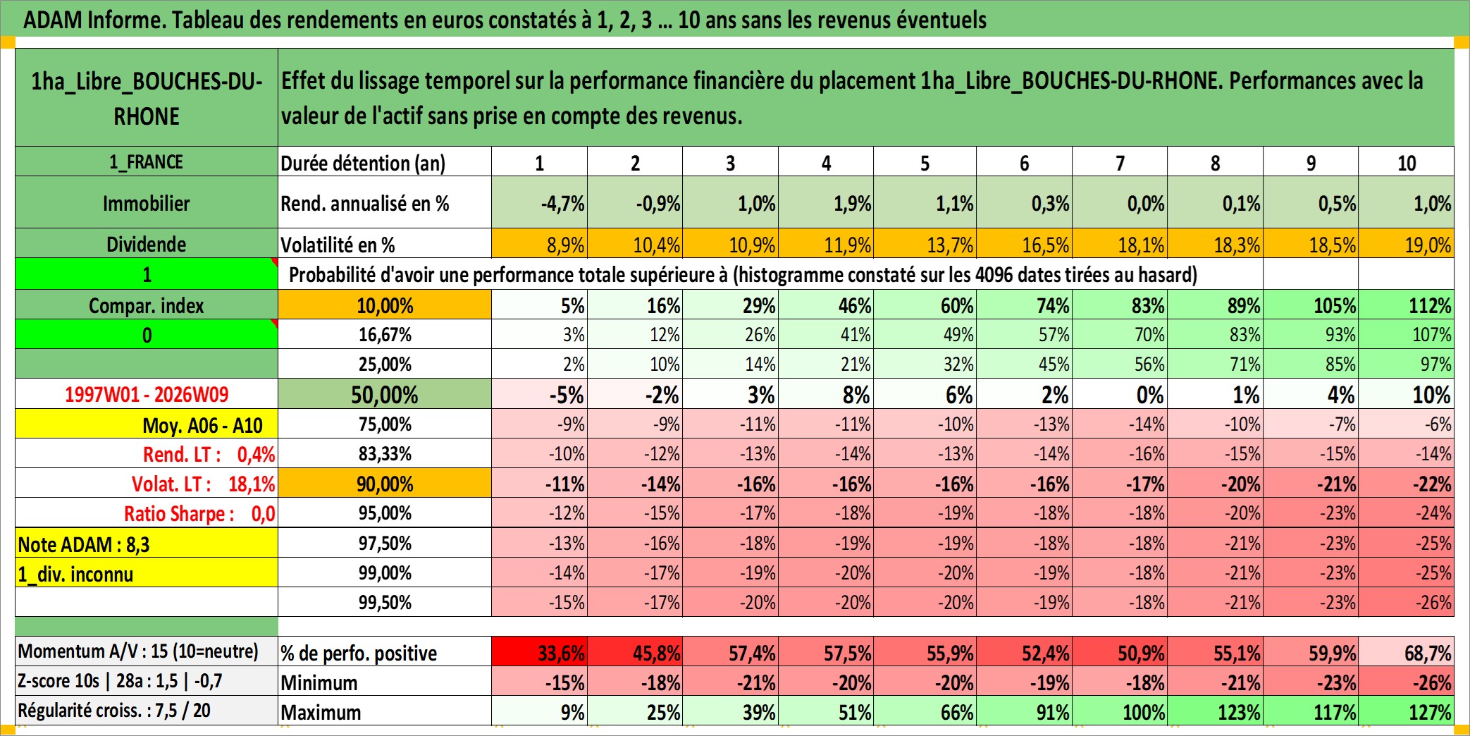 Site dédié aux investisseursPage dédiée sur site financeAnalyse des valorisations hebdomadaires de l'actif 1ha_Libre_BOUCHES-DU-RHONE. Cet actif est cote en EUR. Les valorisations couvrent les semaines 1997W01 a 2026W09. Les fermages de ce bien foncier sont pris egaux a 2,5% annuels de la valeur venale du bien.