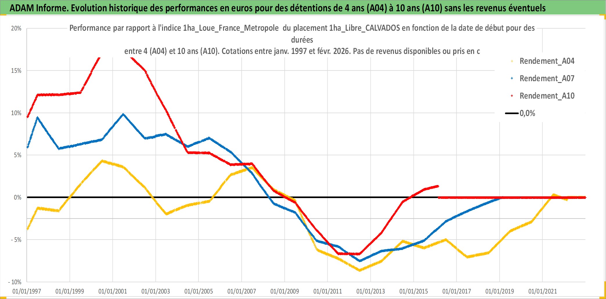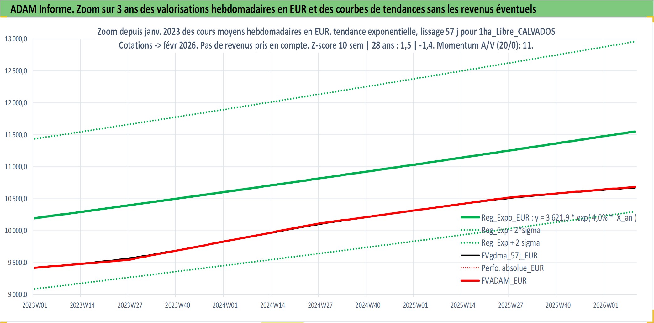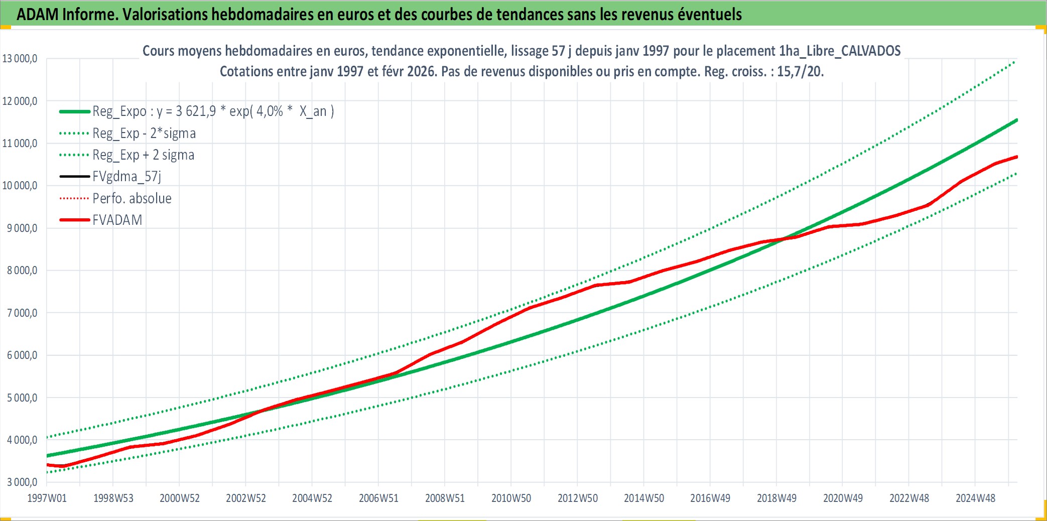 Site dédié aux investisseursPage dédiée sur site financeAnalyse des valorisations hebdomadaires de l'actif 1ha_Libre_CALVADOS. Cet actif est cote en EUR. Les valorisations couvrent les semaines 1997W01 a 2026W09. Les fermages de ce bien foncier sont pris egaux a 2,5% annuels de la valeur venale du bien.