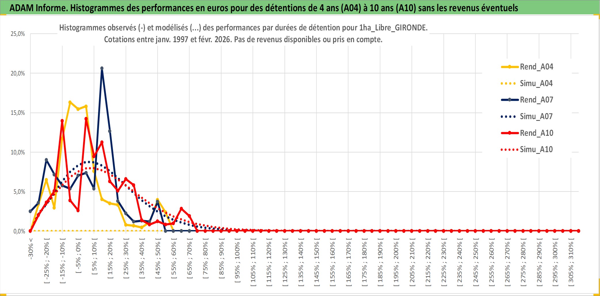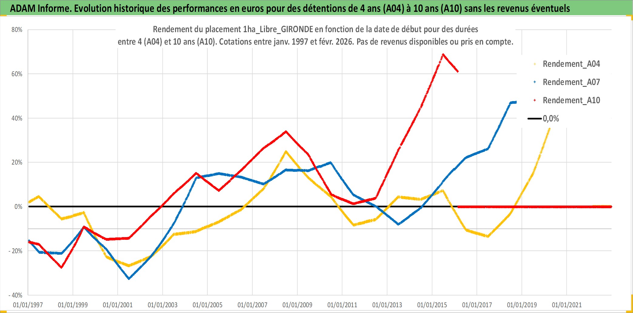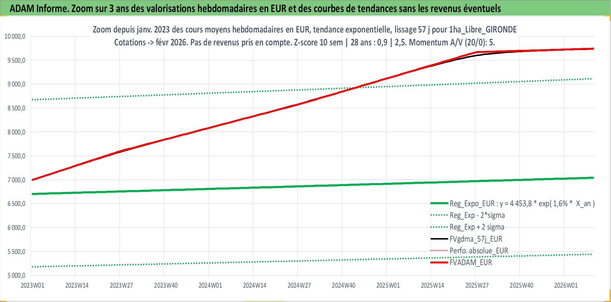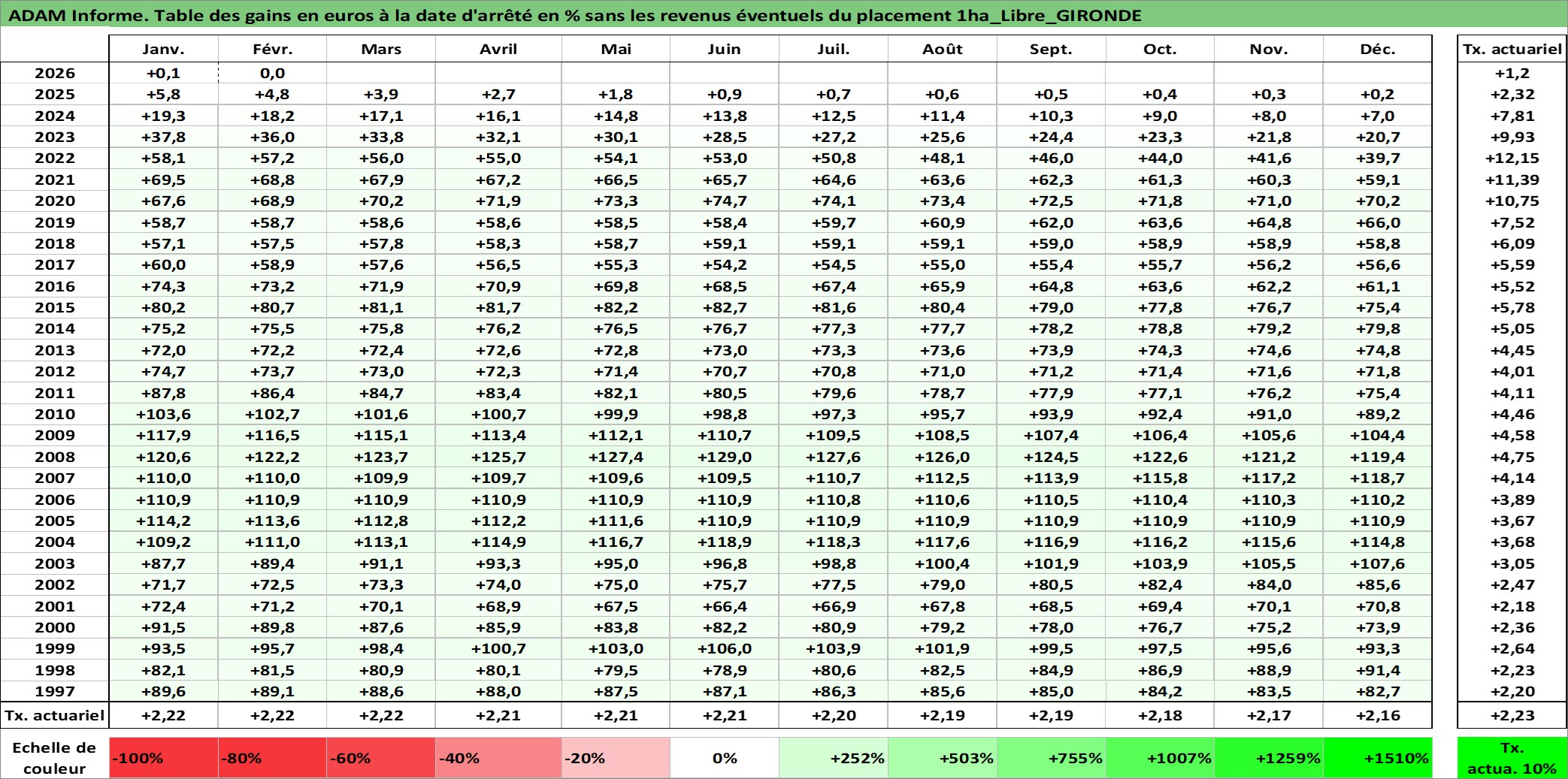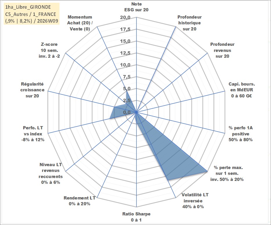 Site dédié aux investisseursPage dédiée sur site financeAnalyse des valorisations hebdomadaires de l'actif 1ha_Libre_GIRONDE. Cet actif est cote en EUR. Les valorisations couvrent les semaines 1997W01 a 2026W09. Les fermages de ce bien foncier sont pris egaux a 2,5% annuels de la valeur venale du bien.