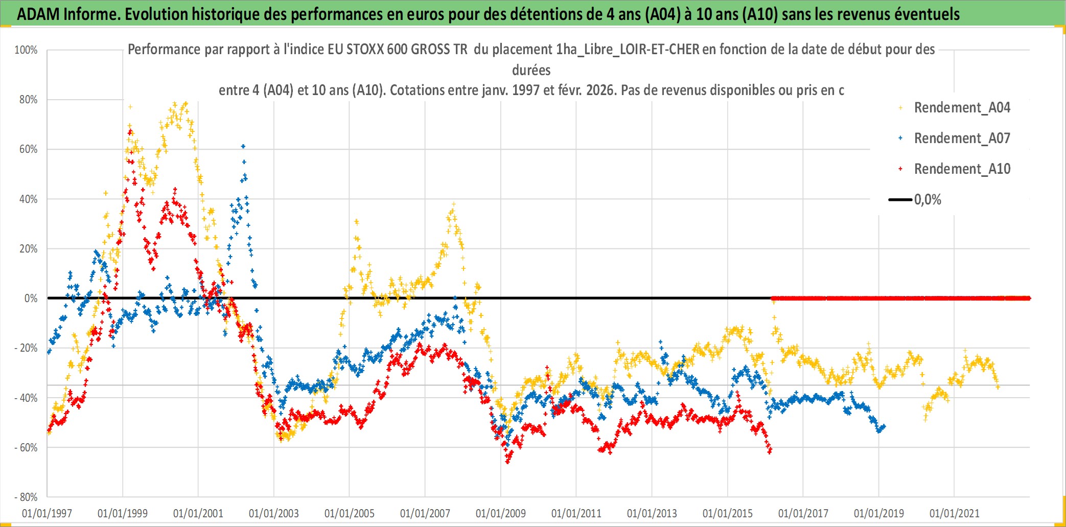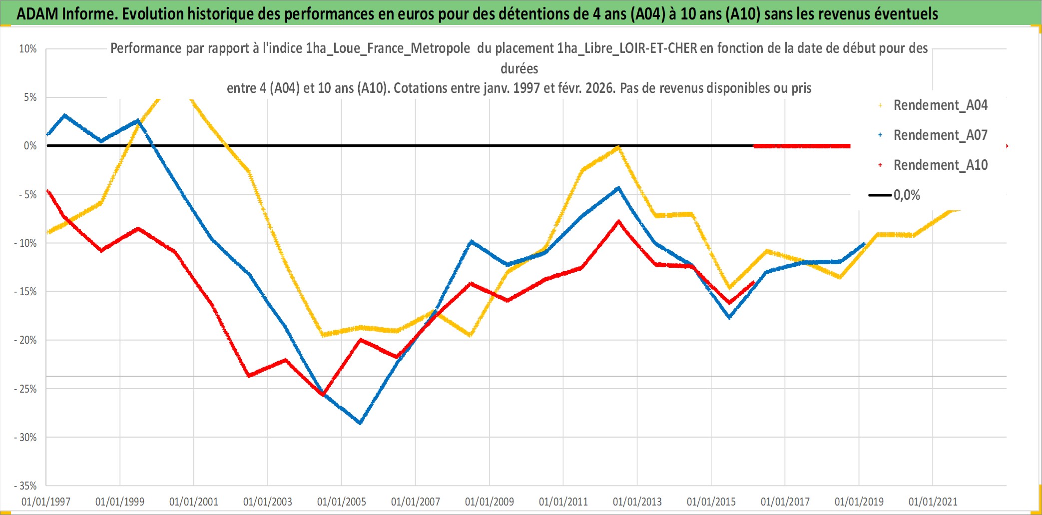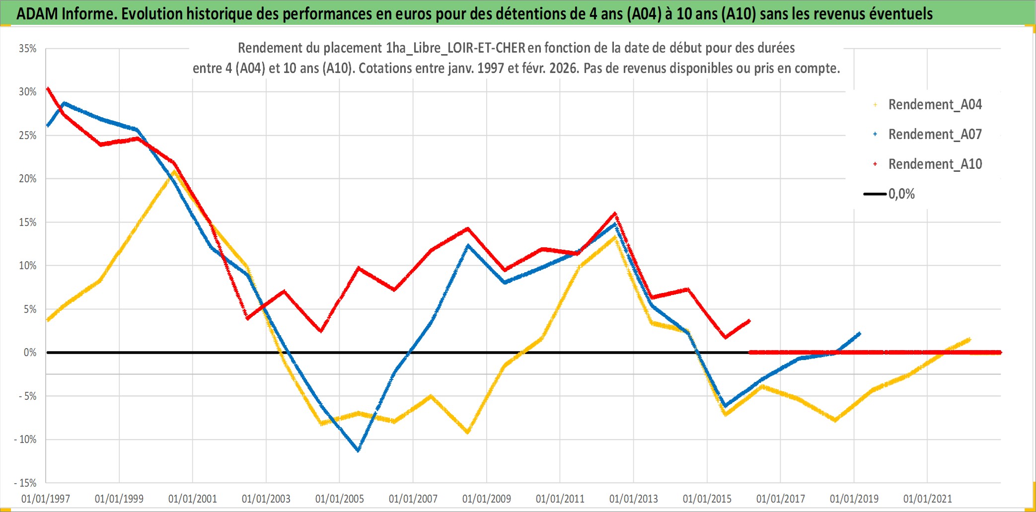 Site dédié aux investisseursPage dédiée sur site financeAnalyse des valorisations hebdomadaires de l'actif 1ha_Libre_LOIR-ET-CHER. Cet actif est cote en EUR. Les valorisations couvrent les semaines 1997W01 a 2026W09. Les fermages de ce bien foncier sont pris egaux a 2,5% annuels de la valeur venale du bien.