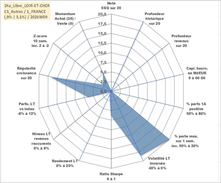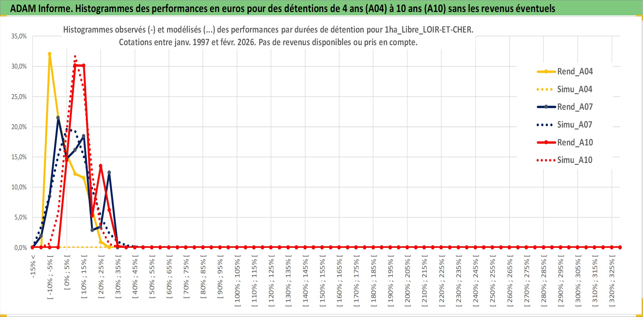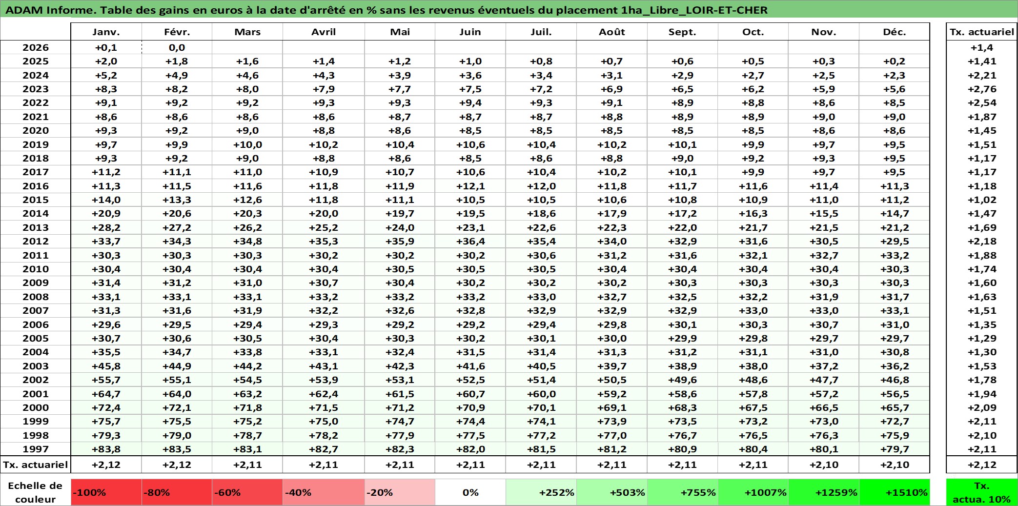Site dédié aux investisseursPage dédiée sur site financeAnalyse des valorisations hebdomadaires de l'actif 1ha_Libre_LOIR-ET-CHER. Cet actif est cote en EUR. Les valorisations couvrent les semaines 1997W01 a 2026W09. Les fermages de ce bien foncier sont pris egaux a 2,5% annuels de la valeur venale du bien.