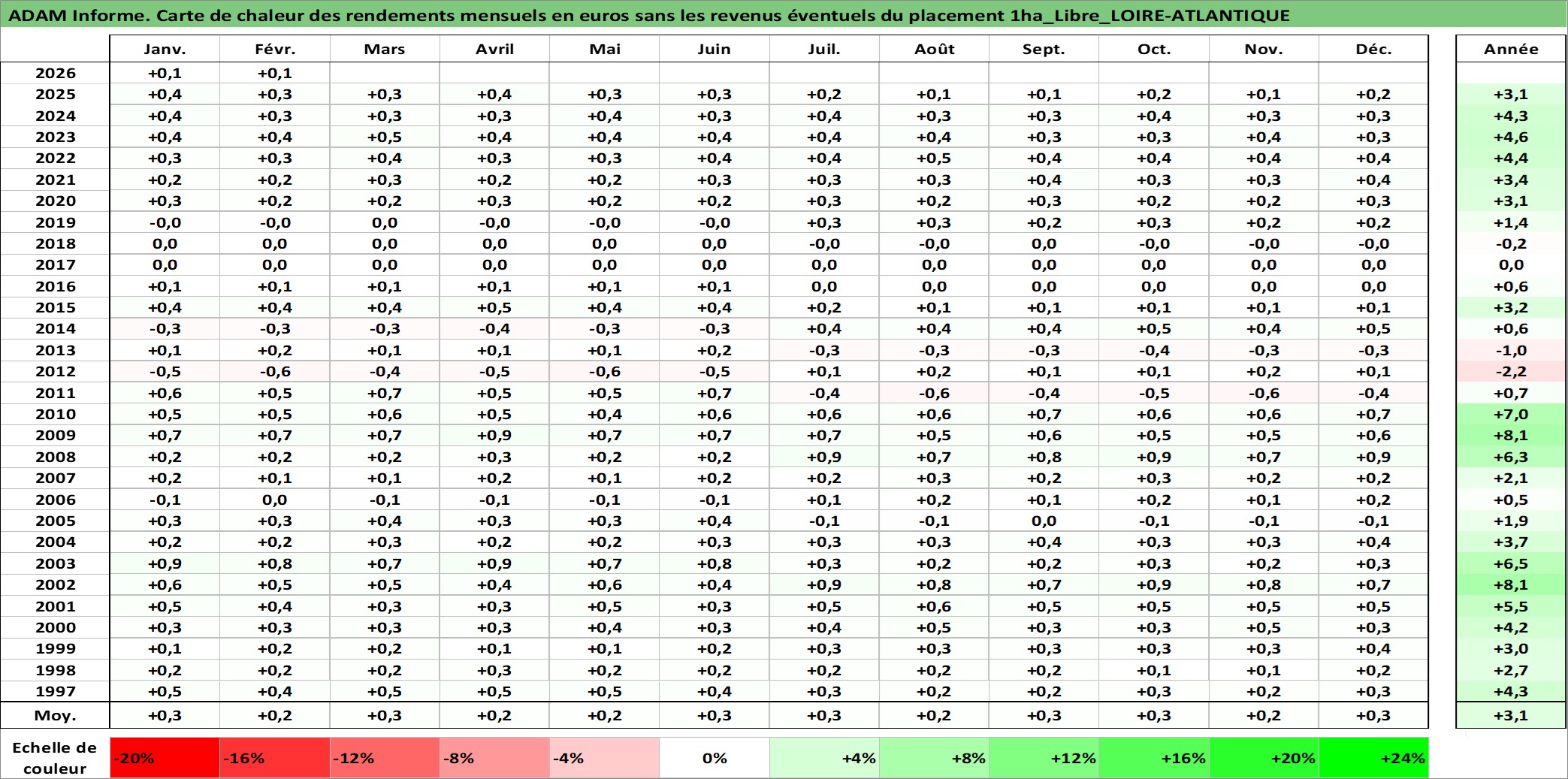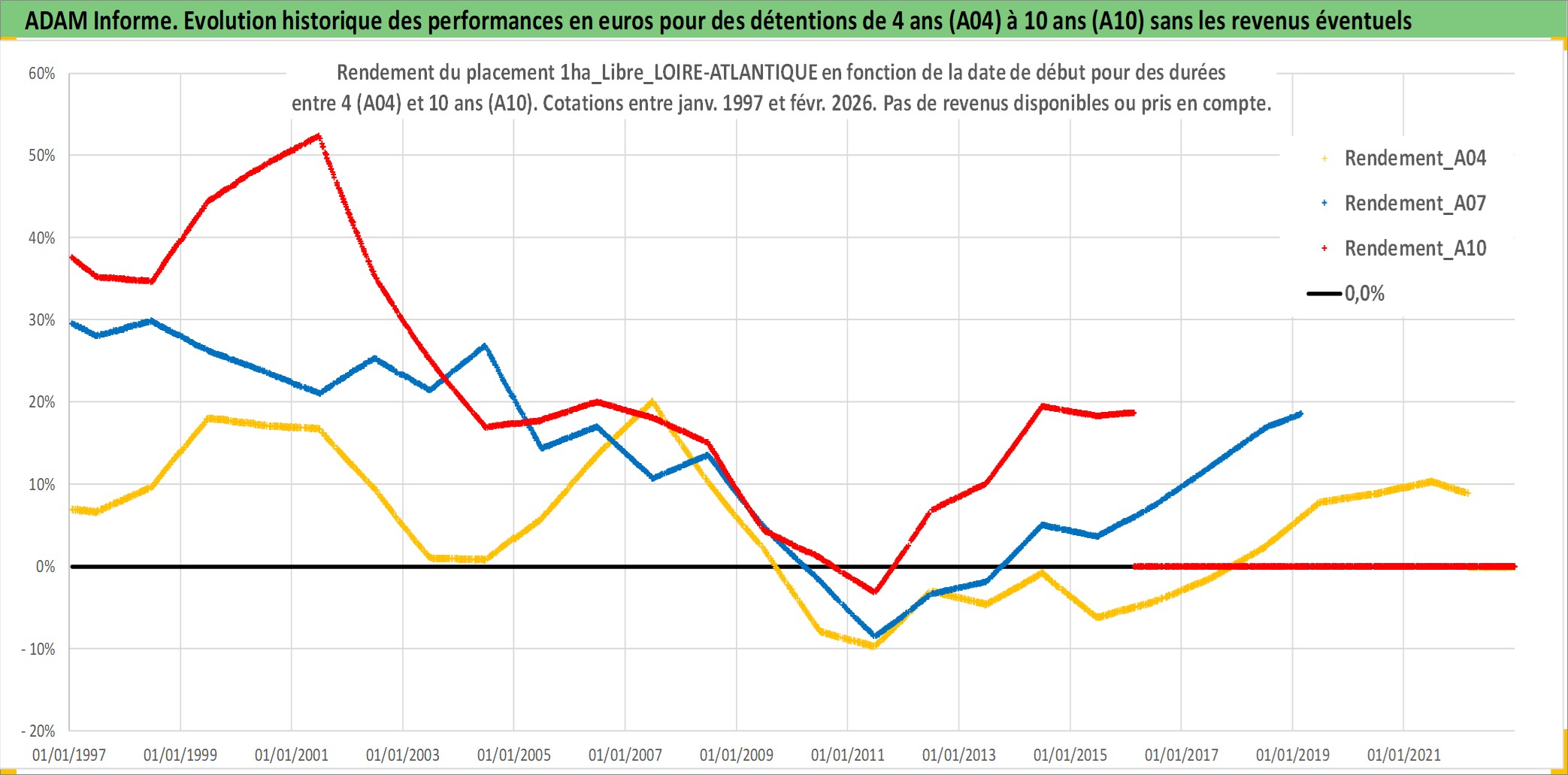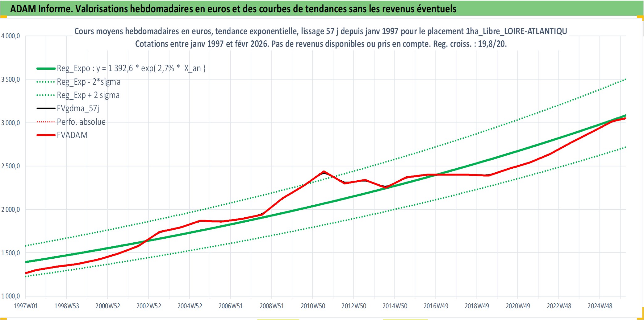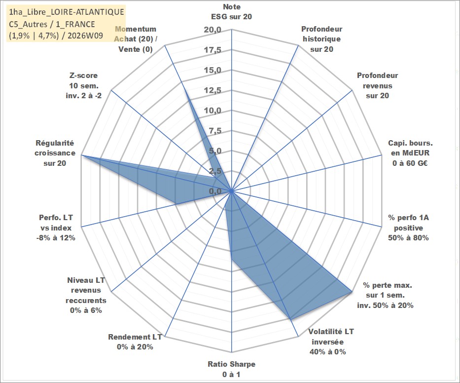 Site dédié aux investisseursPage dédiée sur site financeAnalyse des valorisations hebdomadaires de l'actif 1ha_Libre_LOIRE-ATLANTIQUE. Cet actif est cote en EUR. Les valorisations couvrent les semaines 1997W01 a 2026W09. Les fermages de ce bien foncier sont pris egaux a 2,5% annuels de la valeur venale du bien.