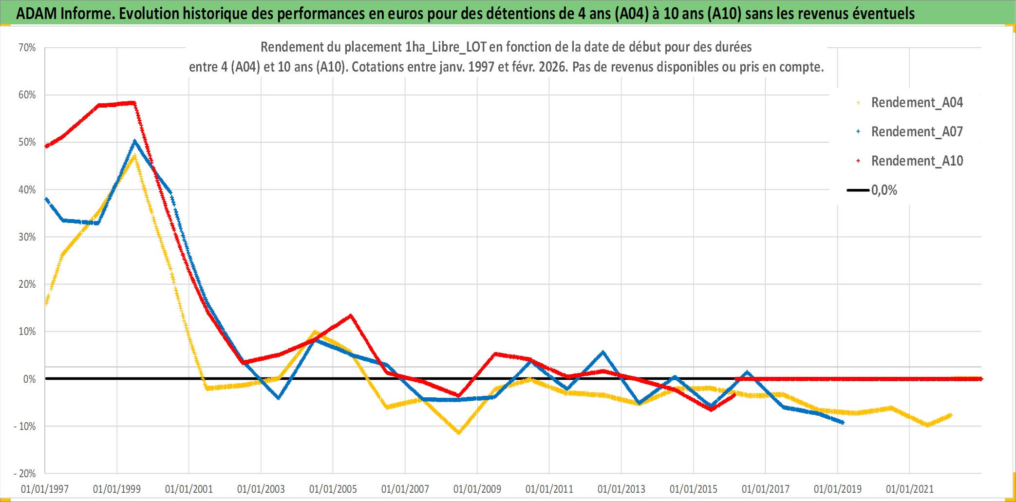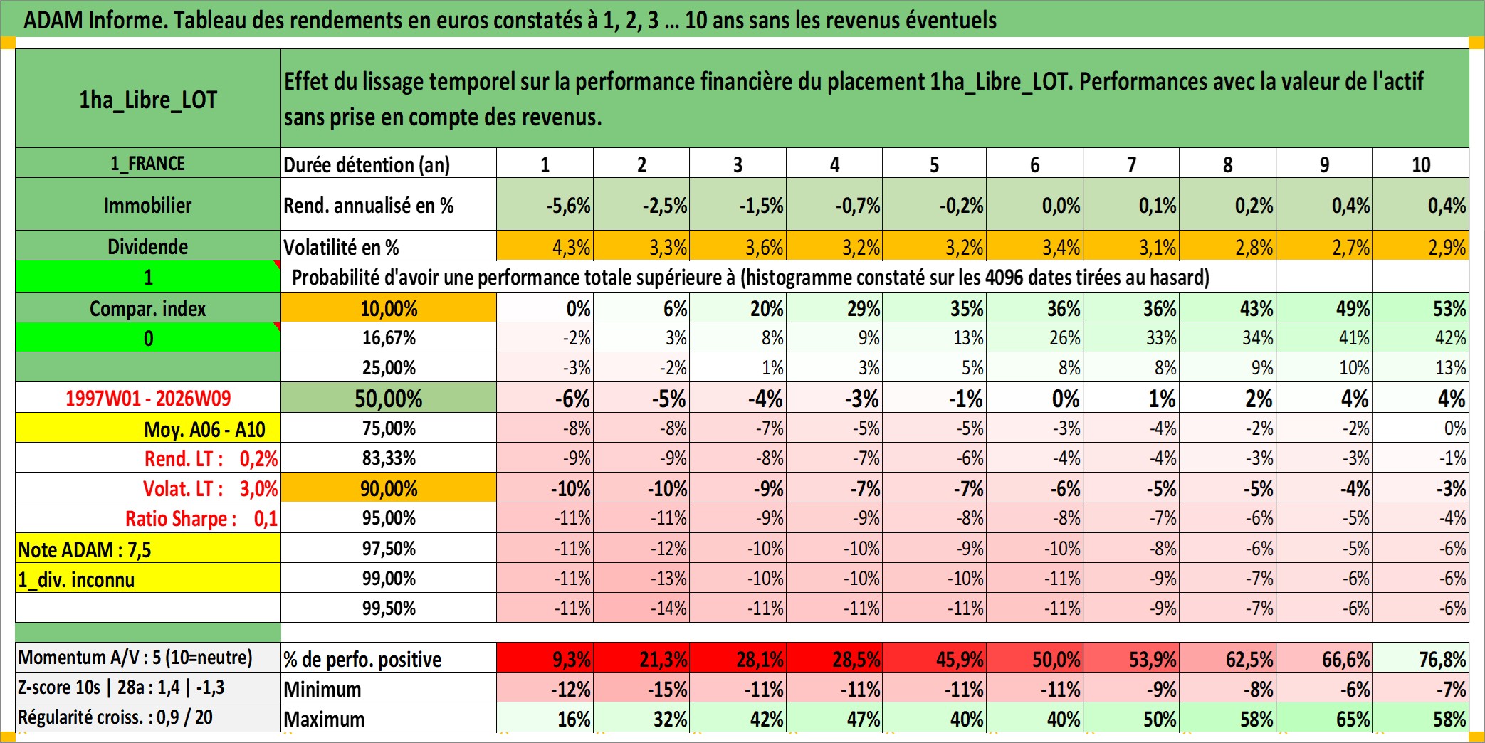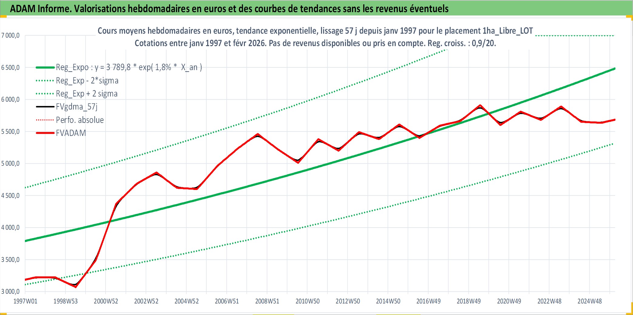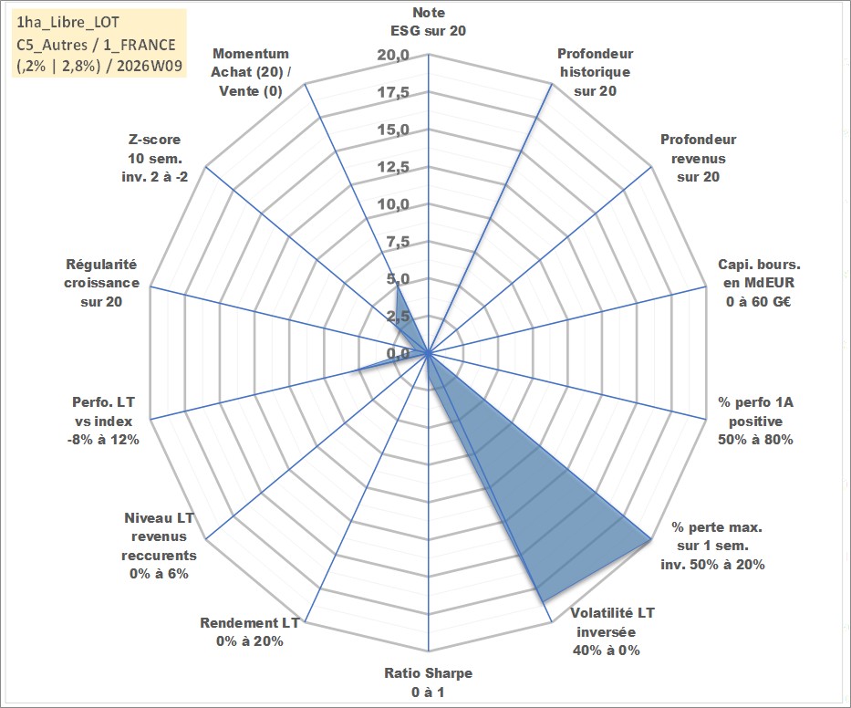 Site dédié aux investisseursPage dédiée sur site financeAnalyse des valorisations hebdomadaires de l'actif 1ha_Libre_LOT. Cet actif est cote en EUR. Les valorisations couvrent les semaines 1997W01 a 2026W09. Les fermages de ce bien foncier sont pris egaux a 2,5% annuels de la valeur venale du bien.